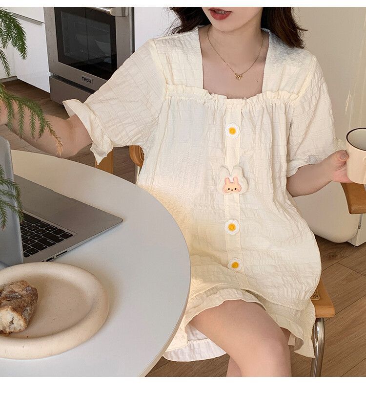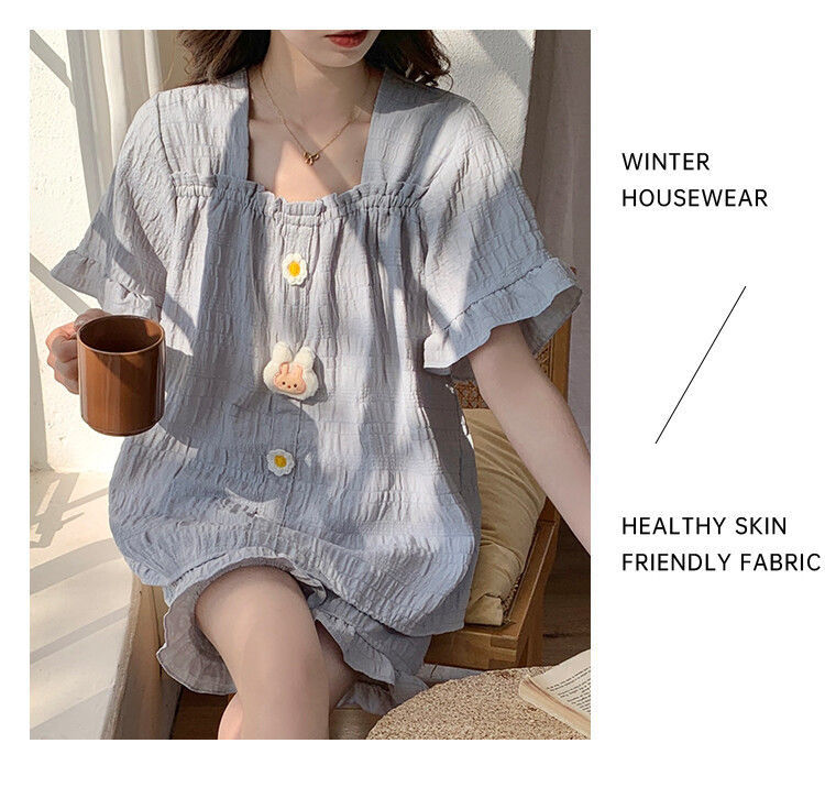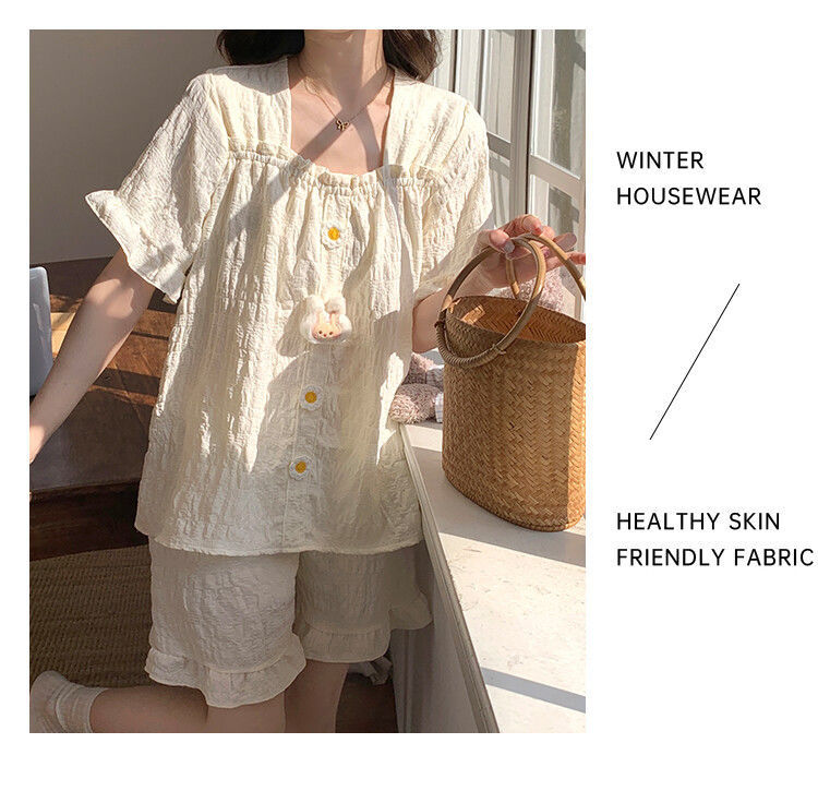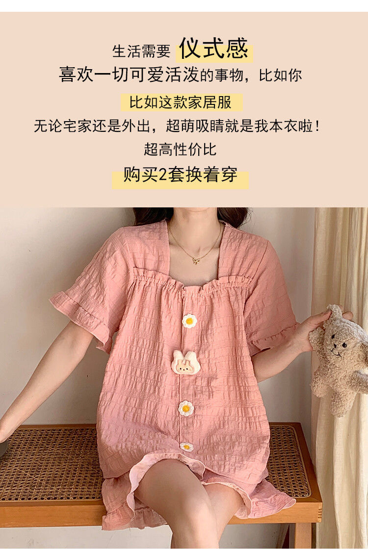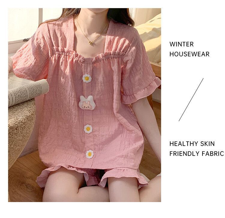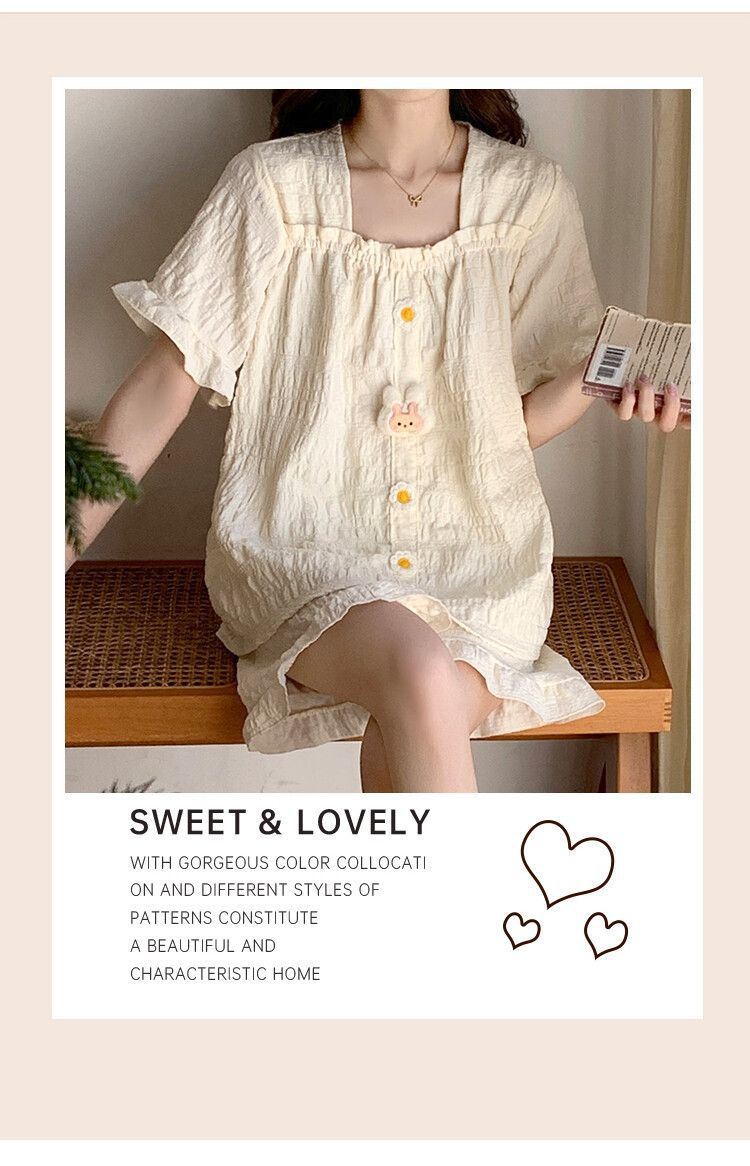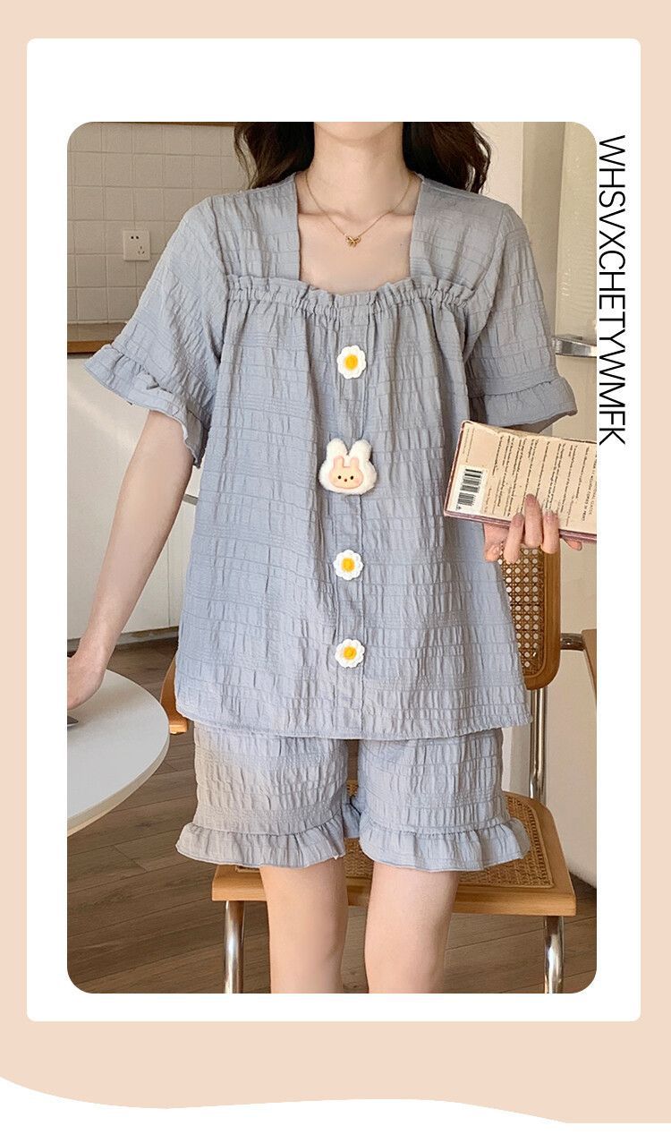 여성용 가슴 패드가있는 잠옷 여름 반팔 클라우드 코튼 스위트 플라워 한국 스타일 공주 스타일 학생 홈웨어 투피스 세트스토어 가기
