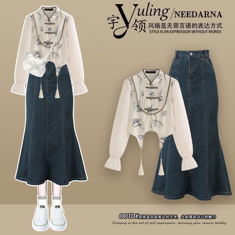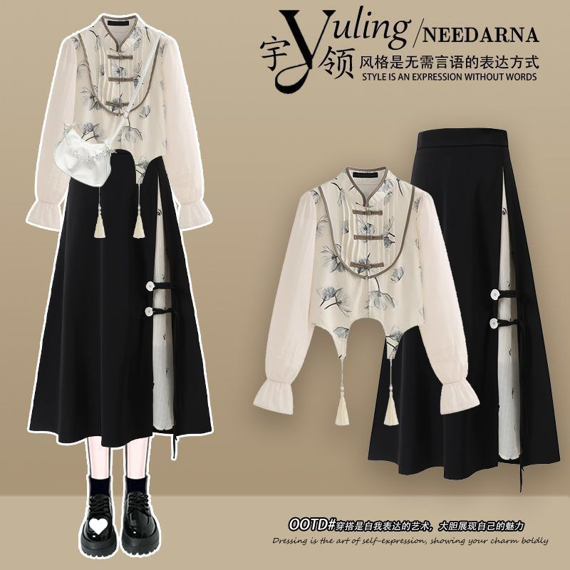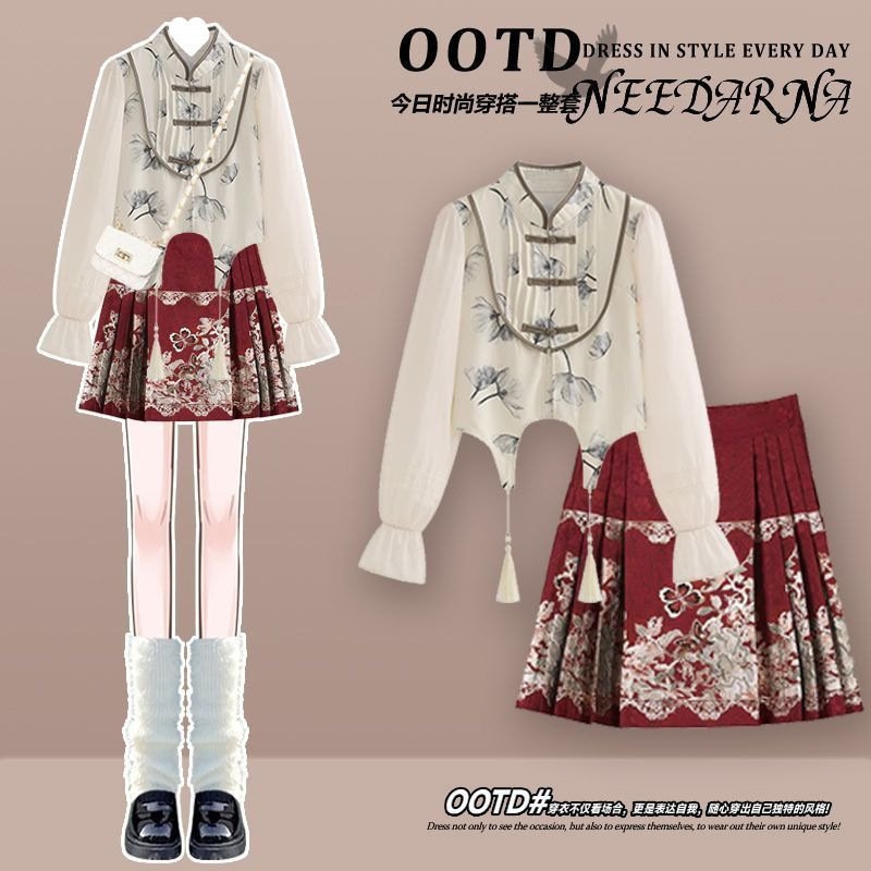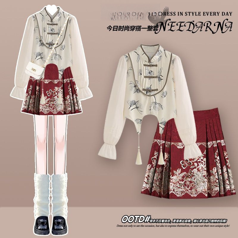 여성을 위한 새로운 중국 스타일 의류 세트 2025 새로운 스타일의 봄 의류 중국 스타일 Hanfu 탑과 말 얼굴 스커트 슈트