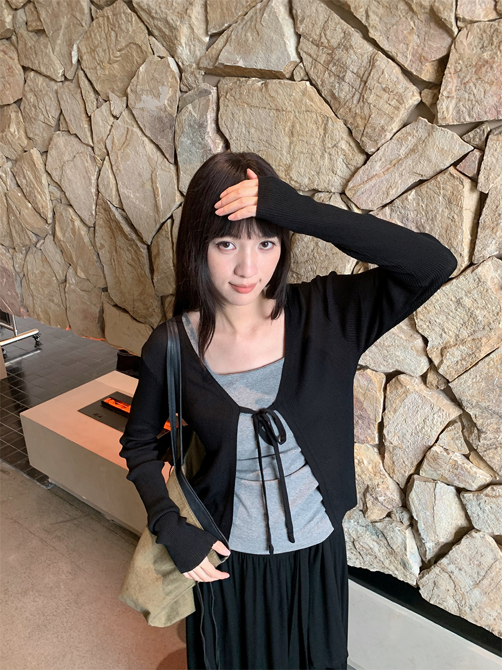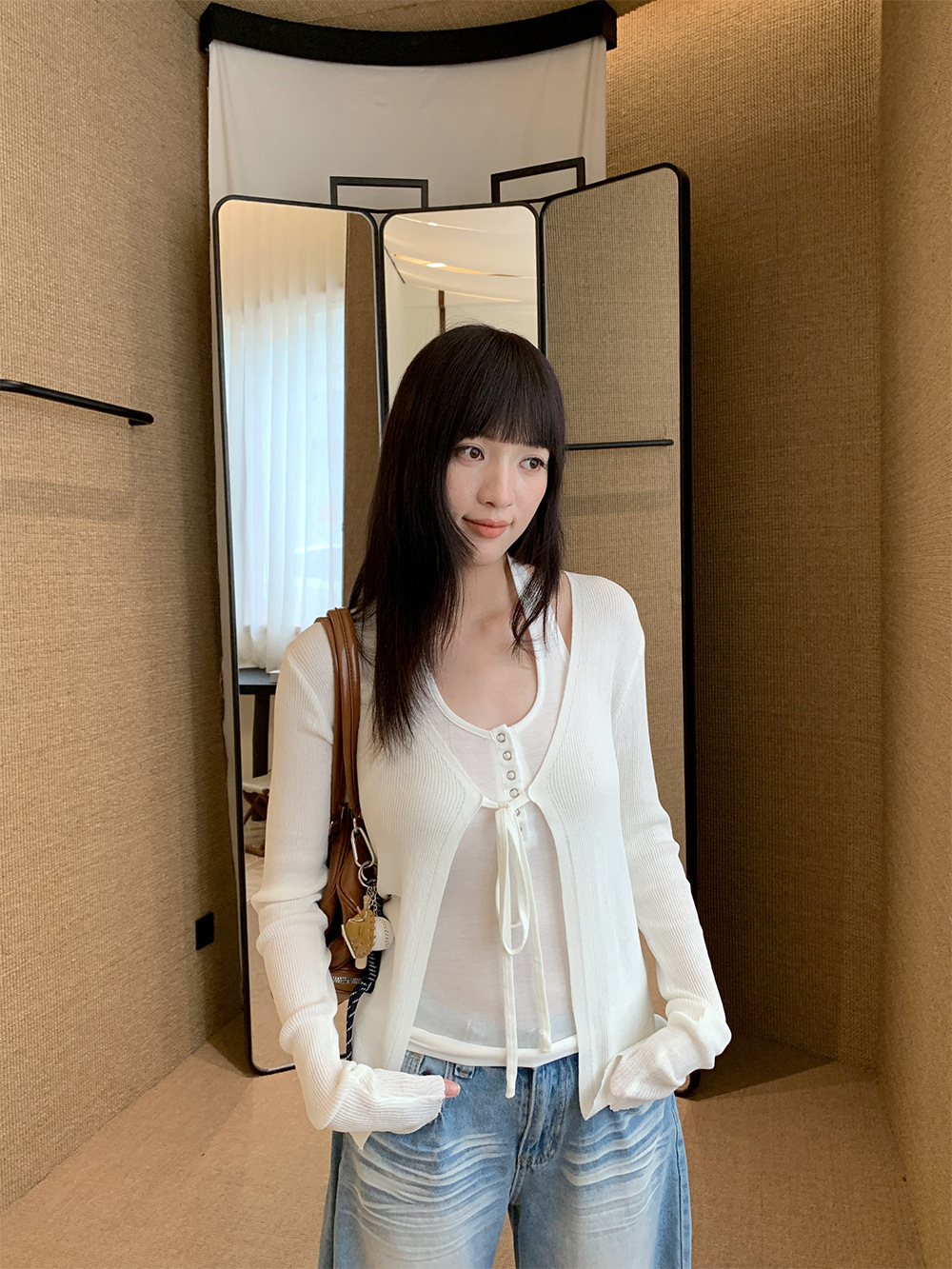 Yuyi 신상 2025 여름 한국 스타일 레이스 업 니트 가디건 여성스러운 긴팔 탑 여성 m11355