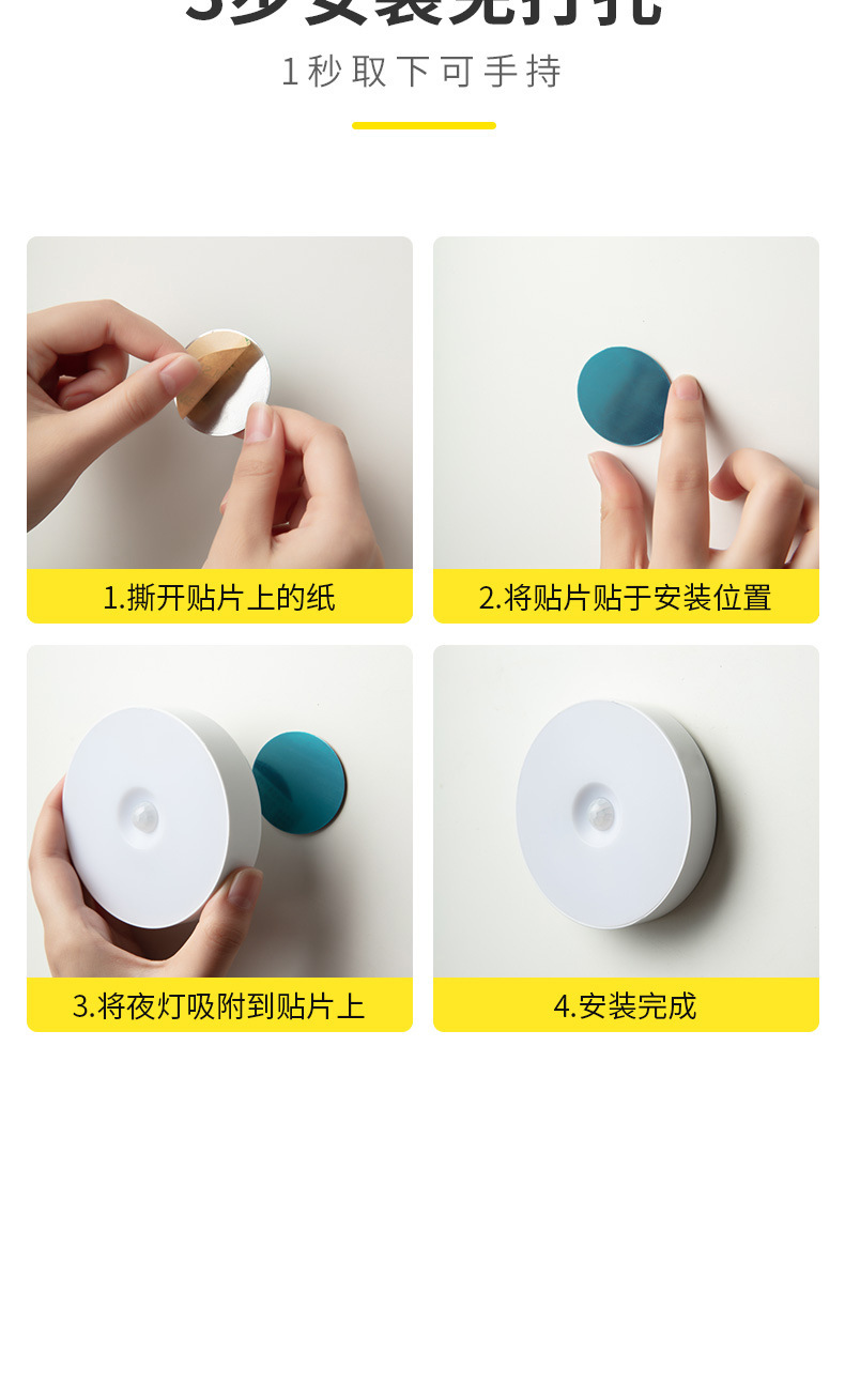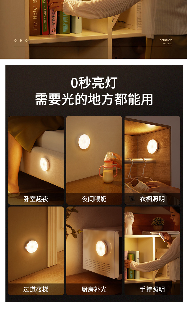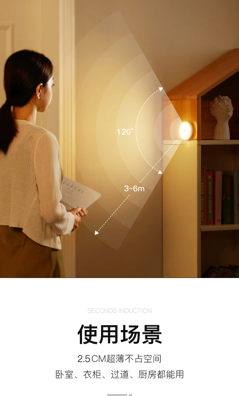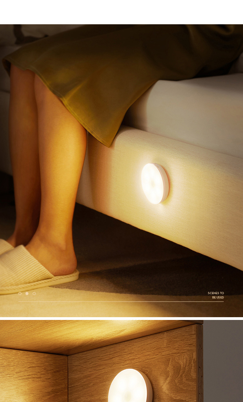 Led 인체 유도 야간 조명 스마트 무선 자기 원형 센서 램프 캐비닛 계단 통로 충전식 벽 램프스토어 가기