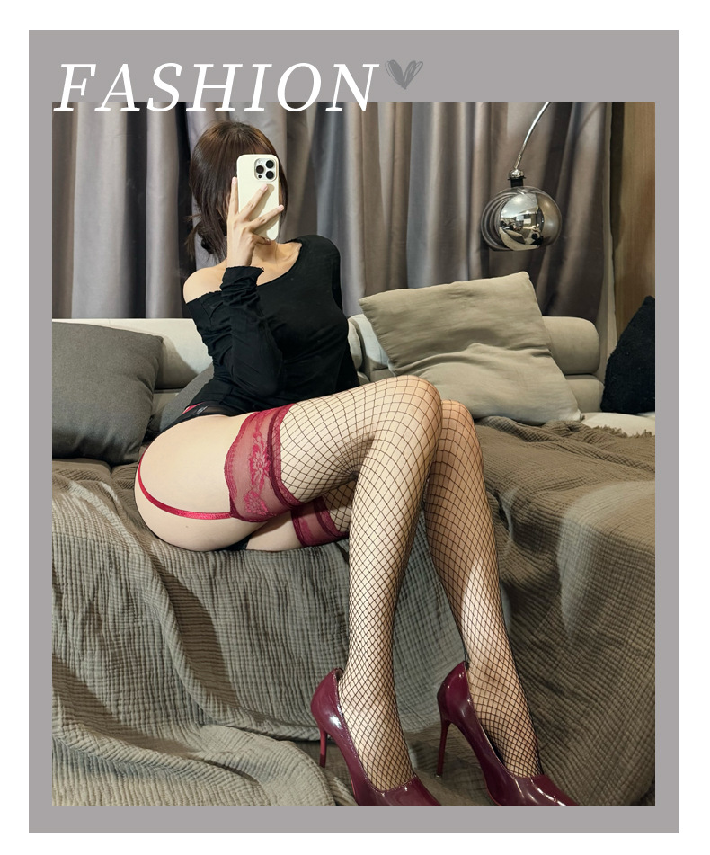 섹시한 신상 서스펜더 레이스 스타킹, 블랙 실크, 대비되는 레드 엣지 스타킹, 무릎 위 올인원 스타킹, 순수한 욕망 메쉬 스타킹스토어 가기