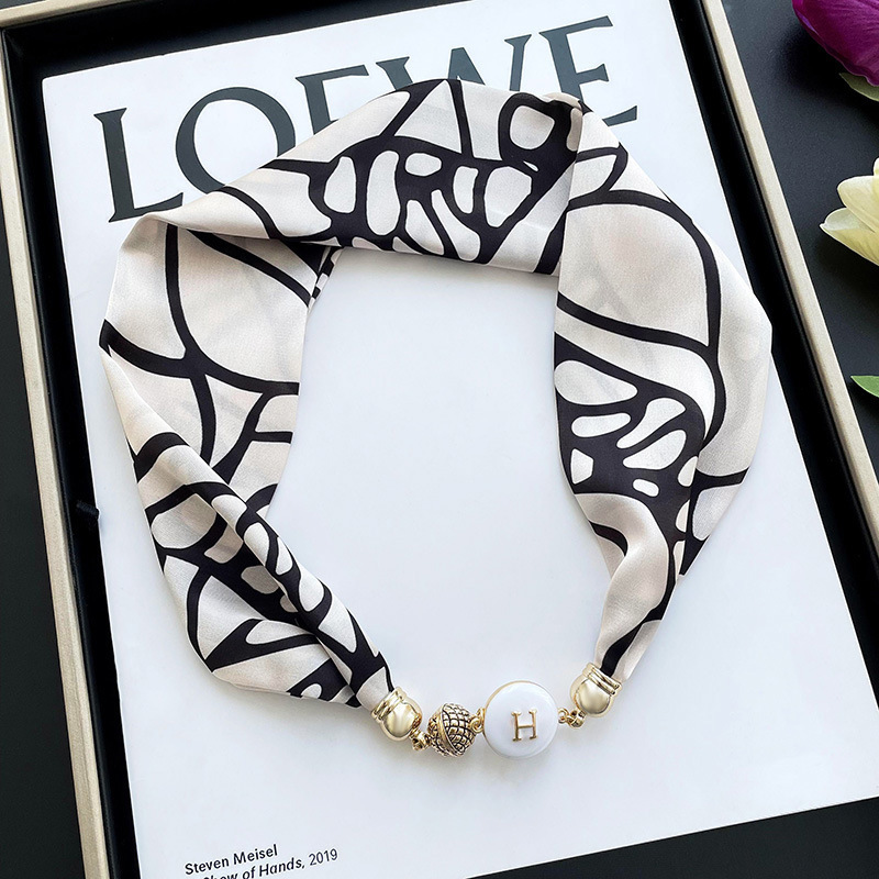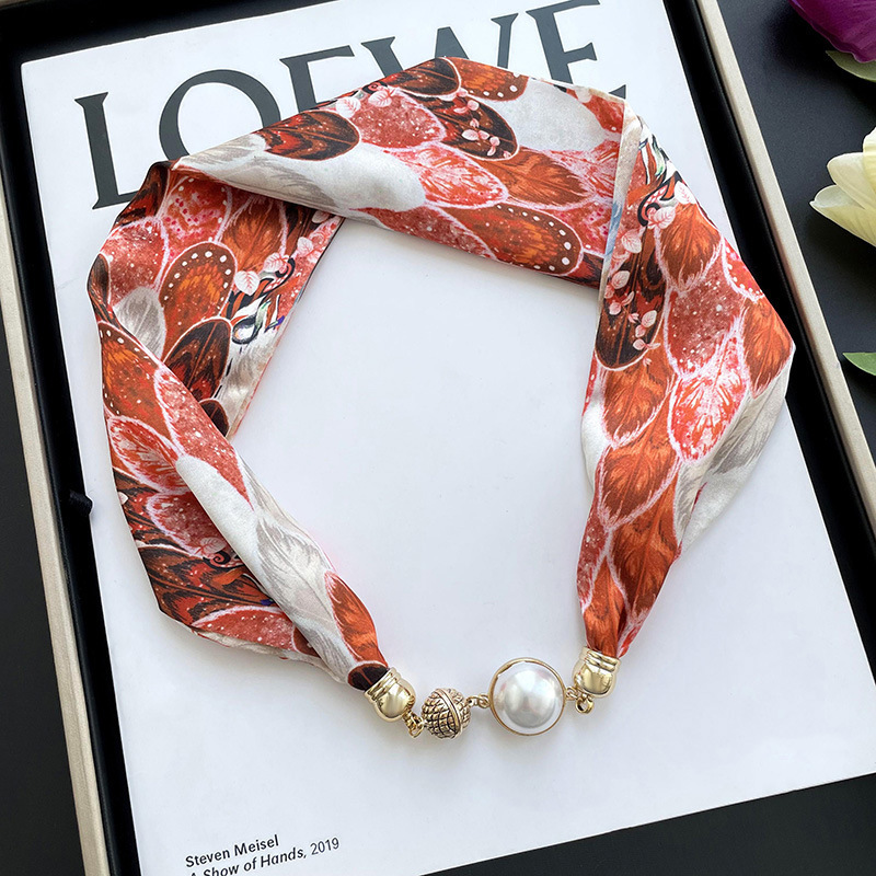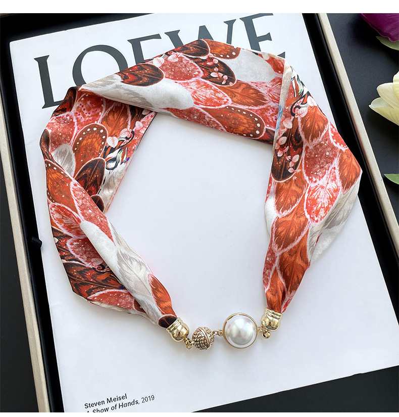 봄, 가을 여성용 게으른 자석 버클 실크 스카프 얇은 목 보호대 자석 버클 실크 스카프 긴 작은 칼라 다용도 진주 목걸이