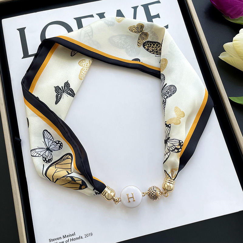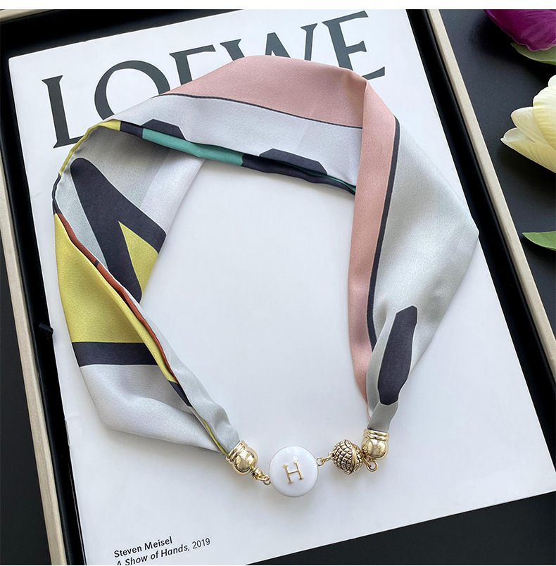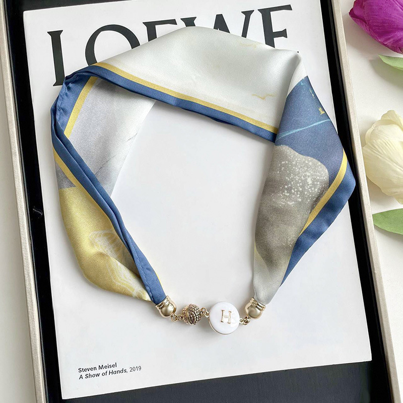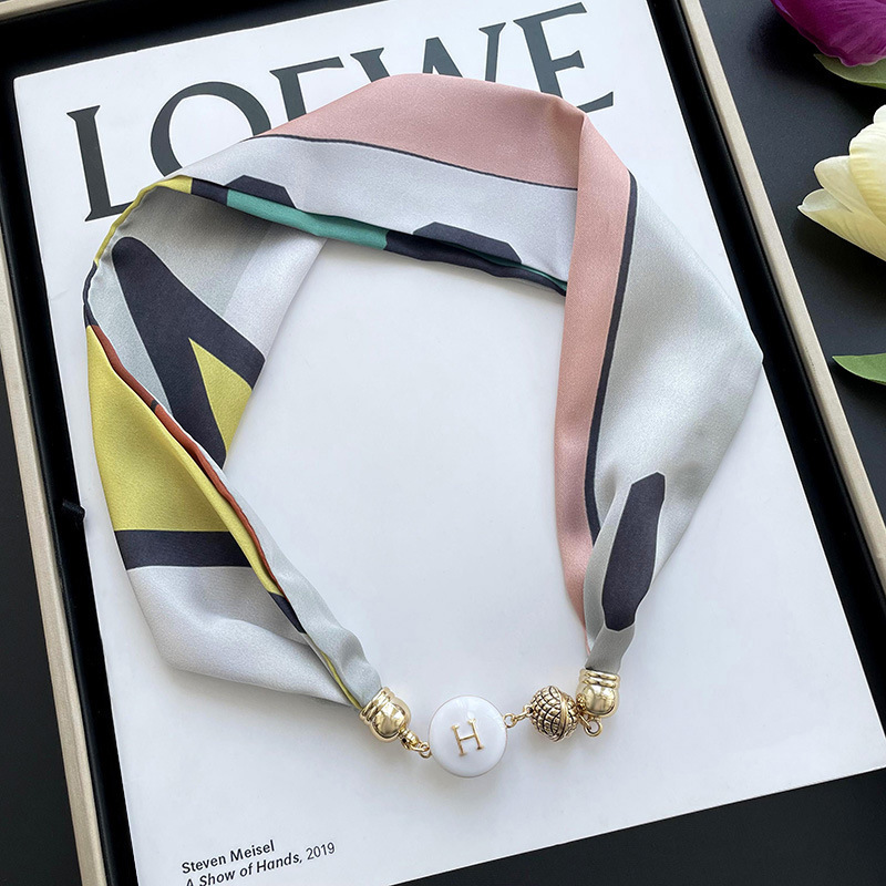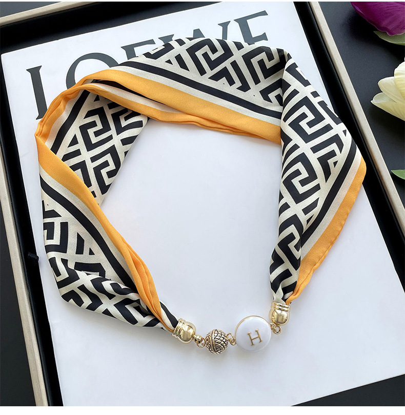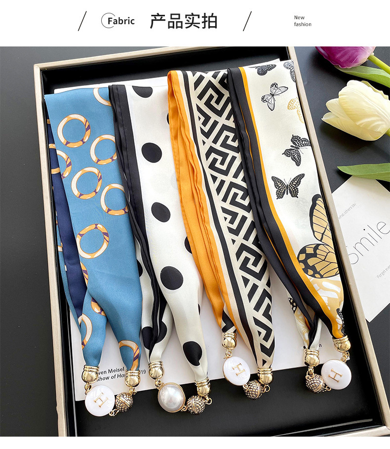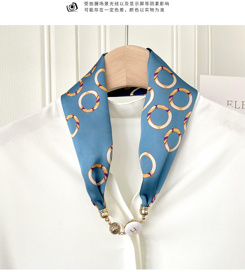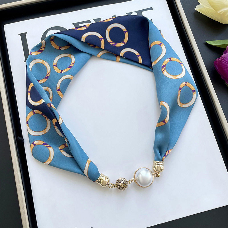 봄, 가을 여성용 게으른 자석 버클 실크 스카프 얇은 목 보호대 자석 버클 실크 스카프 긴 작은 칼라 다용도 진주 목걸이스토어 가기
