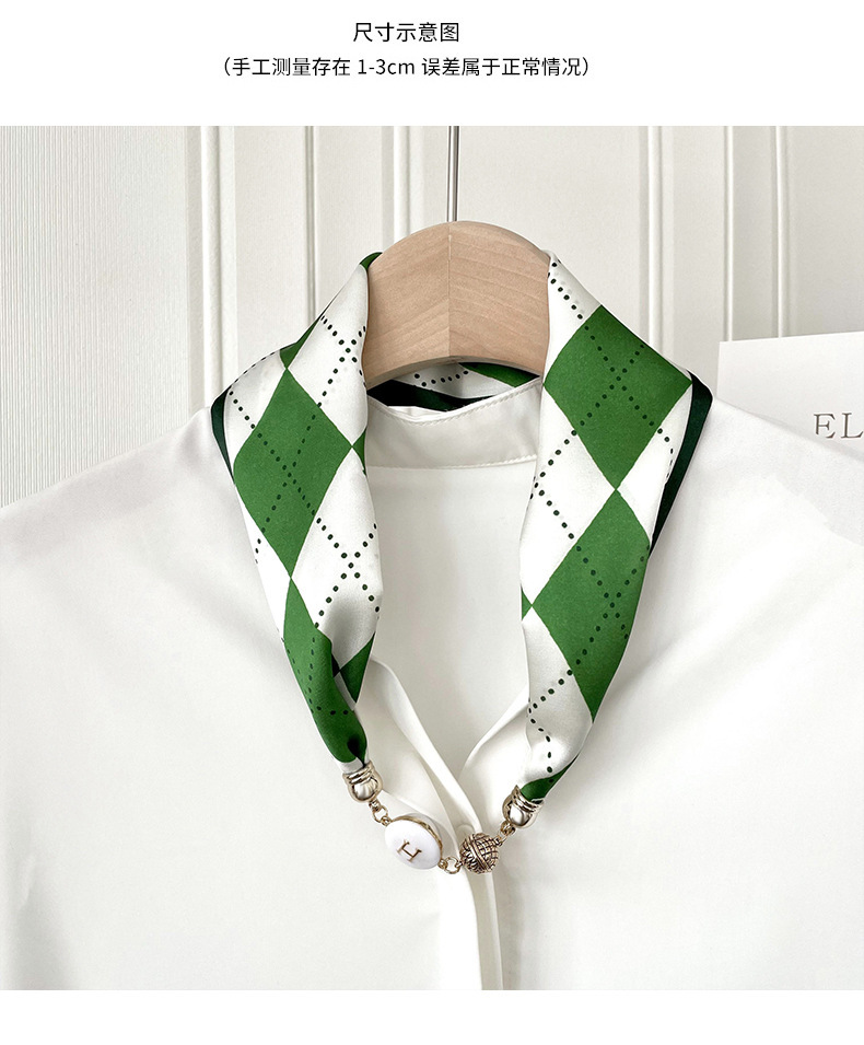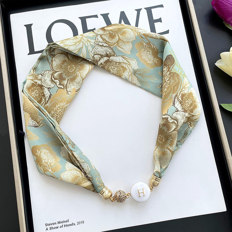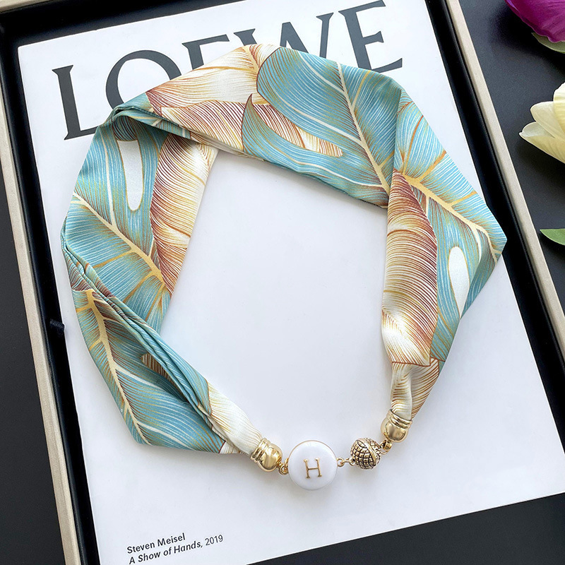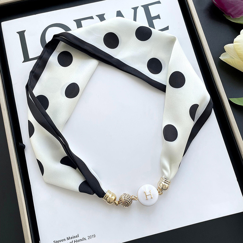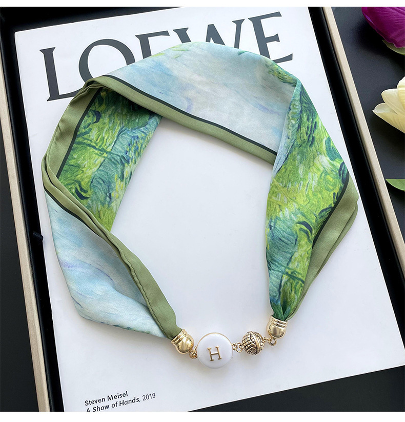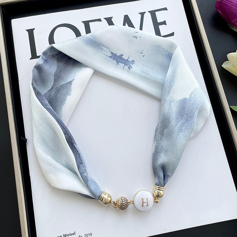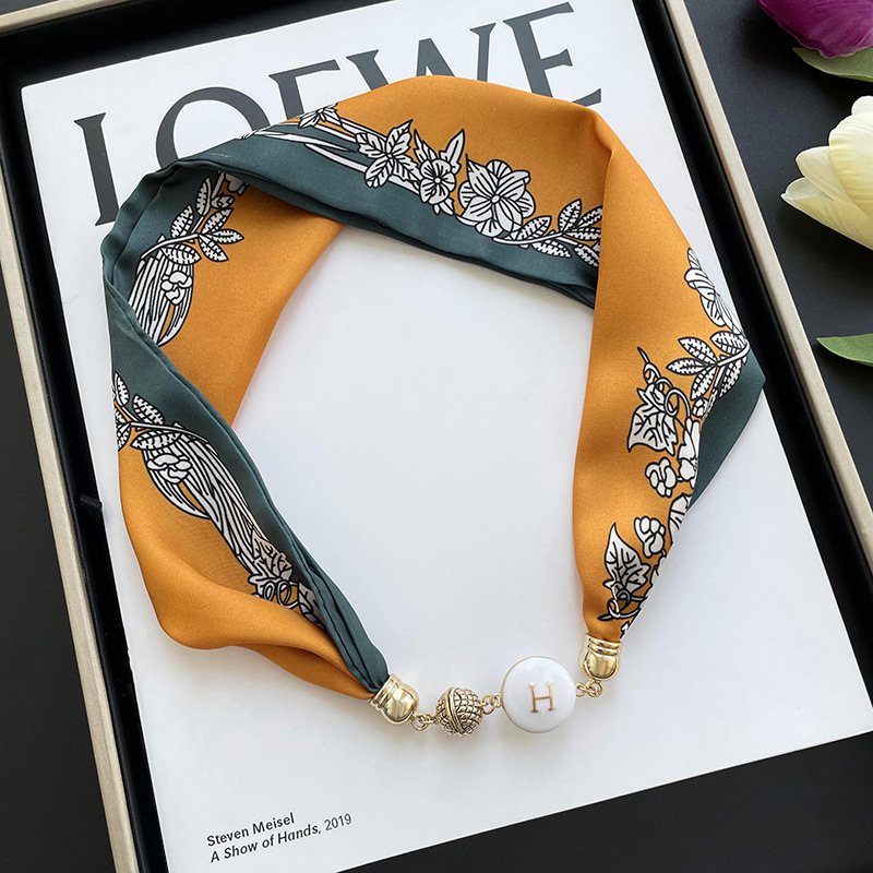 봄, 가을 여성용 게으른 자석 버클 실크 스카프 얇은 목 보호대 자석 버클 실크 스카프 긴 작은 칼라 다용도 진주 목걸이스토어 가기