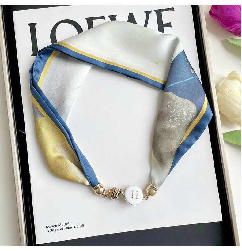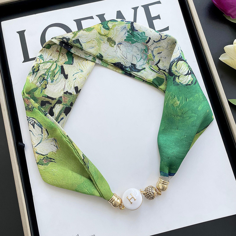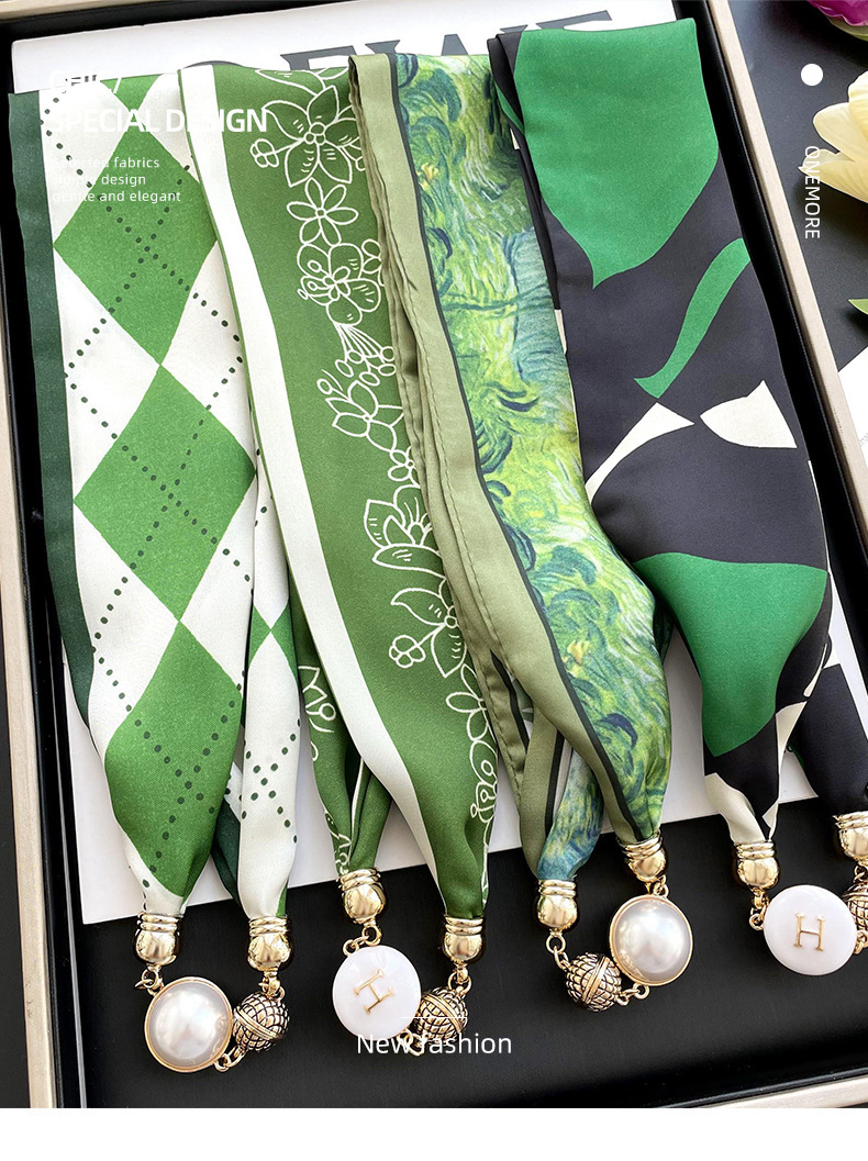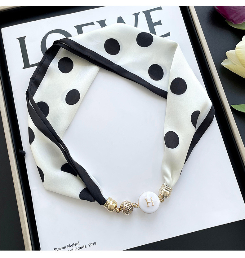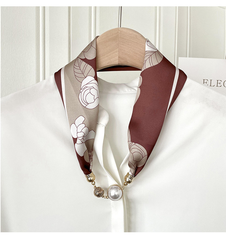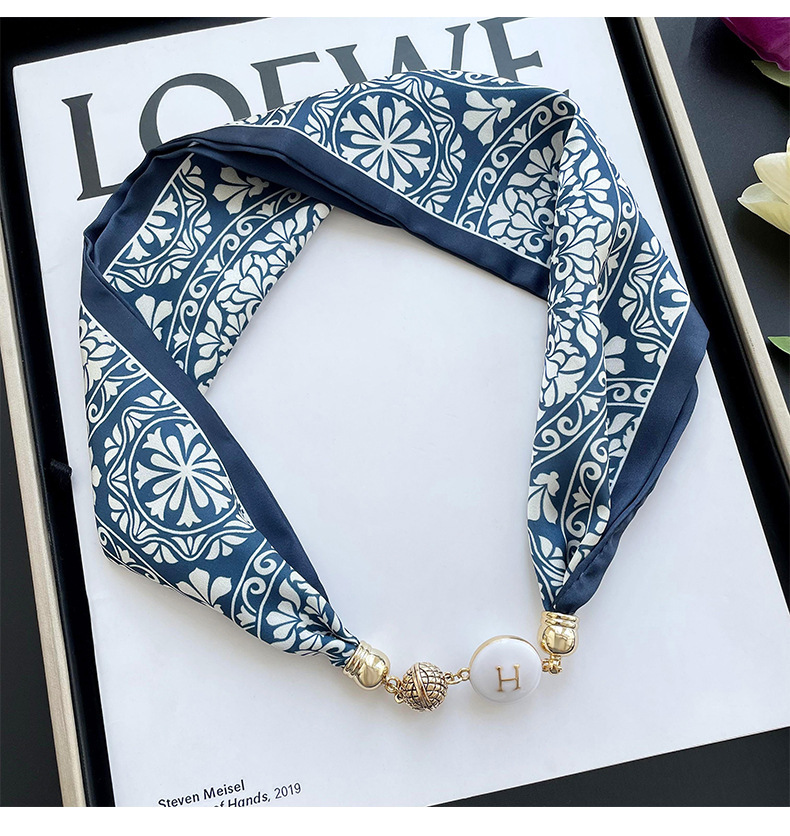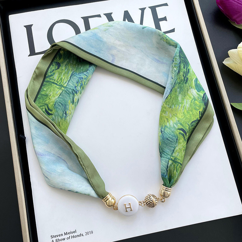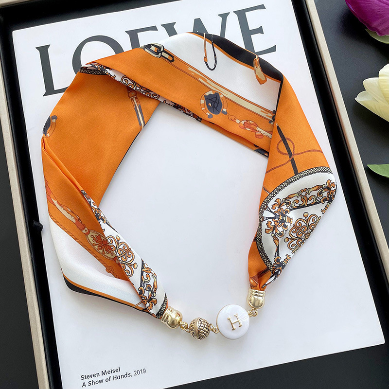 봄, 가을 여성용 게으른 자석 버클 실크 스카프 얇은 목 보호대 자석 버클 실크 스카프 긴 작은 칼라 다용도 진주 목걸이스토어 가기
