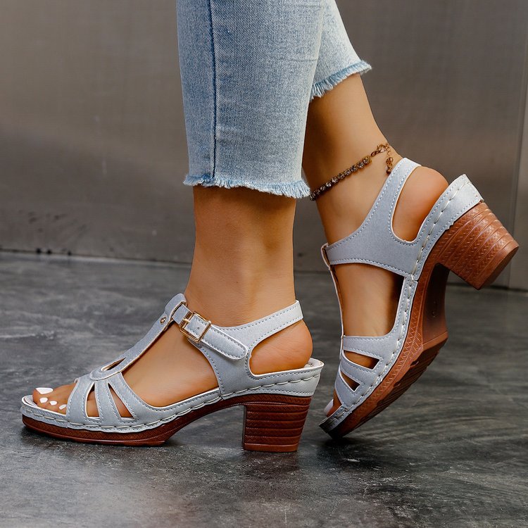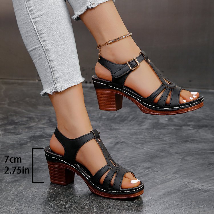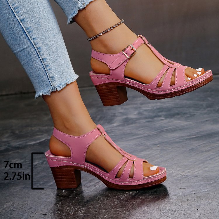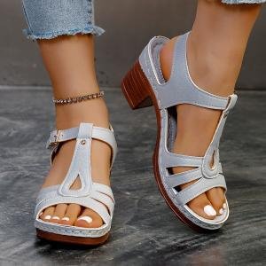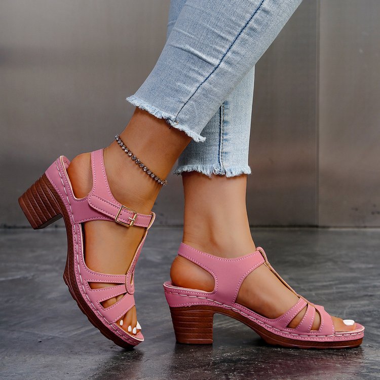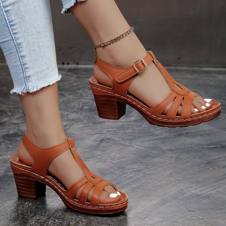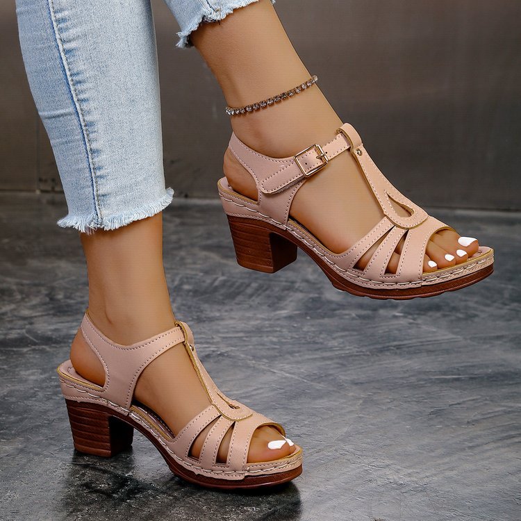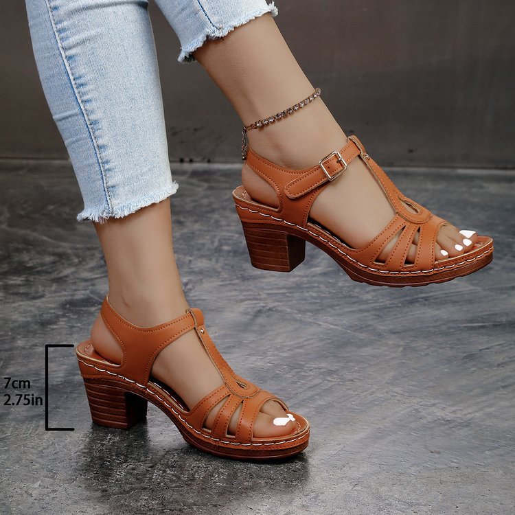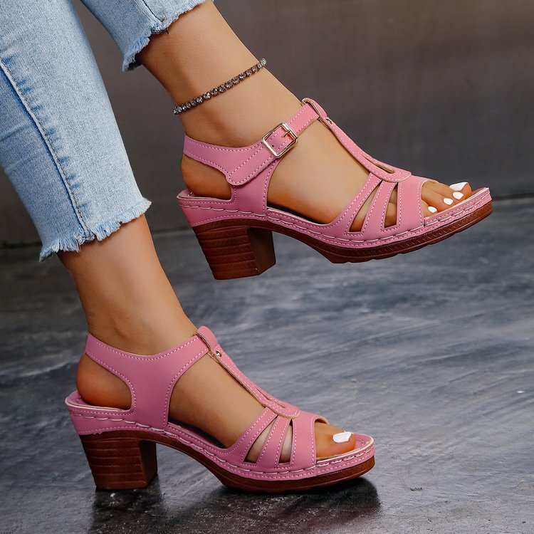 여성을위한 크로스 보더 대형 샌들 2025 여름 새로운 단색 유럽과 미국의 물고기 입 두꺼운 굽 버클 하이힐 샌들스토어 가기