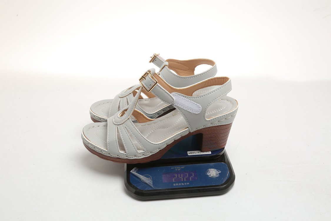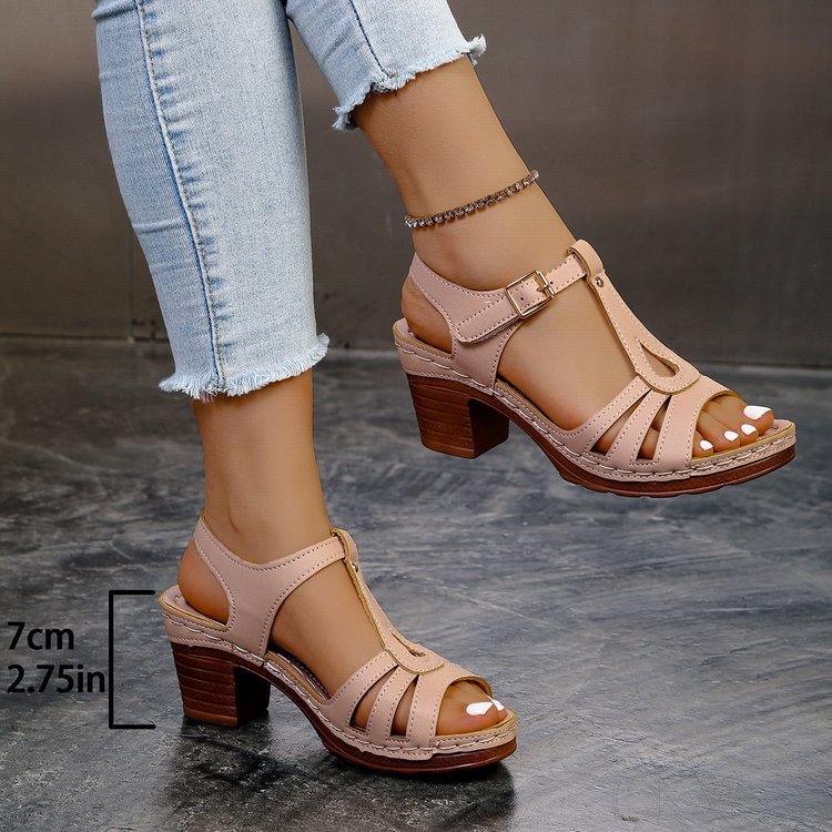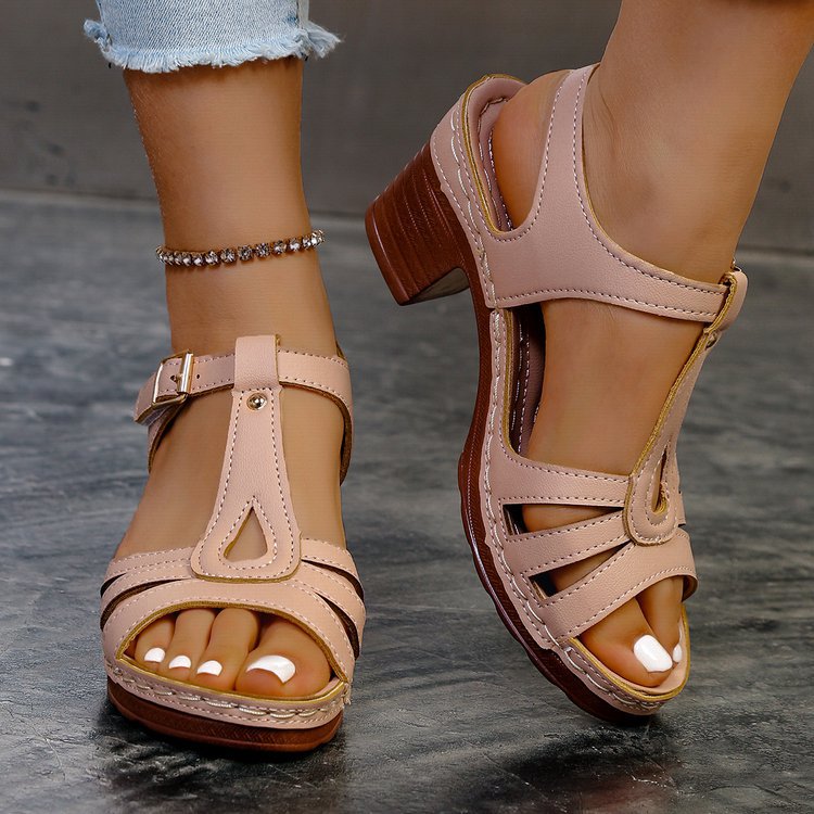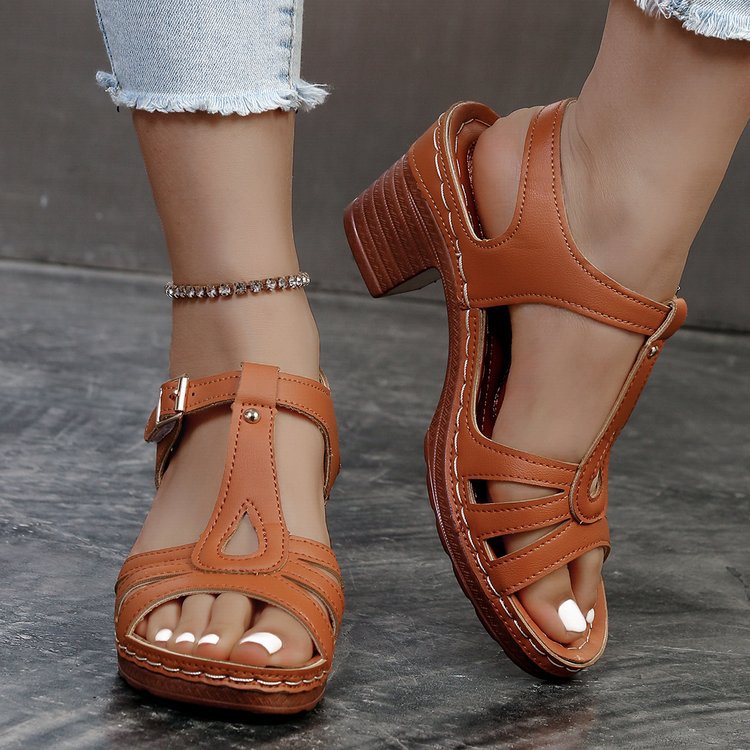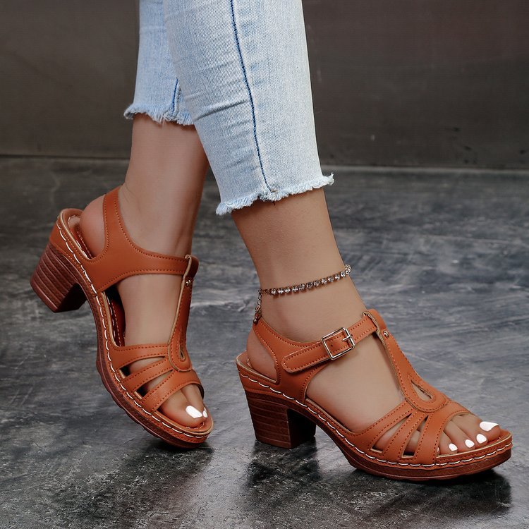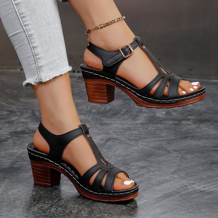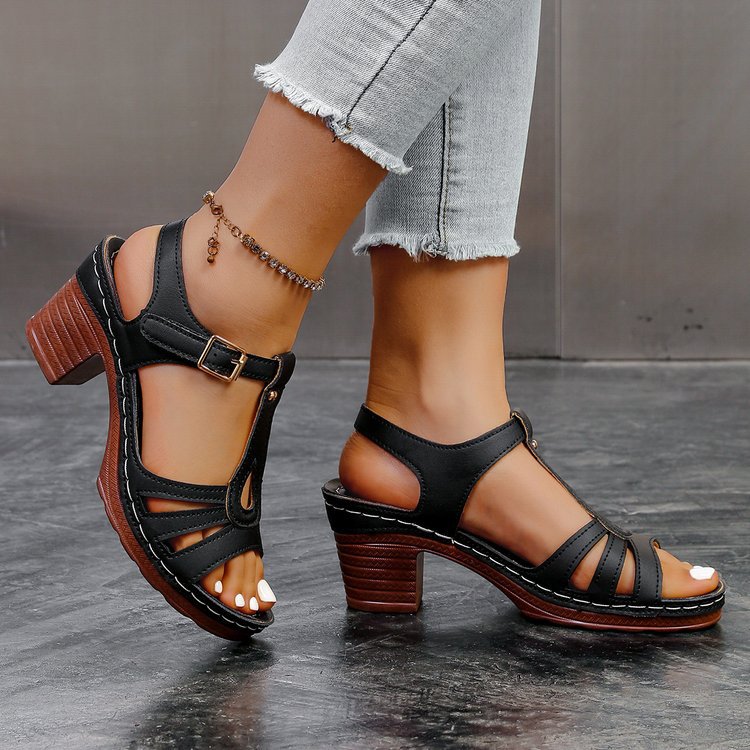 여성을위한 크로스 보더 대형 샌들 2025 여름 새로운 단색 유럽과 미국의 물고기 입 두꺼운 굽 버클 하이힐 샌들스토어 가기