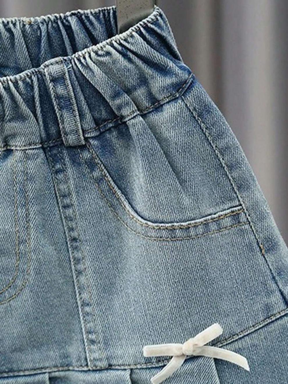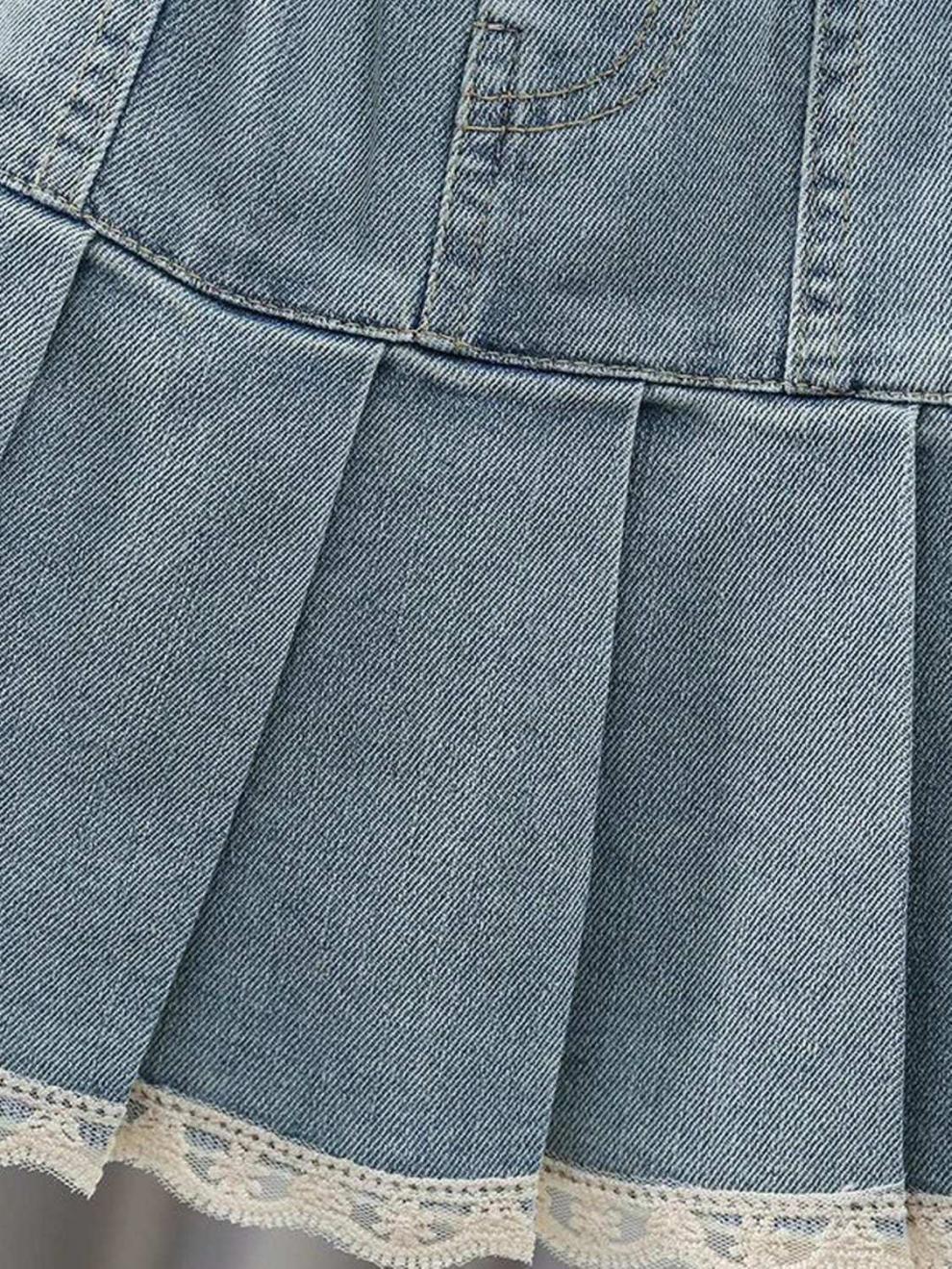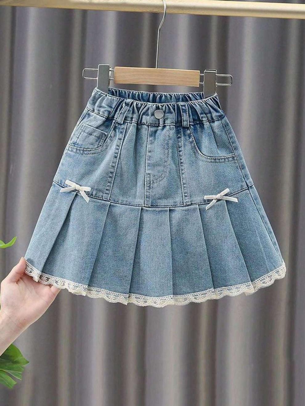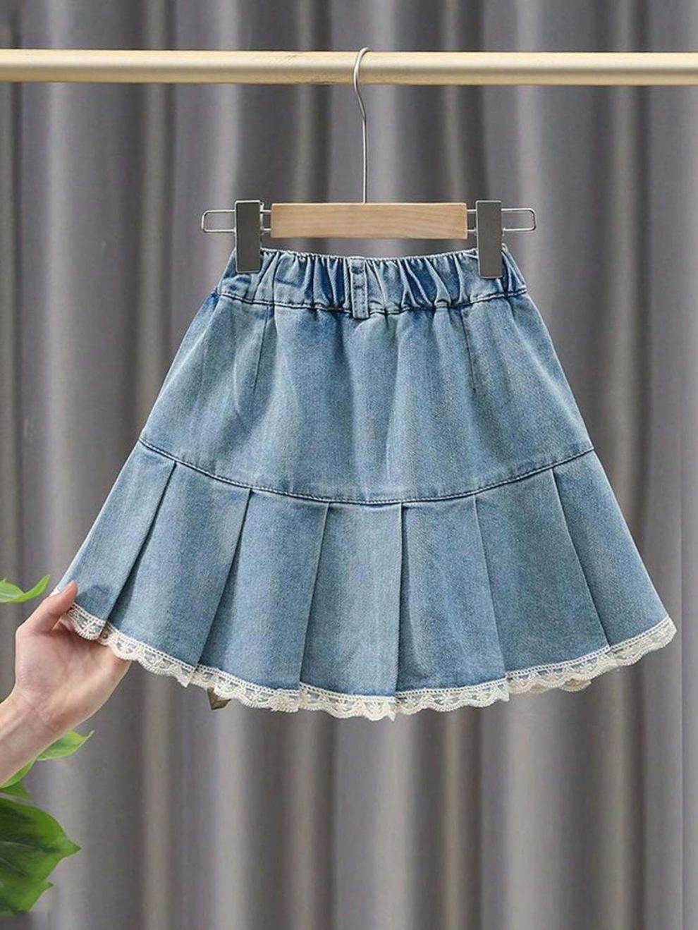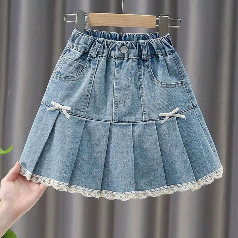 여아 데님 스커트 봄, 여름, 가을 새로운 스타일 중대형 어린이 인터넷 연예인 스타일 케이크 스커트 어린이 짧은 스커트 레이스스토어 가기