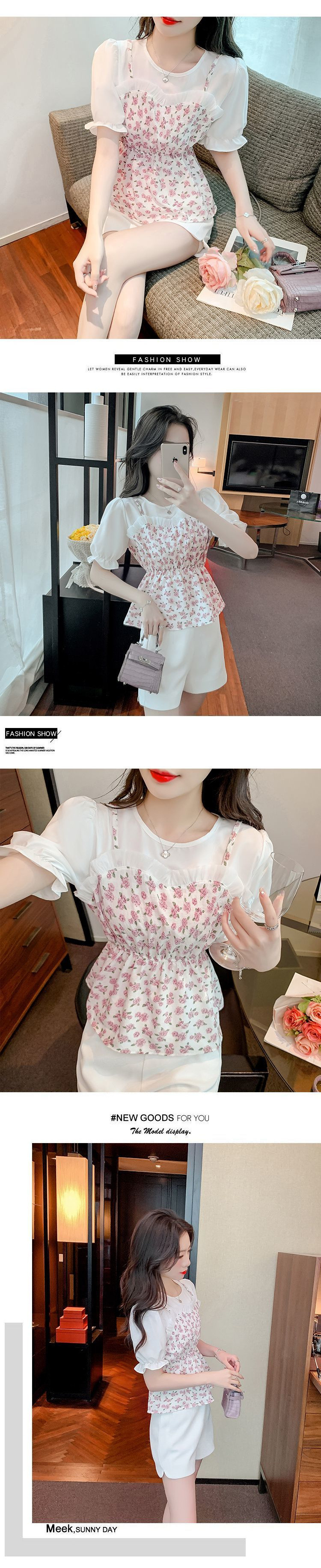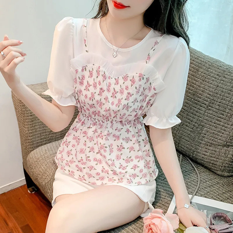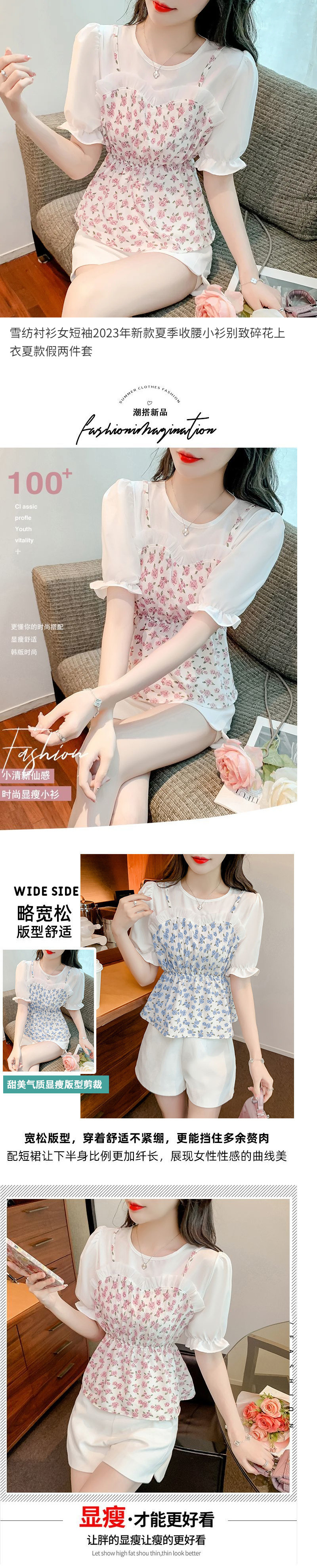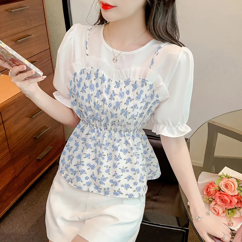시폰 셔츠 여성 반팔 2025 신작 여름 허리 셔츠 세련된 꽃 무늬 탑 여름 가짜 투피스 세트스토어 가기