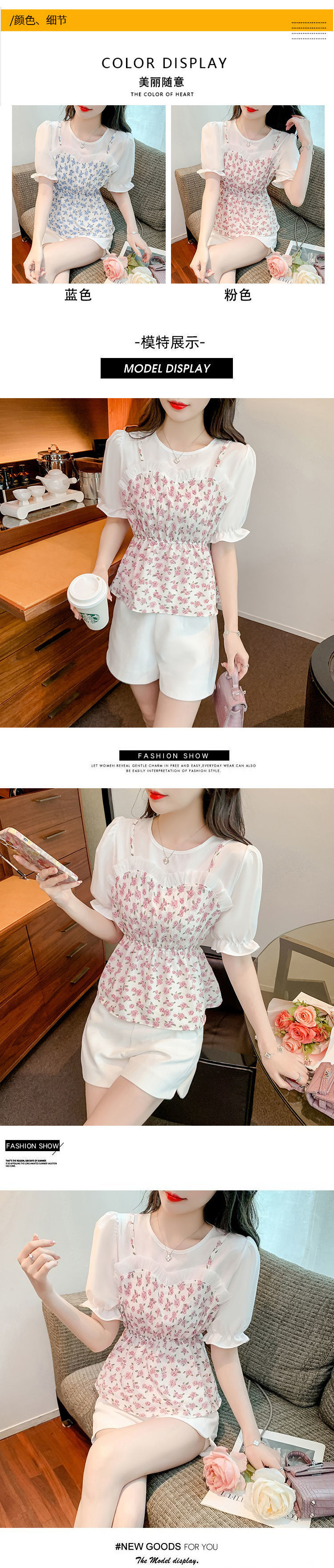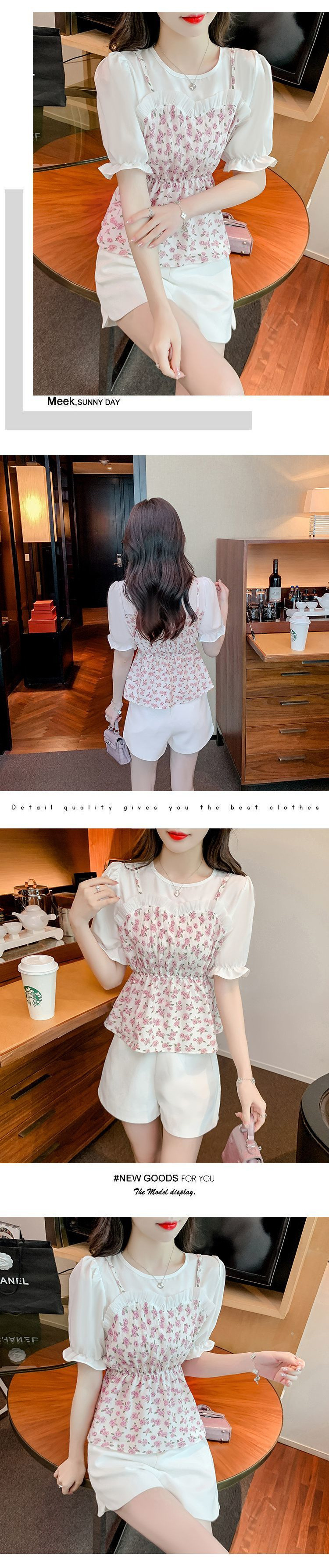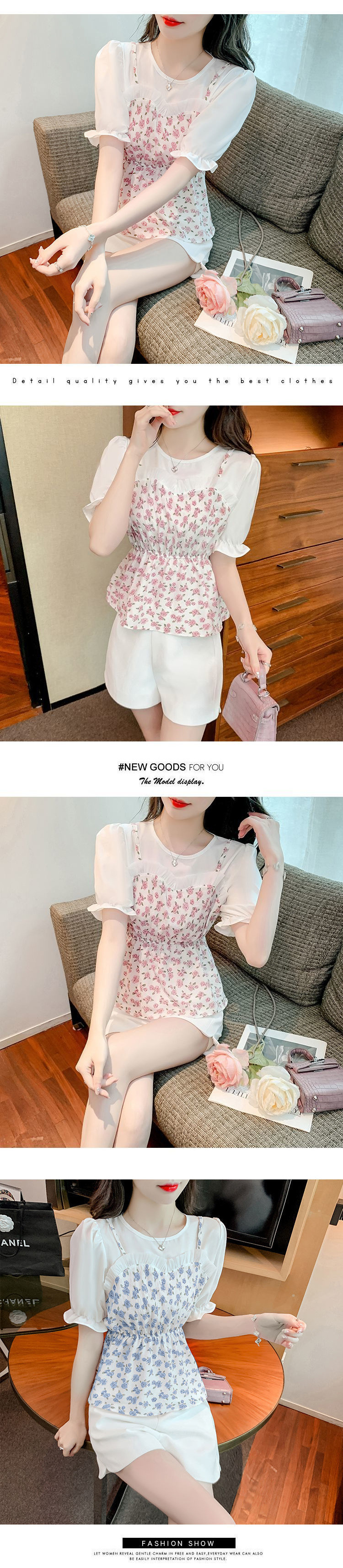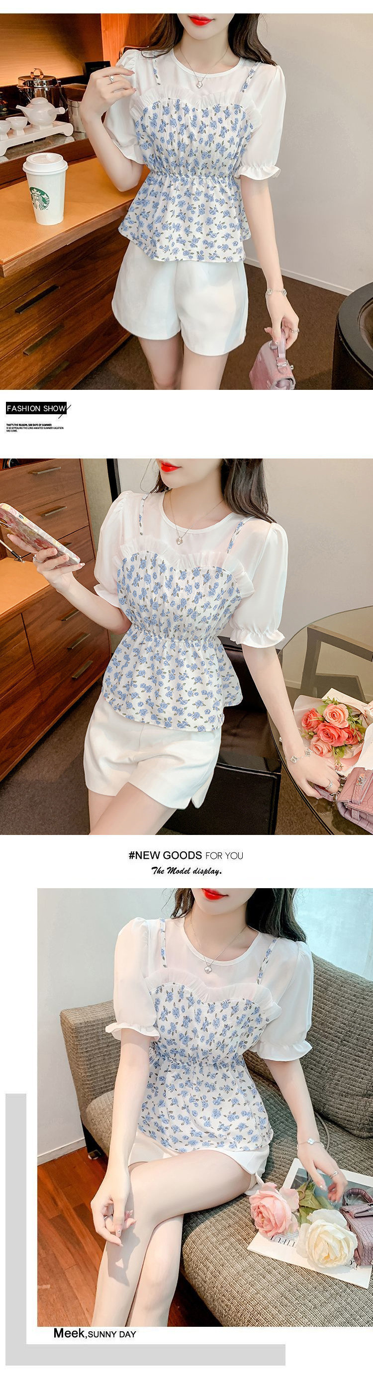 시폰 셔츠 여성 반팔 2025 신작 여름 허리 셔츠 세련된 꽃 무늬 탑 여름 가짜 투피스 세트스토어 가기