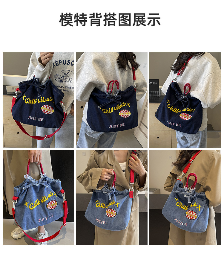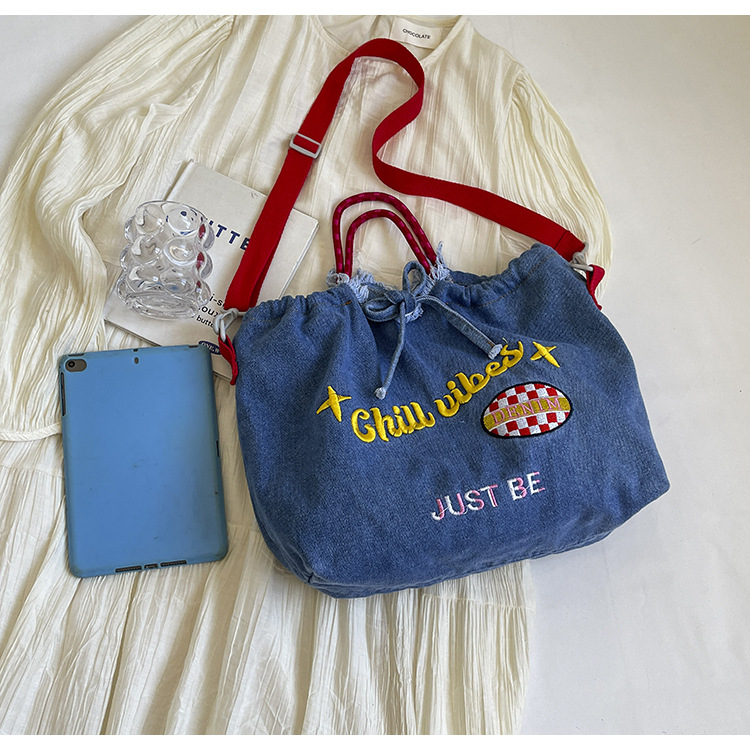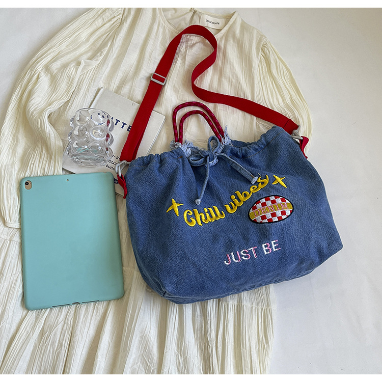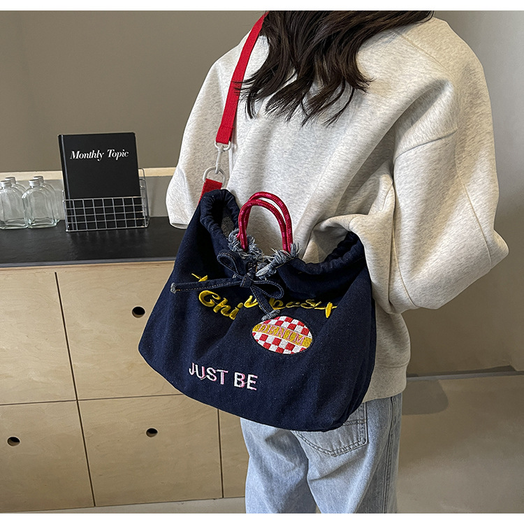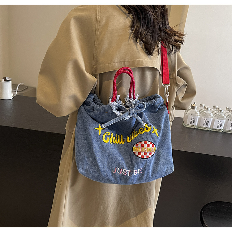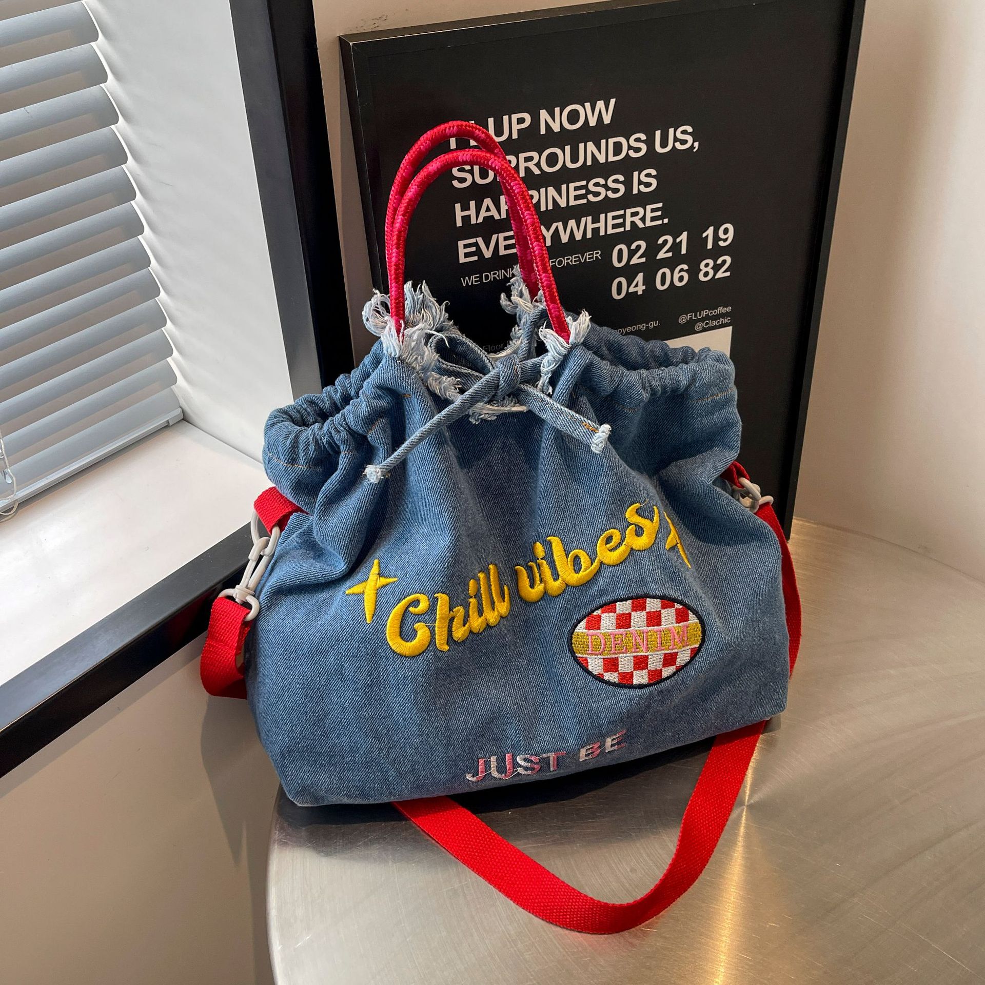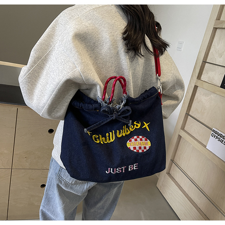 일본과 한국 데님 자수 볼체인 휴대용 토트 백 대용량 숄더백 캐주얼 통근 크로스 바디 백스토어 가기