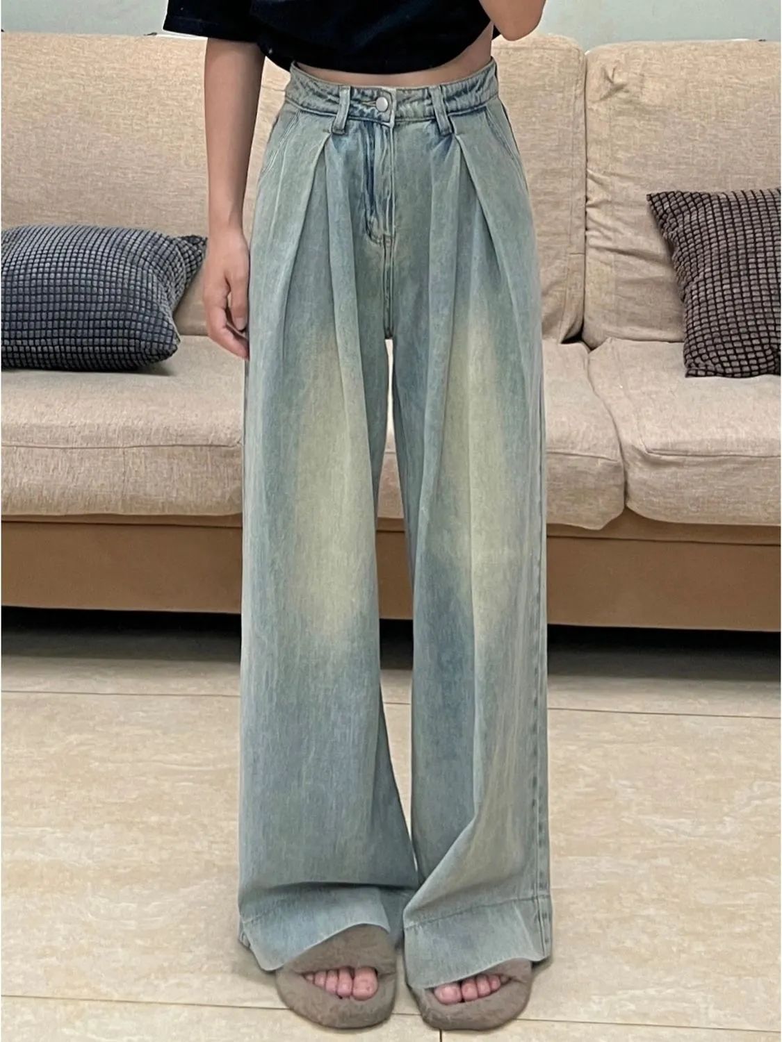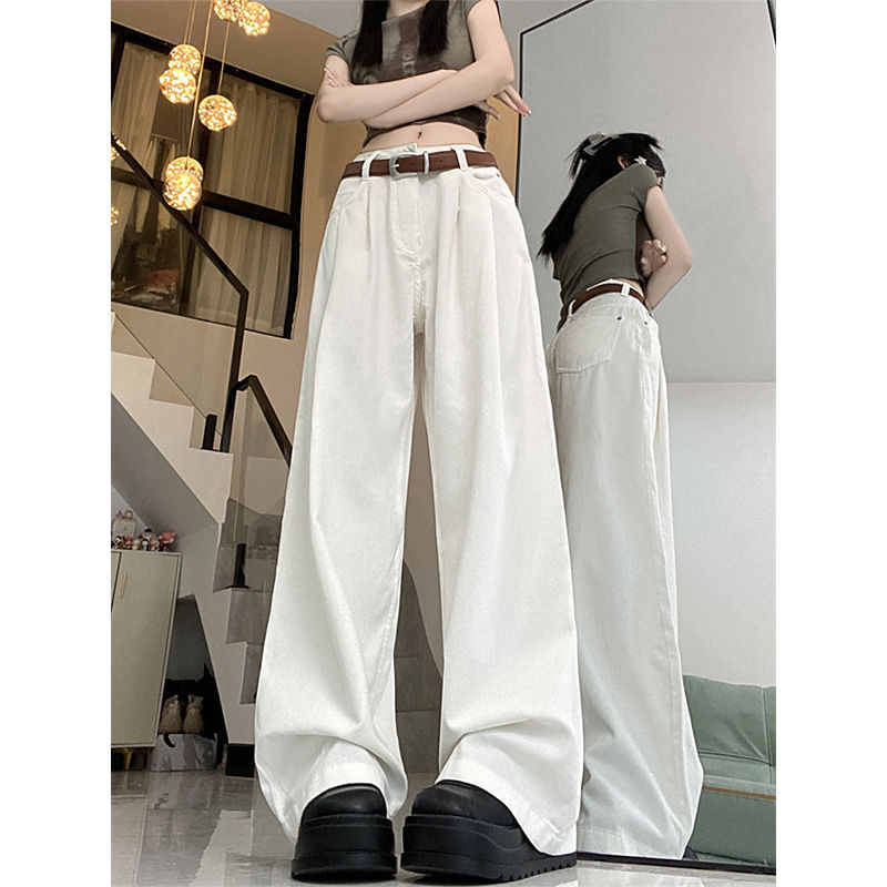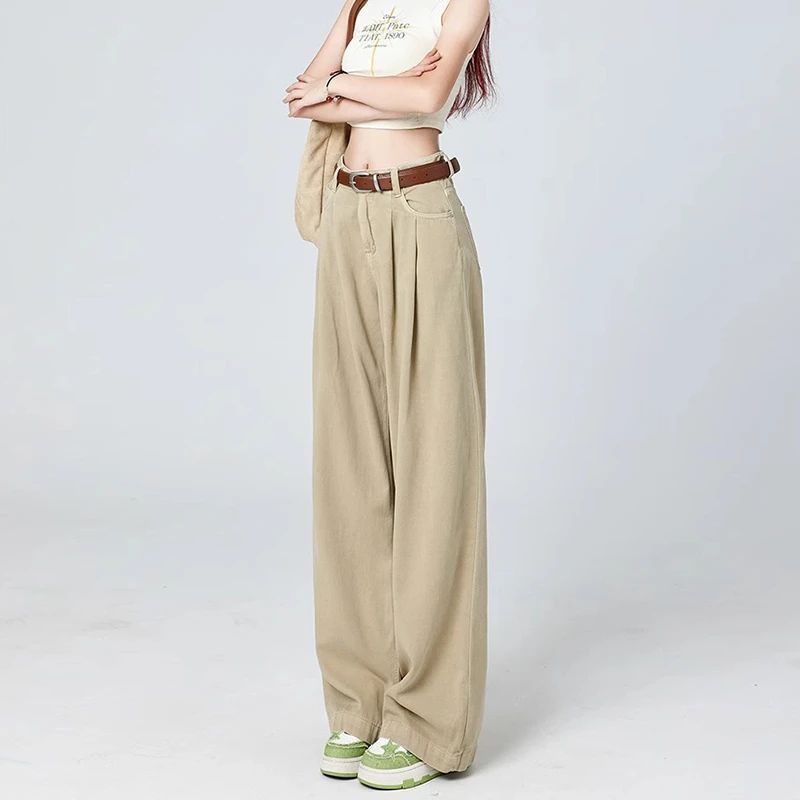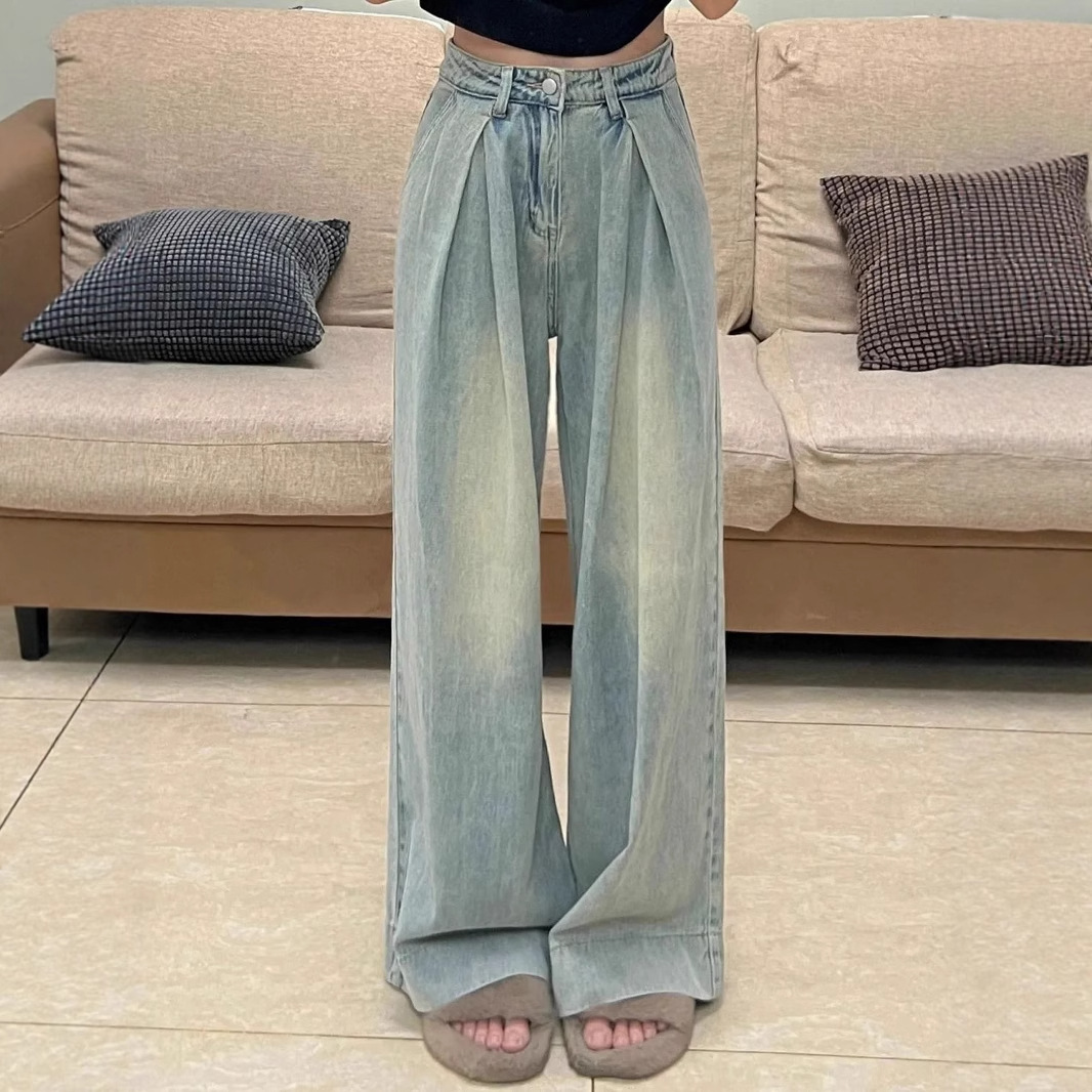 여성용 아메리칸 플리츠 와이드 레그 청바지 2025 새로운 디자인 루즈하고 슬림한 하이웨이스트 스트레이트 바닥 길이 바지스토어 가기