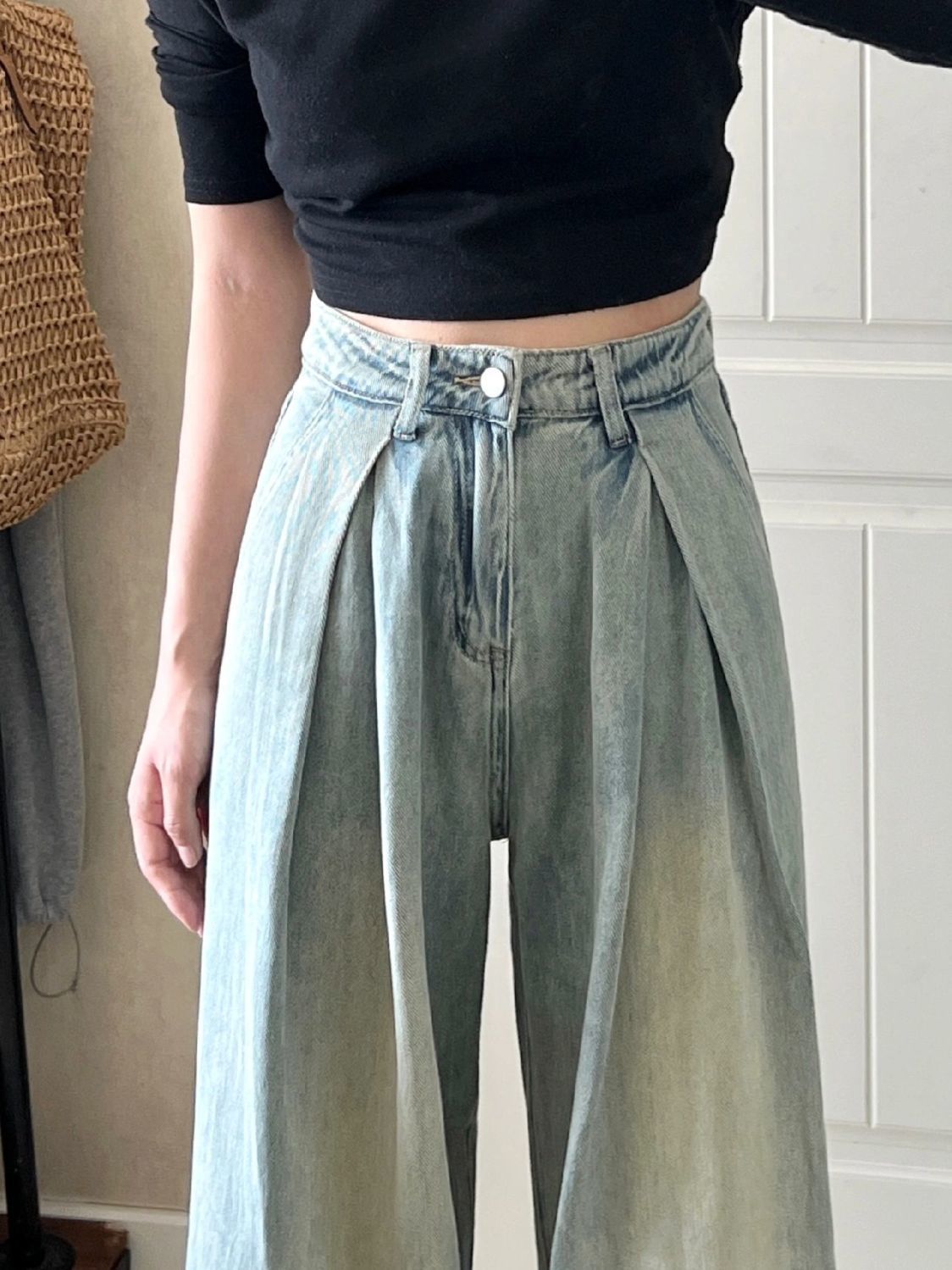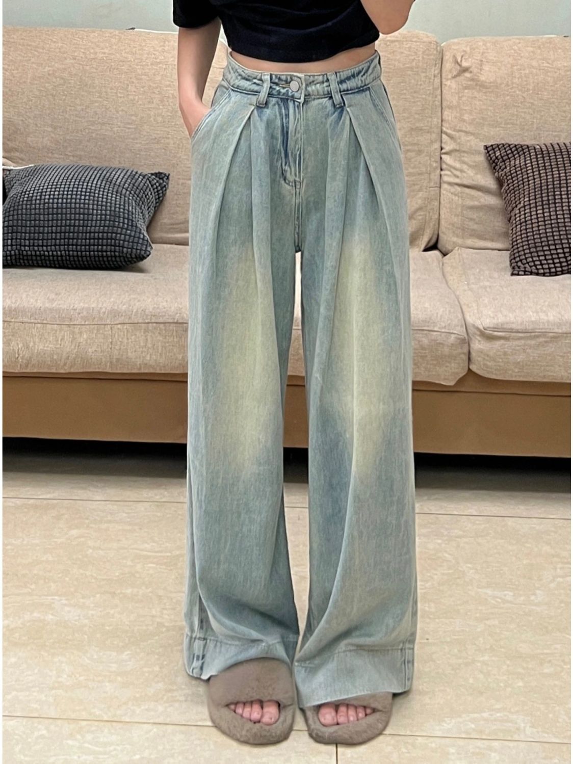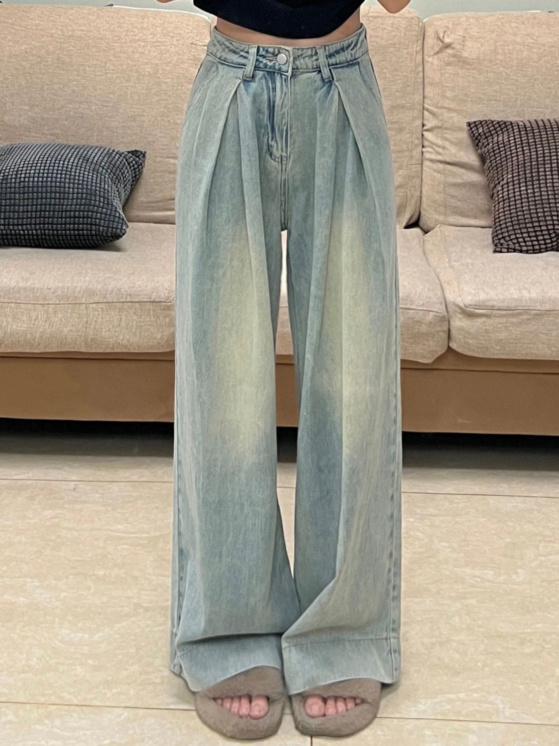 여성용 아메리칸 플리츠 와이드 레그 청바지 2025 새로운 디자인 루즈하고 슬림한 하이웨이스트 스트레이트 바닥 길이 바지스토어 가기