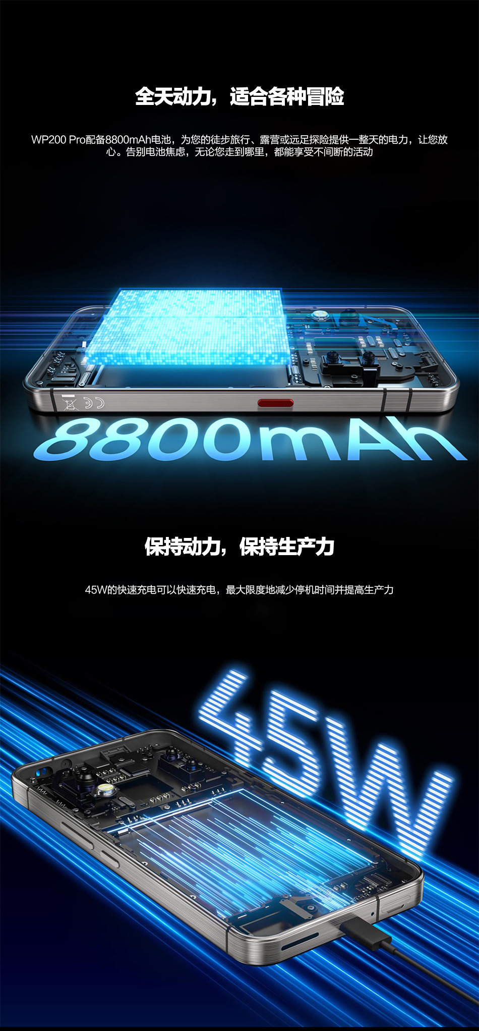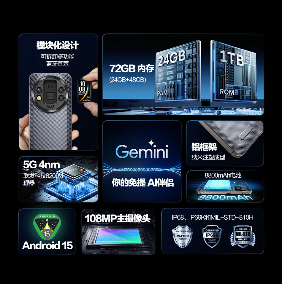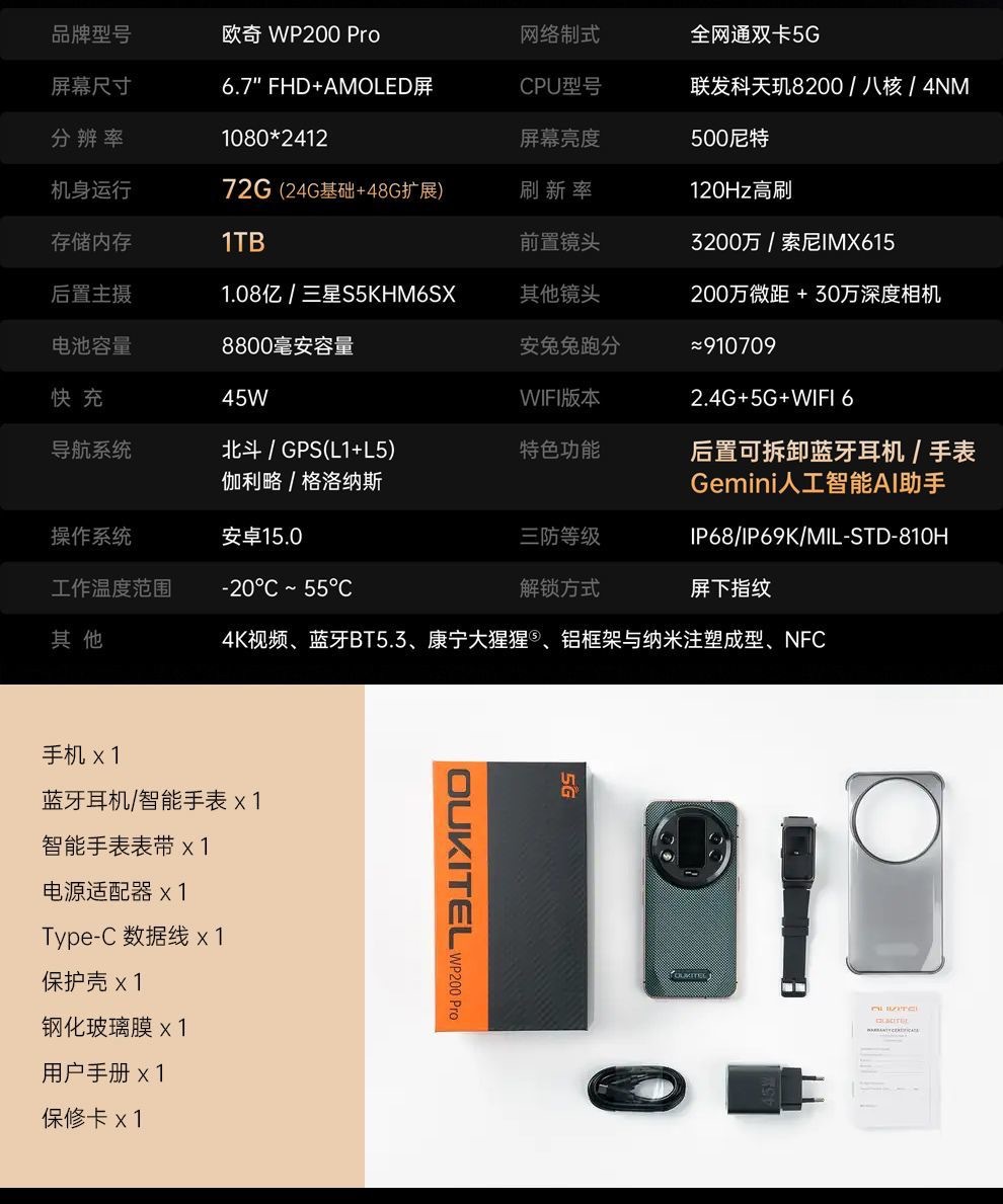 Ouchi WP200Pro 견고한 스마트폰 5G 듀얼 SIM 1TB 대용량 메모리 탈착식 Bluetooth 헤드셋/시계