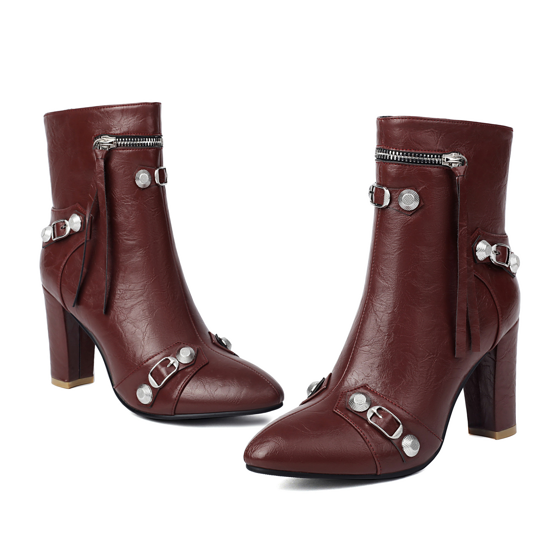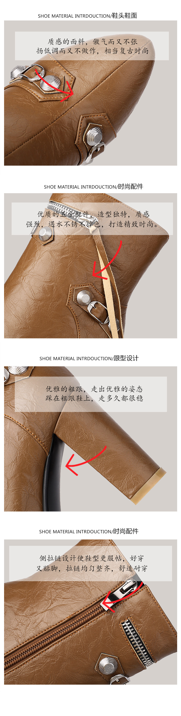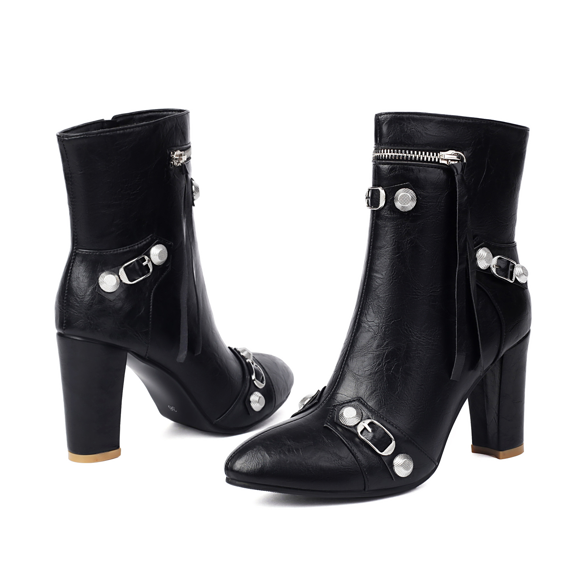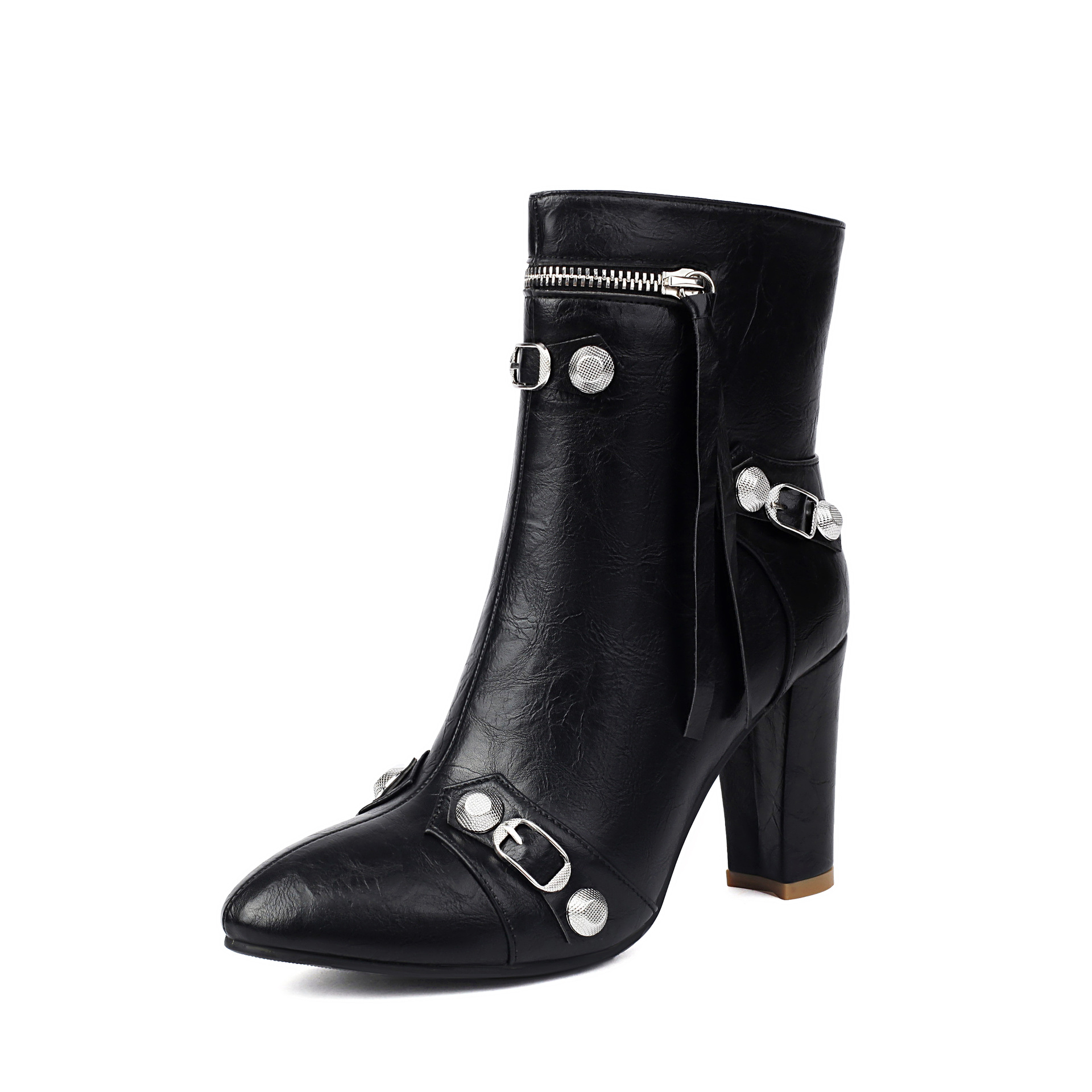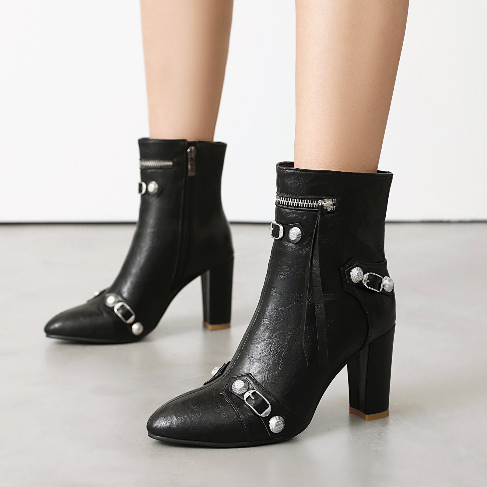 새로운 벨트 버클 리벳 여성 부츠 뾰족한 발가락 짧은 라이더 부츠 두꺼운 하이힐 부츠 40-47 대형 외국 무역 부츠스토어 가기