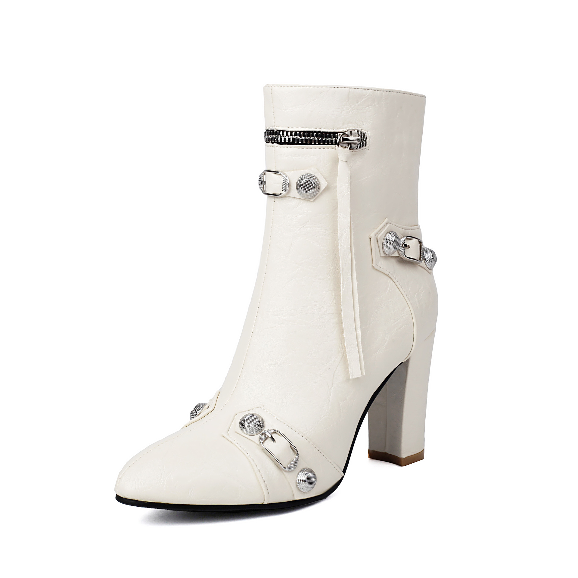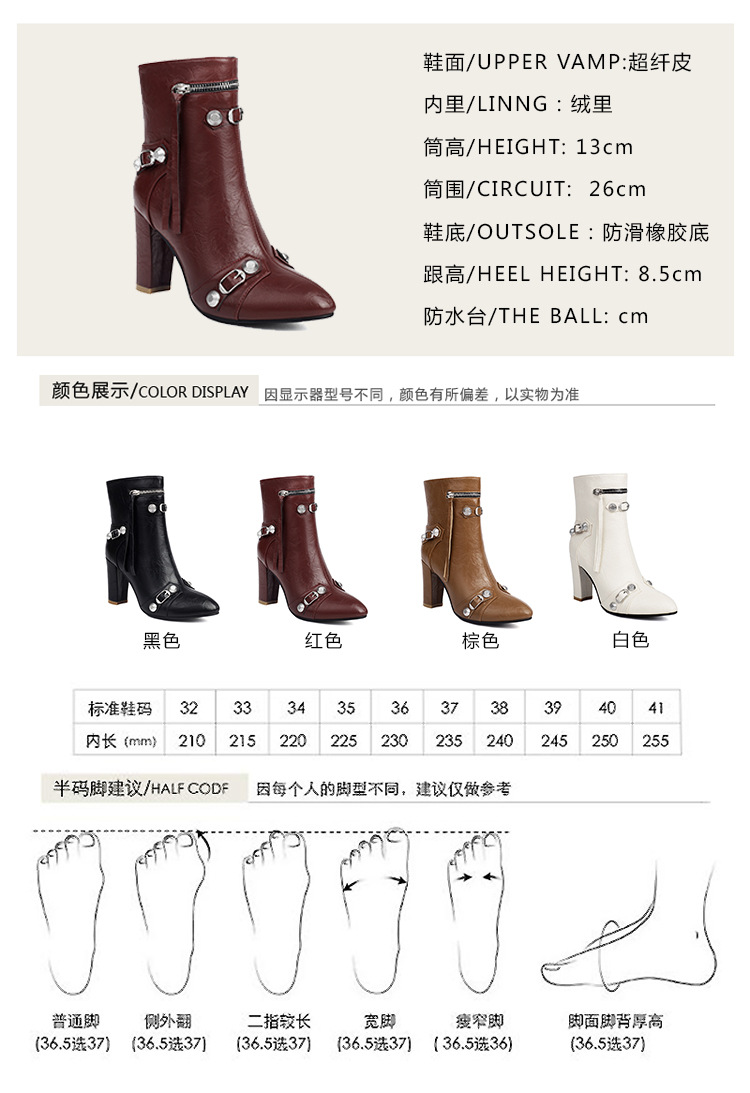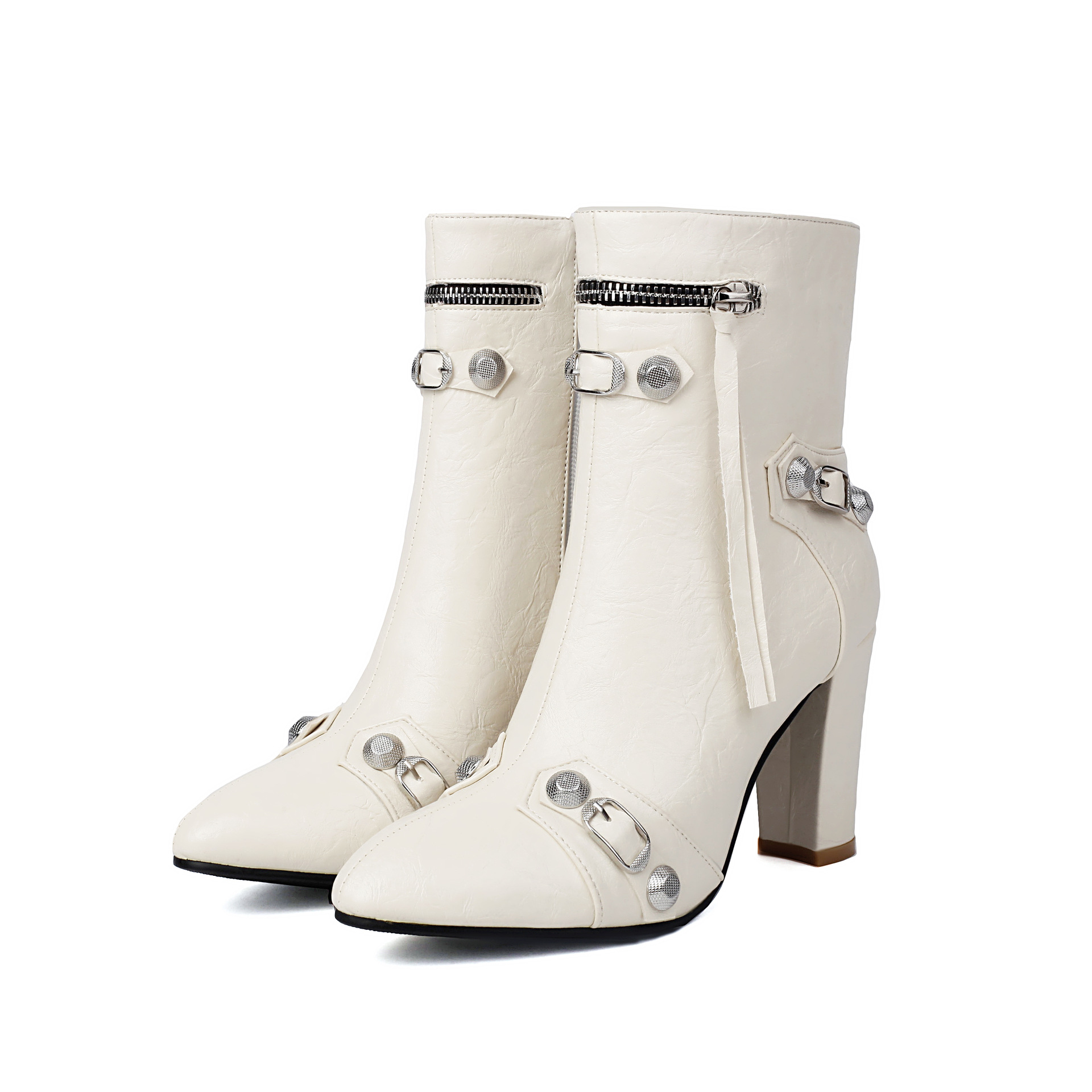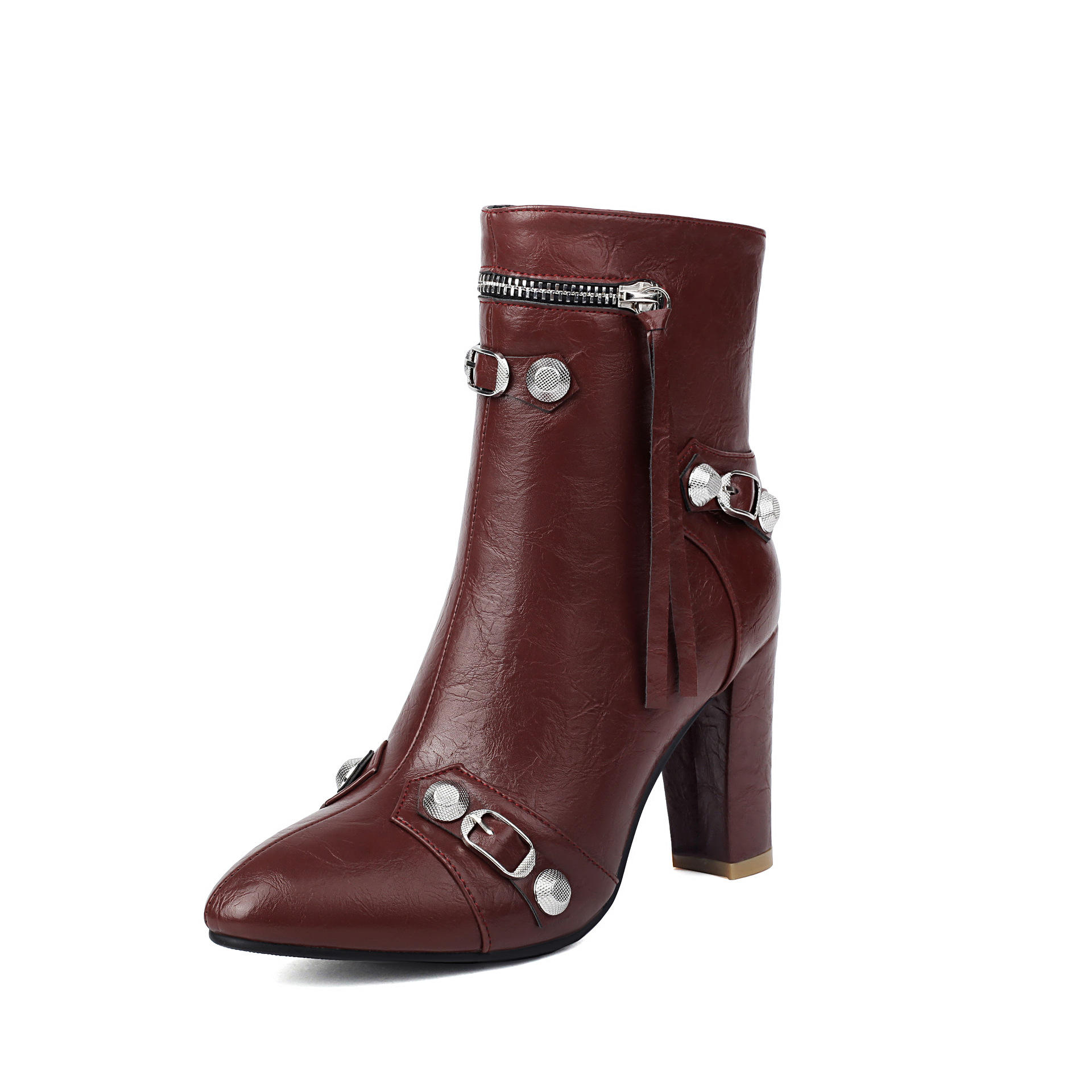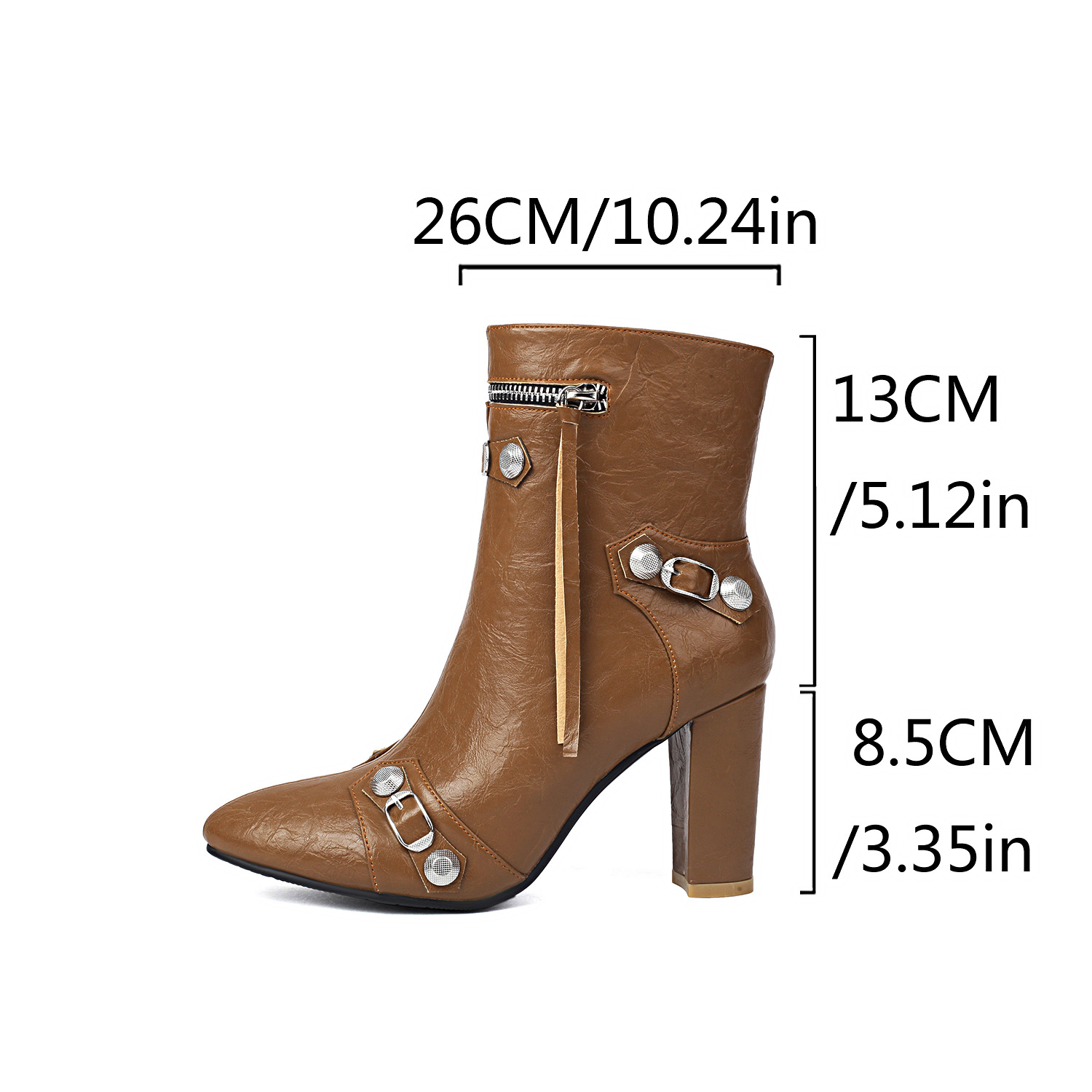 새로운 벨트 버클 리벳 여성 부츠 뾰족한 발가락 짧은 라이더 부츠 두꺼운 하이힐 부츠 40-47 대형 외국 무역 부츠스토어 가기
