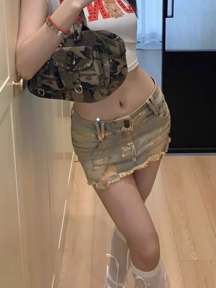 유럽과 미국 스타일의 y2k 밀레니얼 핫 걸 워시드 및 립티드 골드 로우 웨이스트 데님 스커트 여성용 슬리밍 힙 커버 짧은 스커트 트렌디스토어 가기