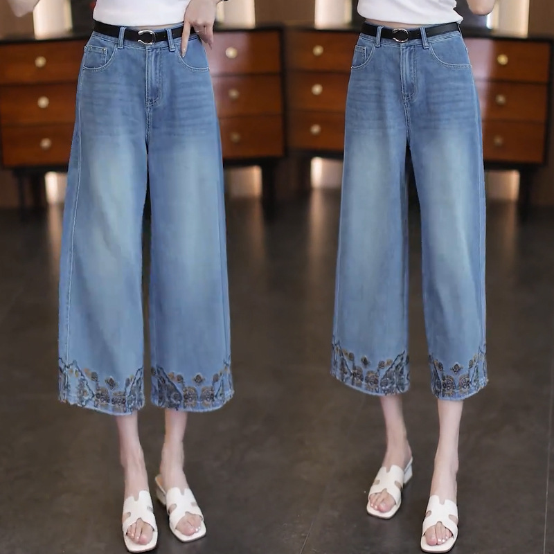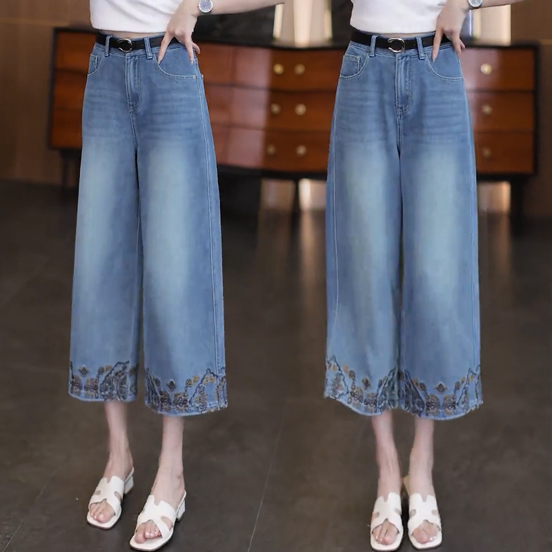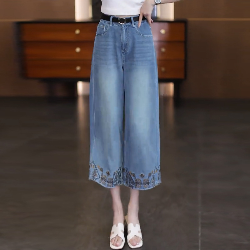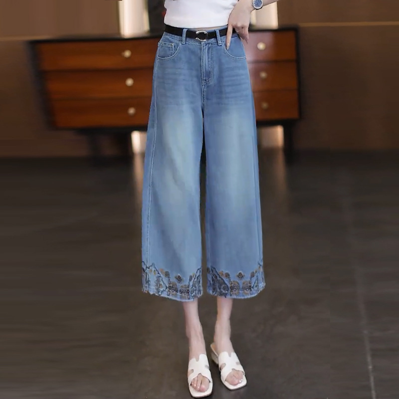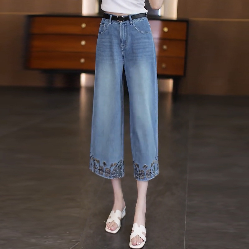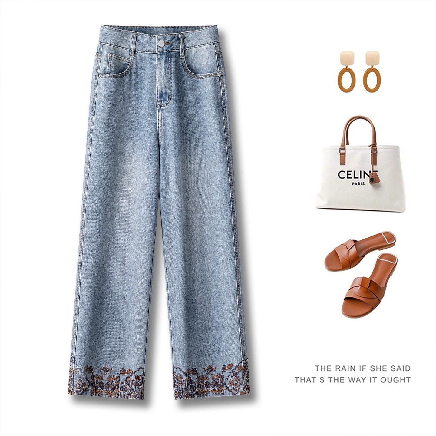 여성을위한 텐셀 소프트 데님 얇은 와이드 레그 청바지 2025 여름 새로운 하이 웨이스트 내셔널 스타일 자수 8 점 스트레이트 팬츠