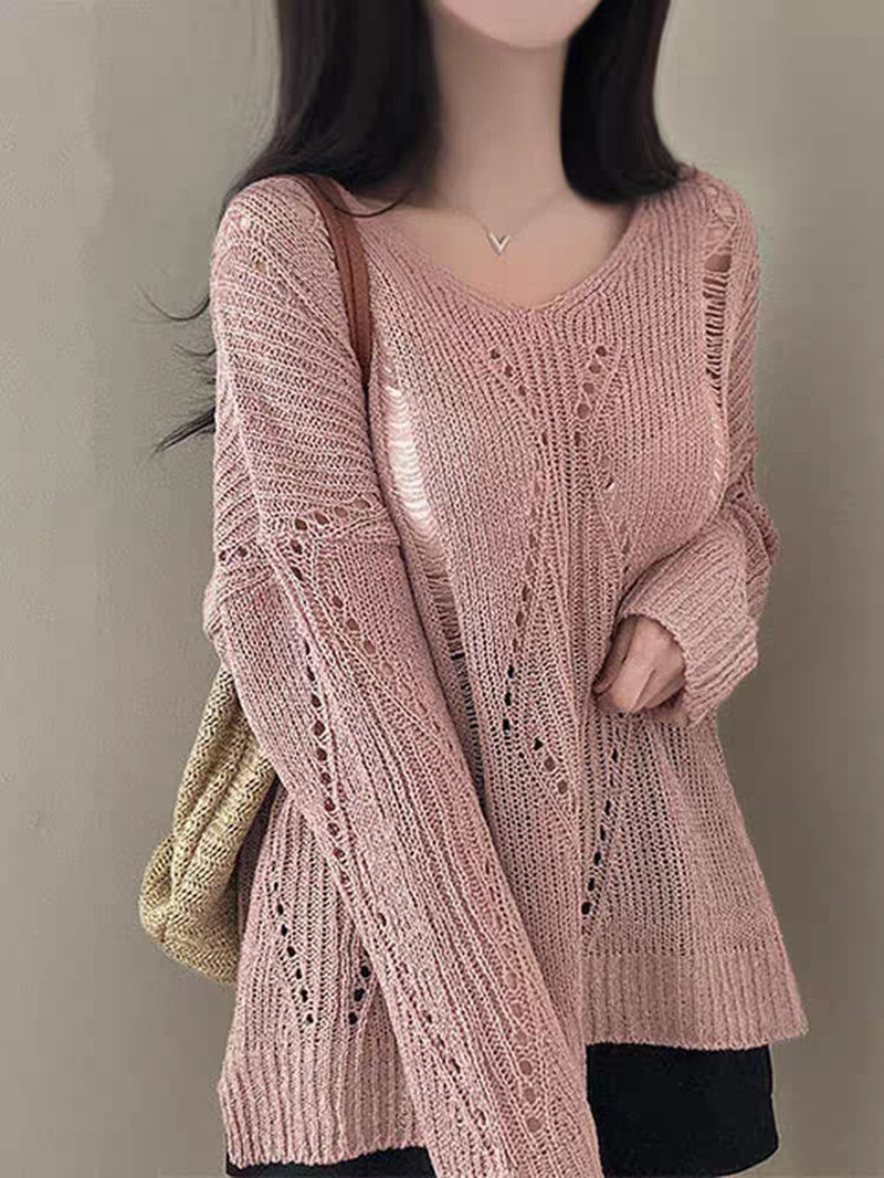 한국 2026 봄 가을 신상 레이지 스타일 루즈핏 솔리드 컬러 펀칭 얇은 긴팔 니트 V넥 블라우스 여성용