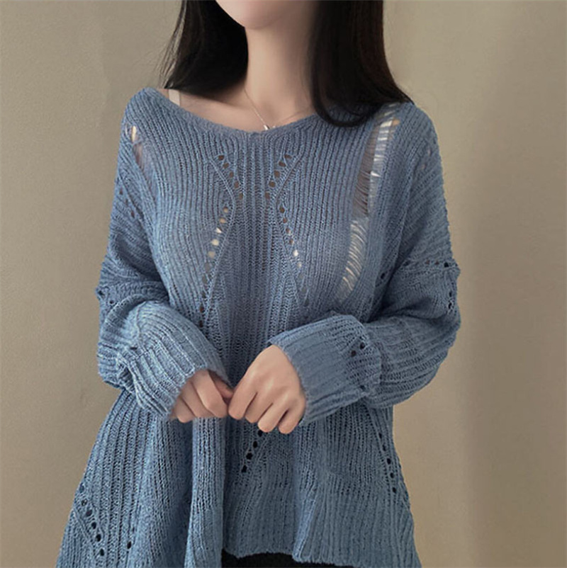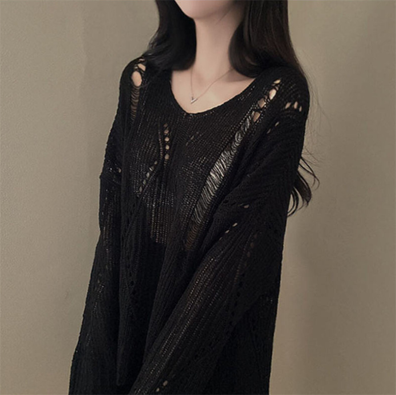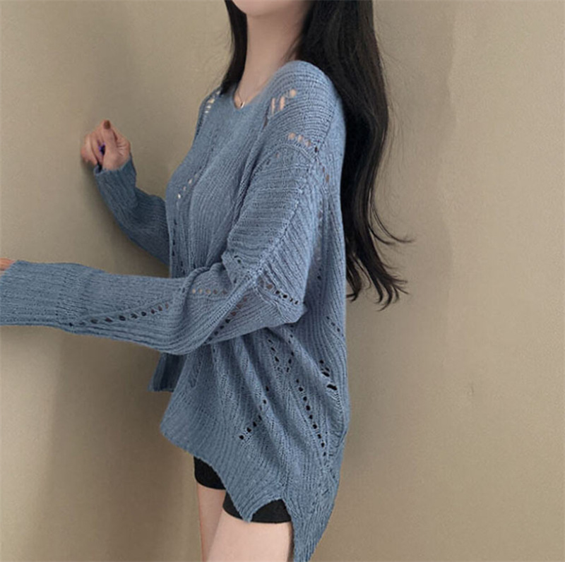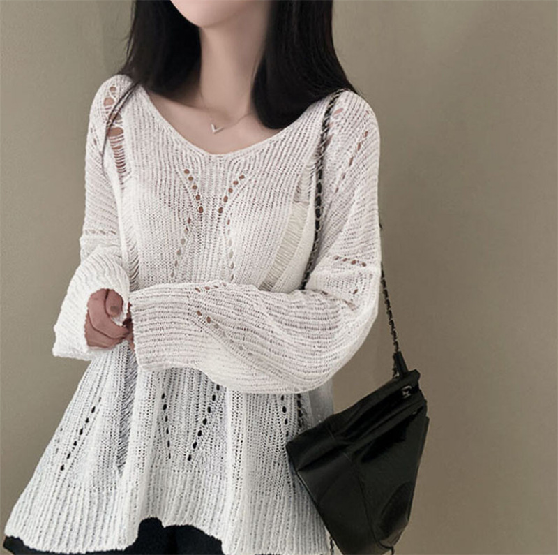 한국 2026 봄 가을 신상 레이지 스타일 루즈핏 솔리드 컬러 펀칭 얇은 긴팔 니트 V넥 블라우스 여성용스토어 가기