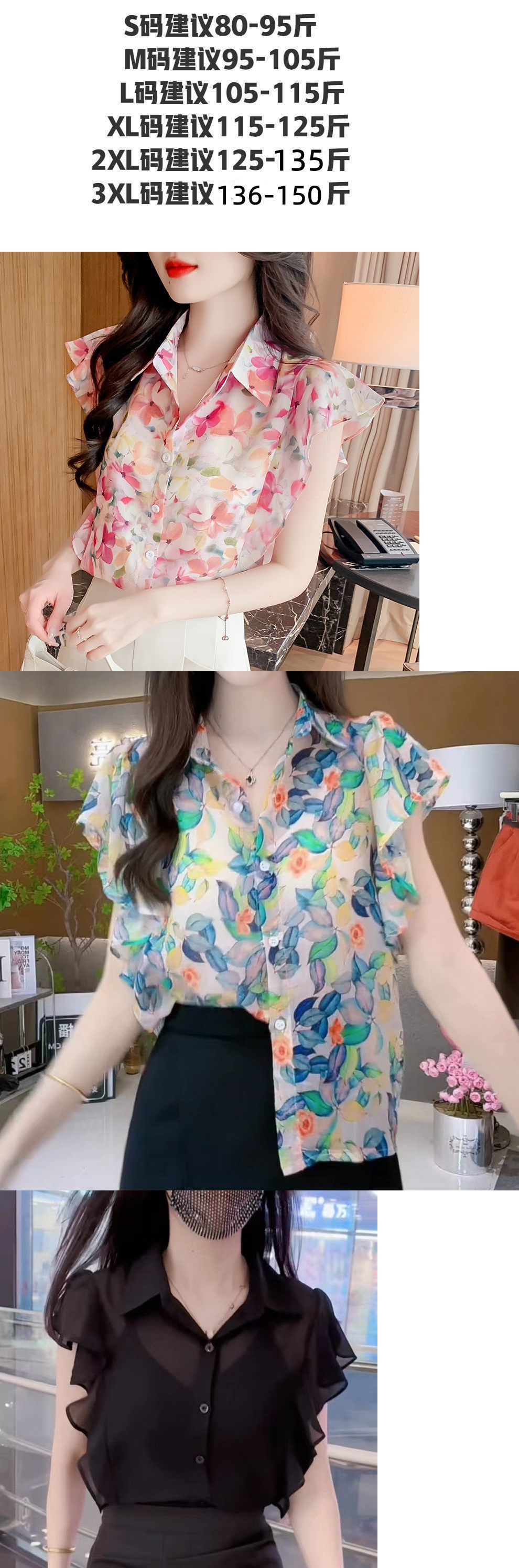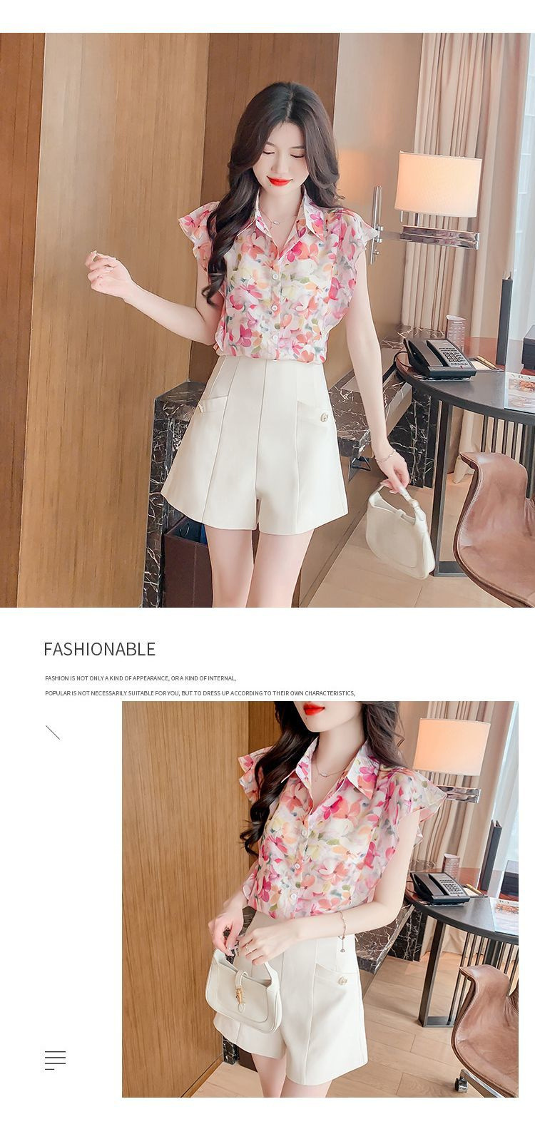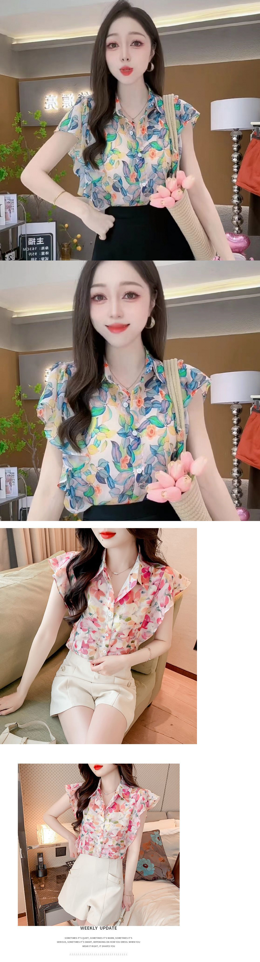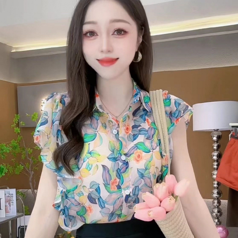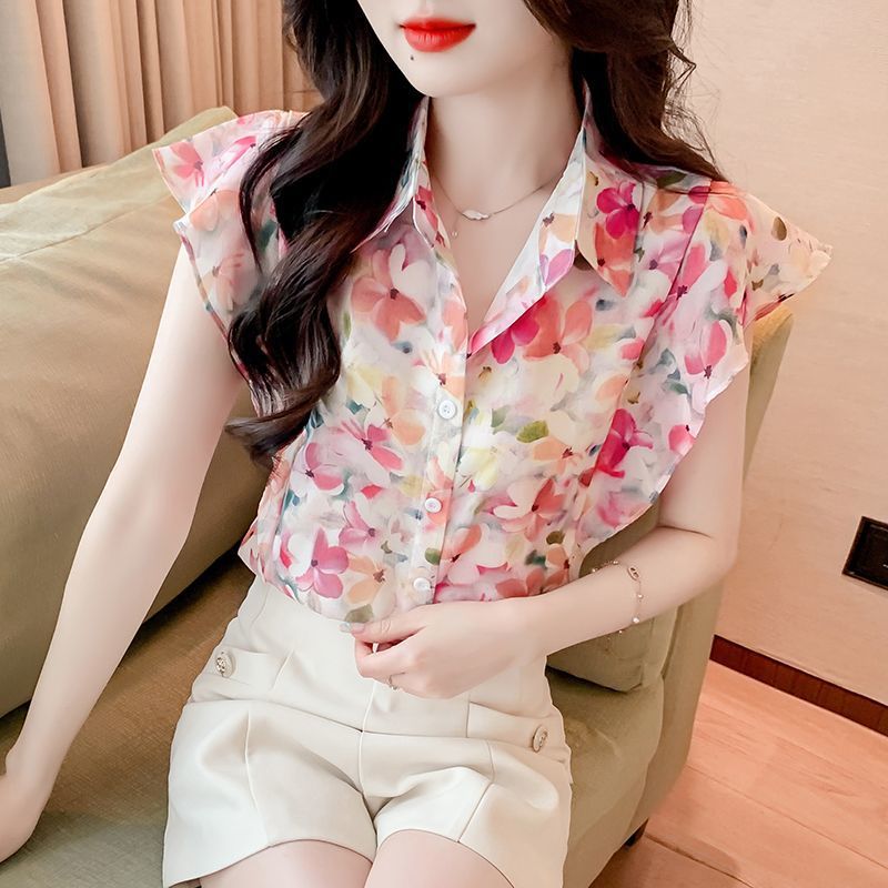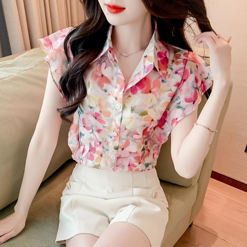 여름 여성을 위한 달콤한 프린트 쉬폰/폴리에스터(폴리에스터) 셔츠, 새로운 스타일, 독특하고 시크한 셔츠, 루즈하고 깨끗한 셔츠스토어 가기