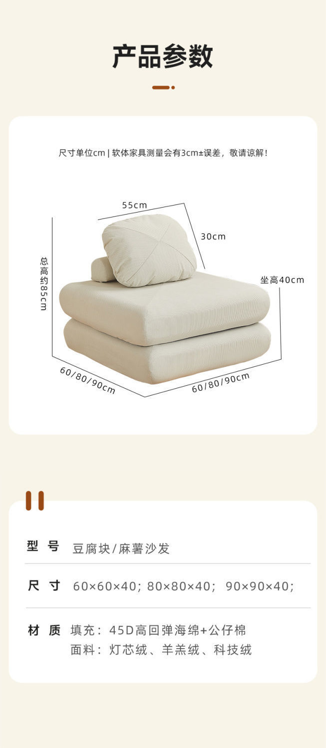 게으른 소파 소파 베드 두부 블록 거실 분리형 및 세탁 가능한 패브릭 소파 모찌 작은 아파트 싱글 침실 다다미