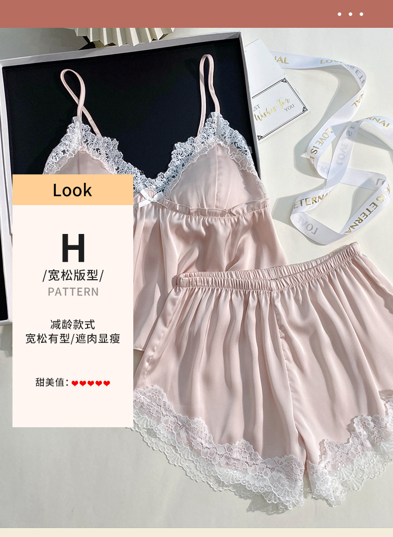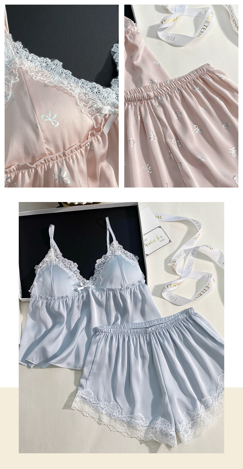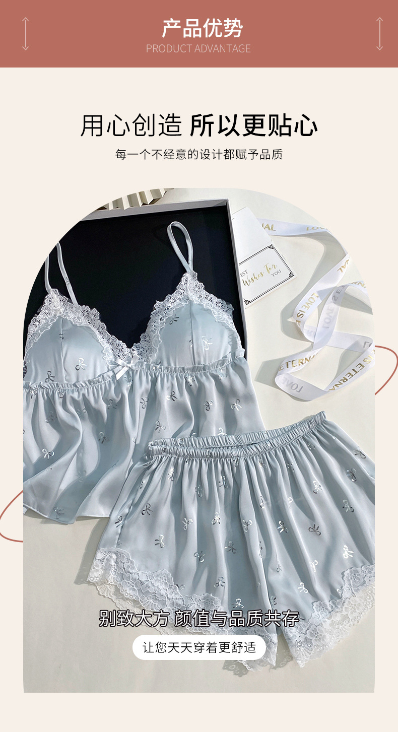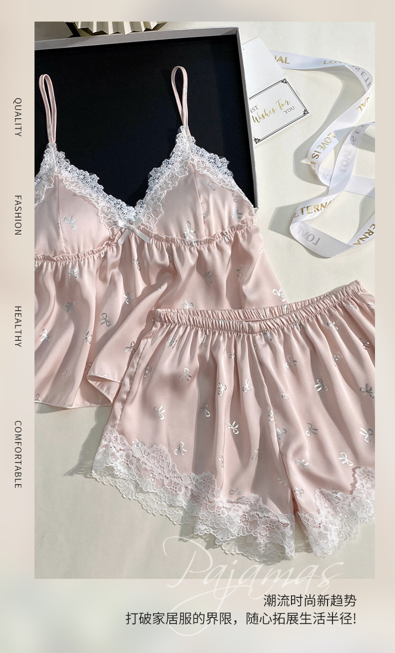 여름 신상 여성용 실크 슬립 잠옷 세트, 실버 프린팅 실크 슬립 반바지, 편안한 홈웨어 투피스 세트스토어 가기