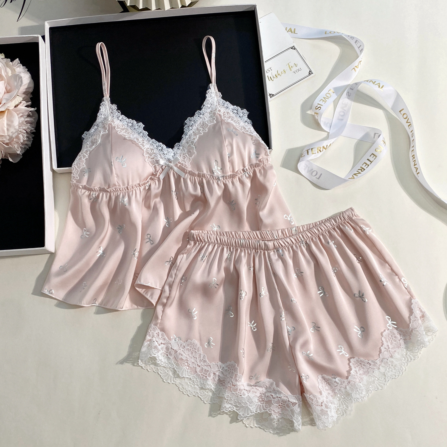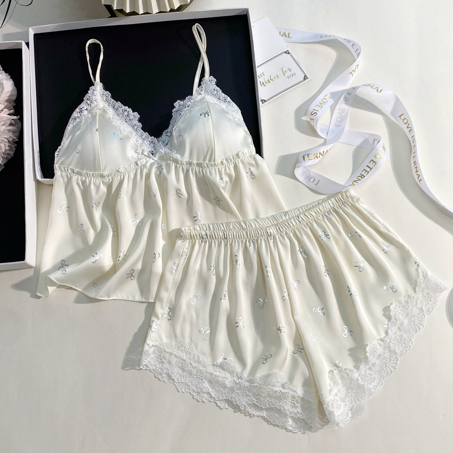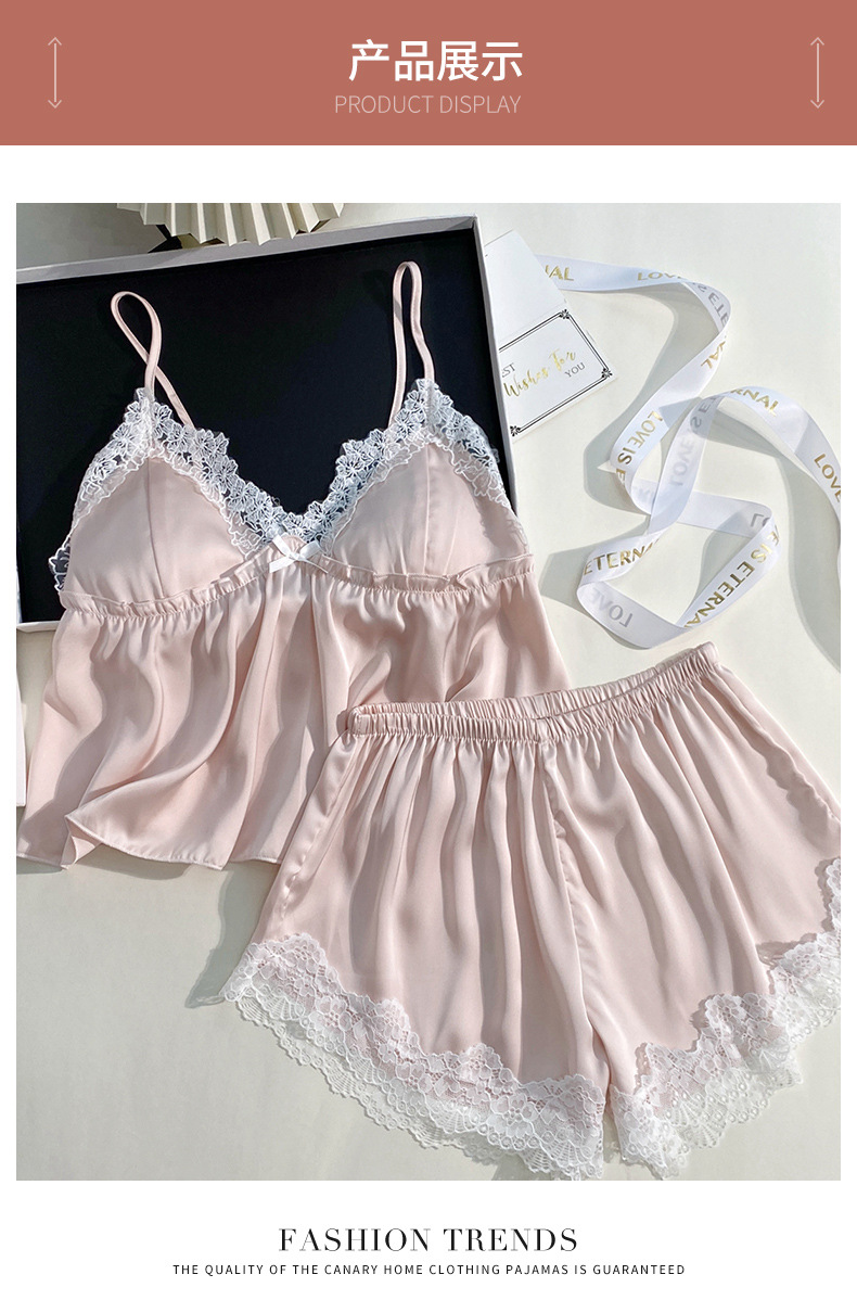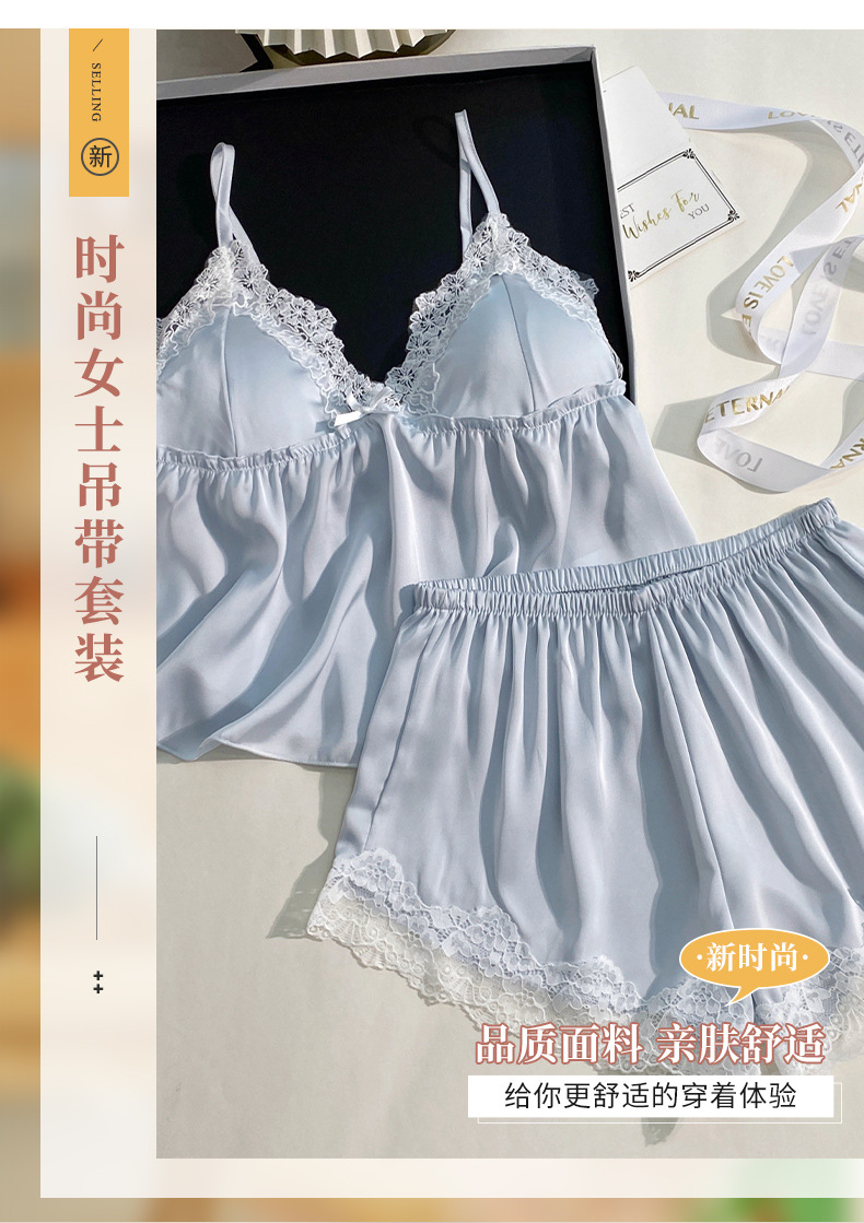 여름 신상 여성용 실크 슬립 잠옷 세트, 실버 프린팅 실크 슬립 반바지, 편안한 홈웨어 투피스 세트스토어 가기