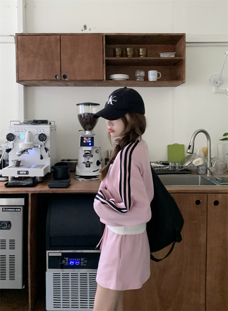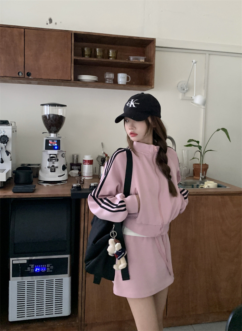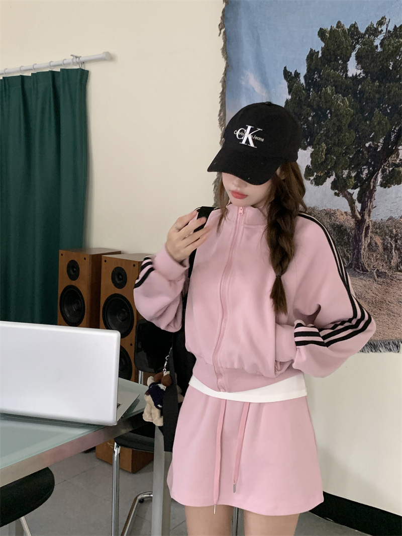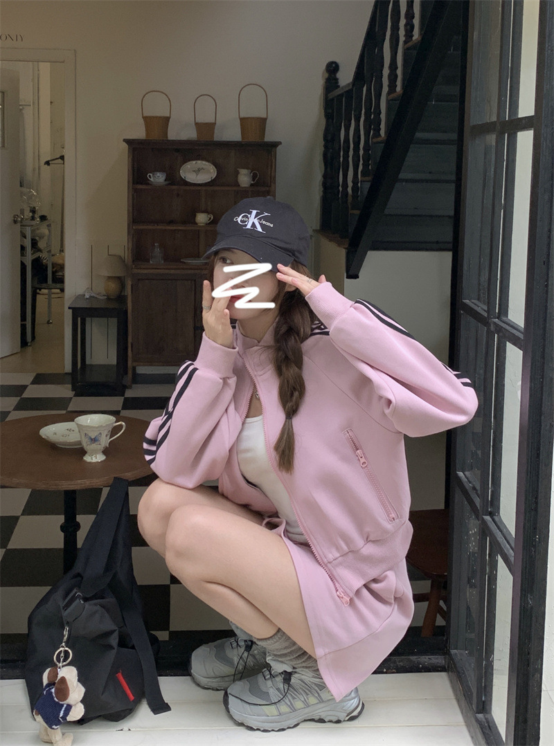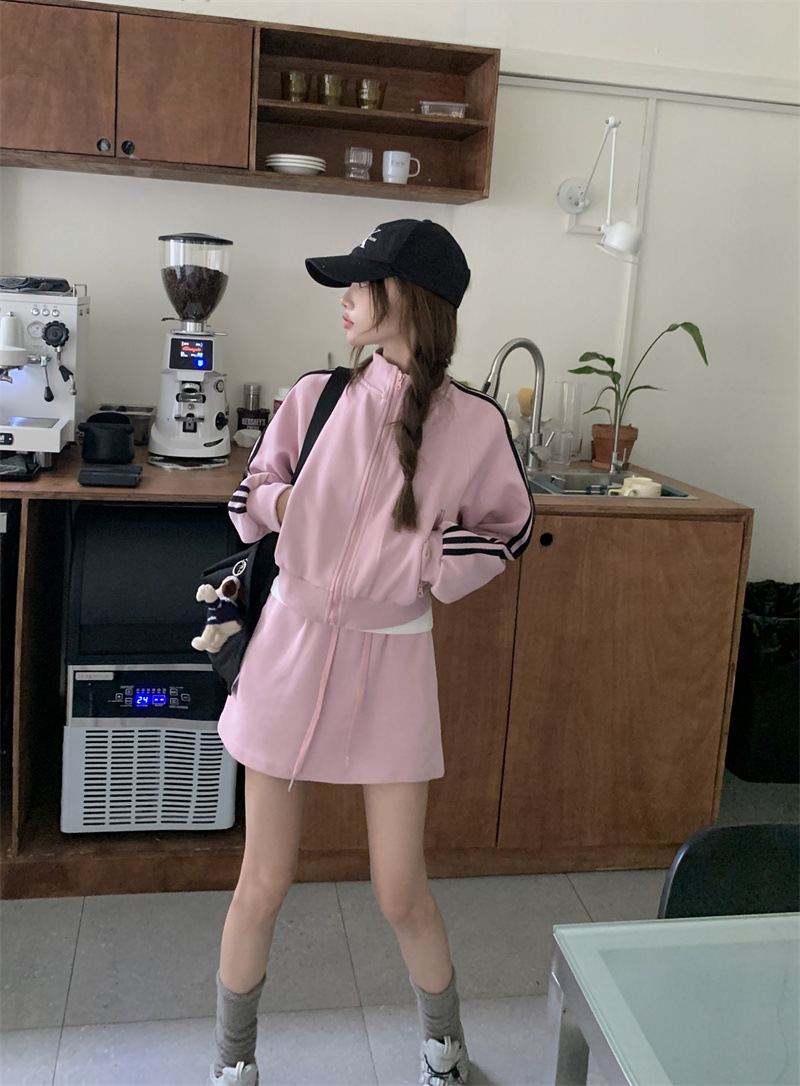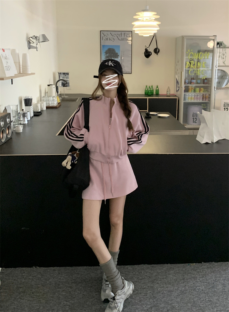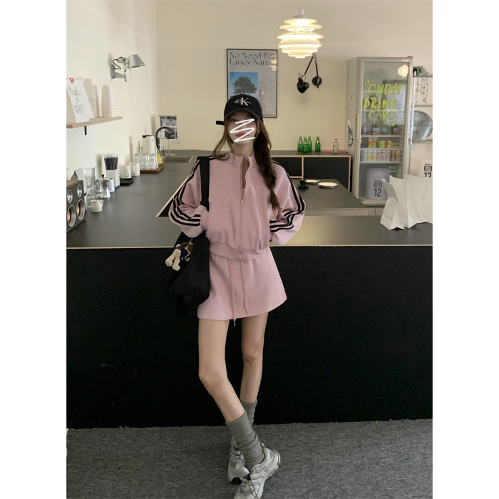 여성을위한 한국 캐주얼 다목적 정장 여름 2024 새로운 대비 색상 핑크 스웨트 셔츠 재킷 하프 스커트 투피스 세트