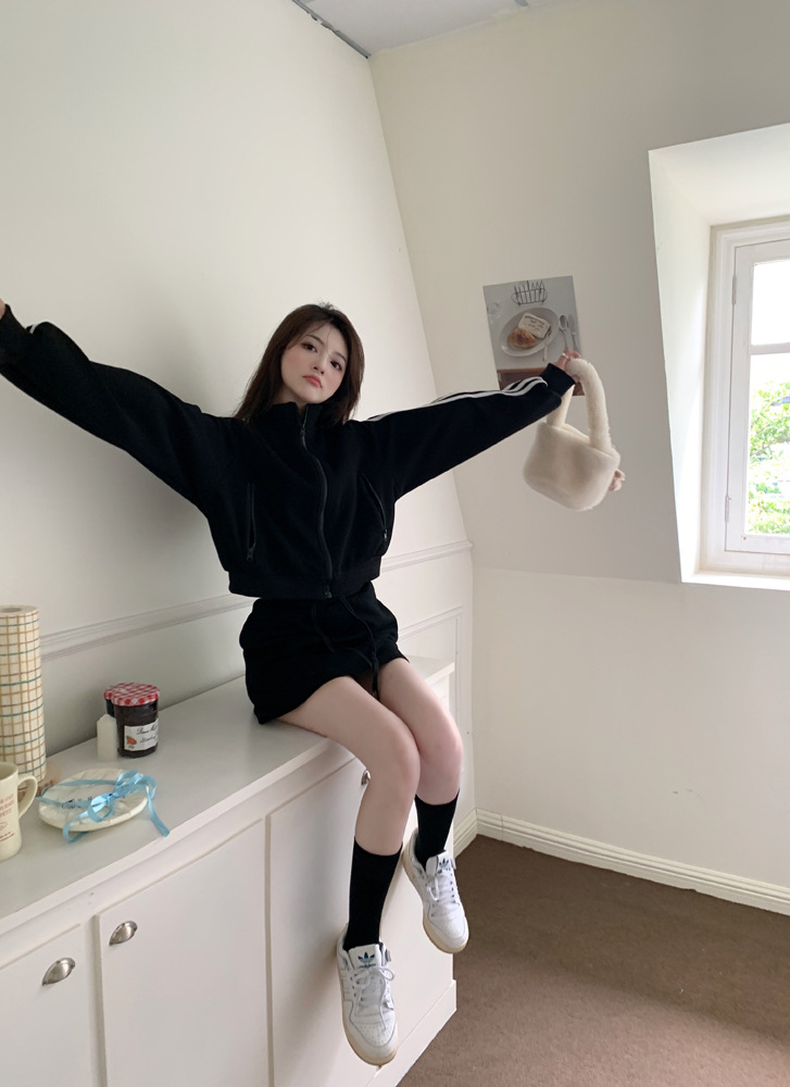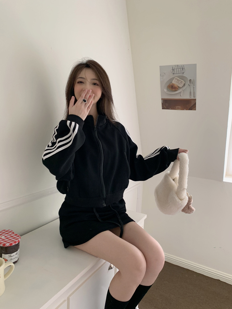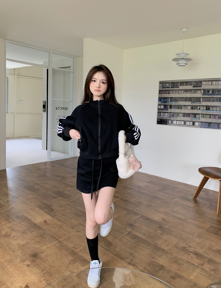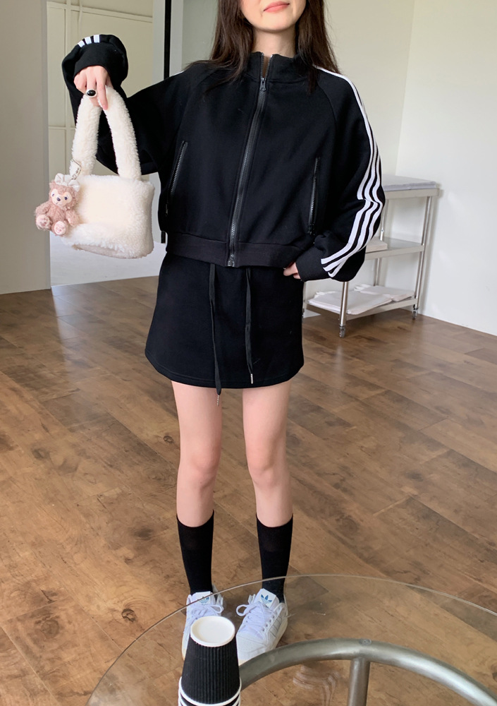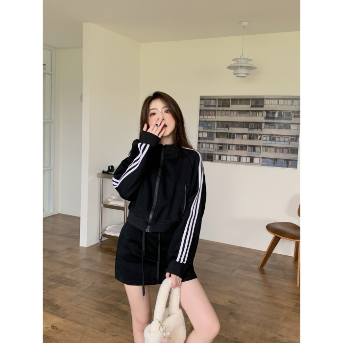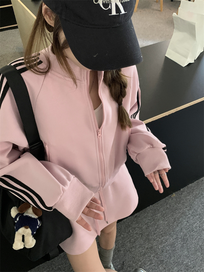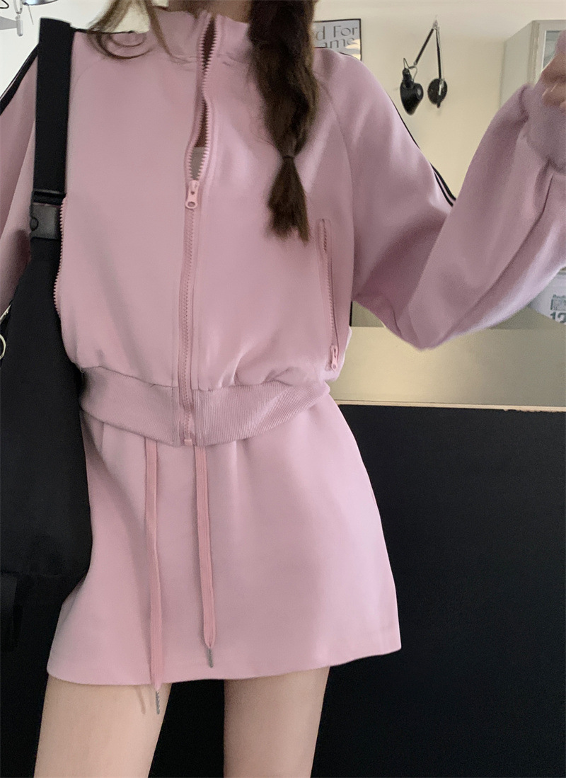 여성을위한 한국 캐주얼 다목적 정장 여름 2024 새로운 대비 색상 핑크 스웨트 셔츠 재킷 하프 스커트 투피스 세트