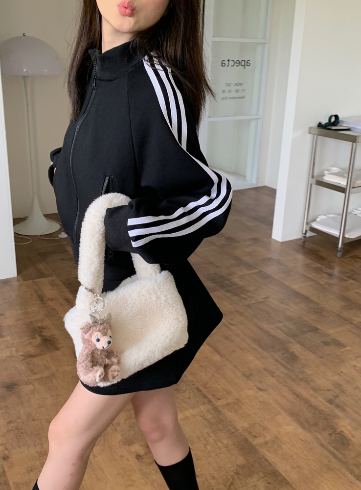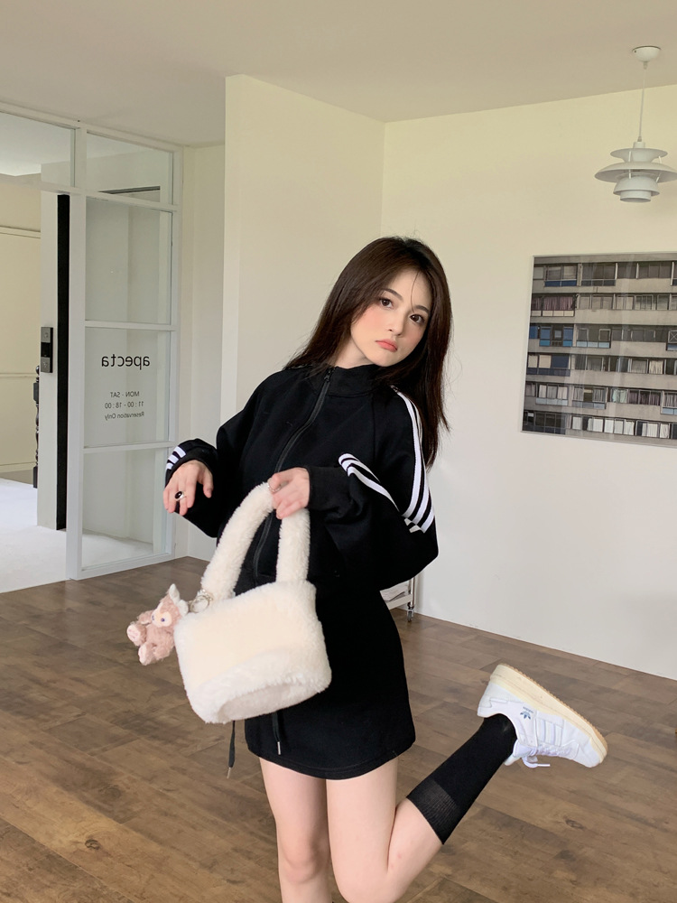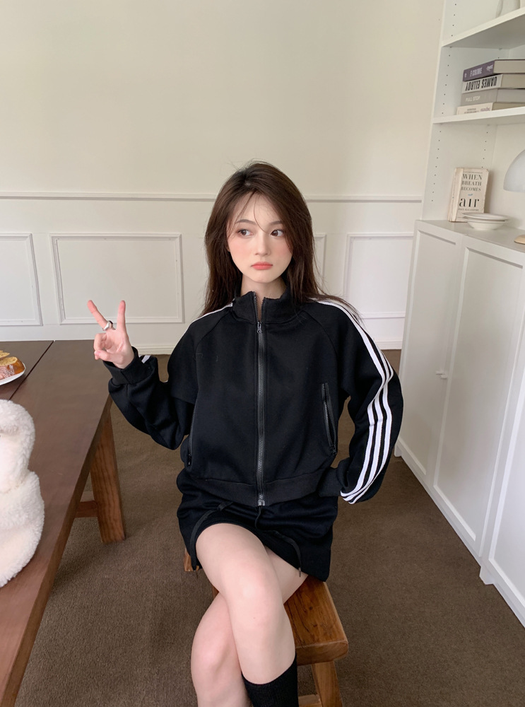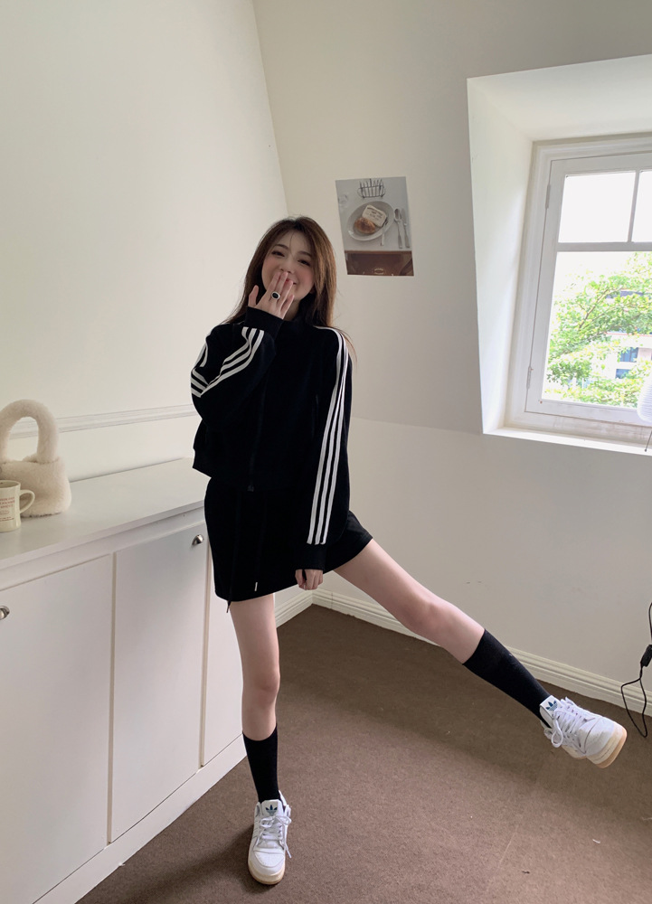 여성을위한 한국 캐주얼 다목적 정장 여름 2024 새로운 대비 색상 핑크 스웨트 셔츠 재킷 하프 스커트 투피스 세트스토어 가기