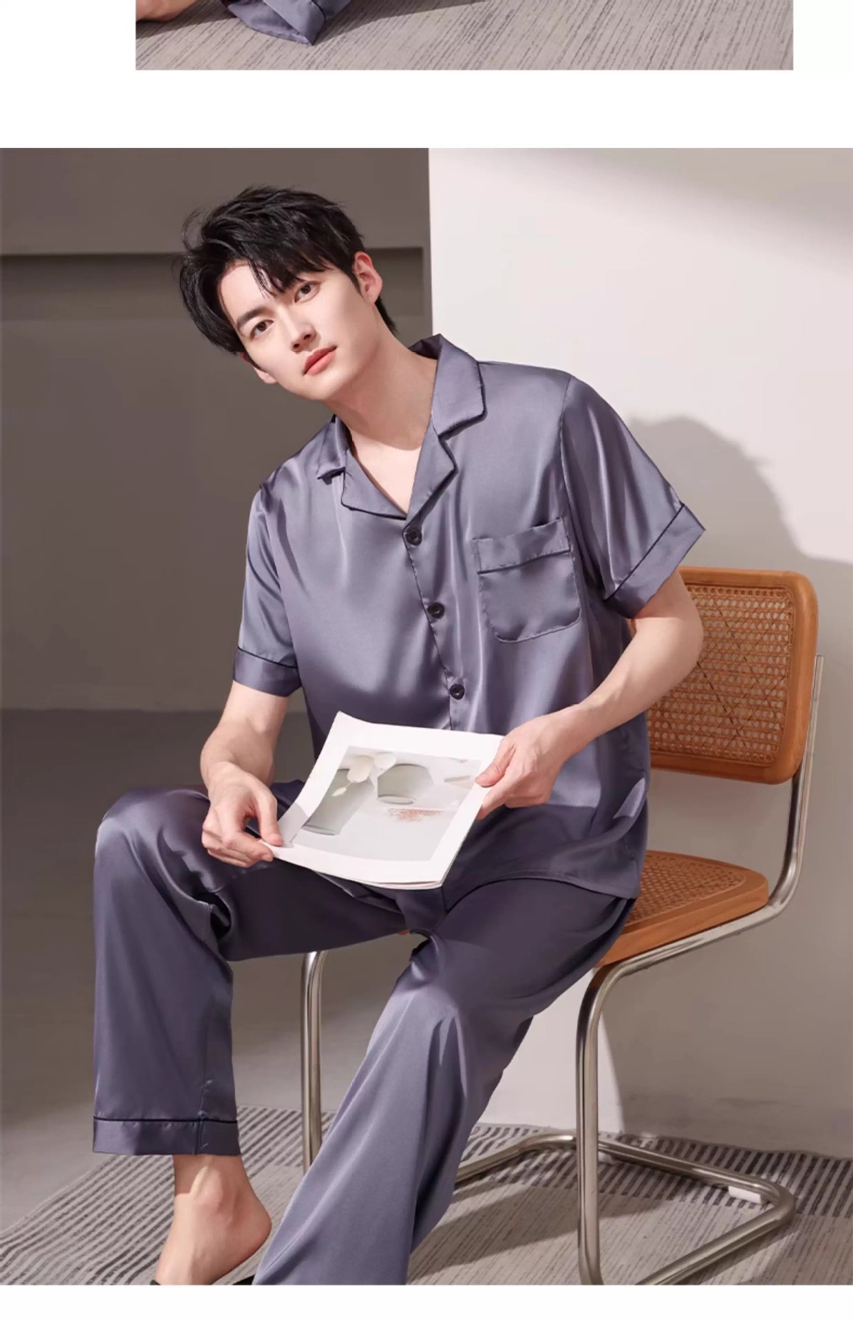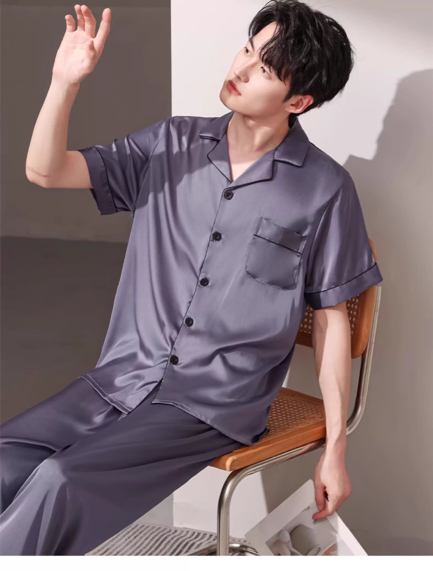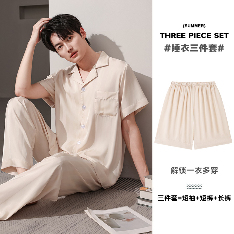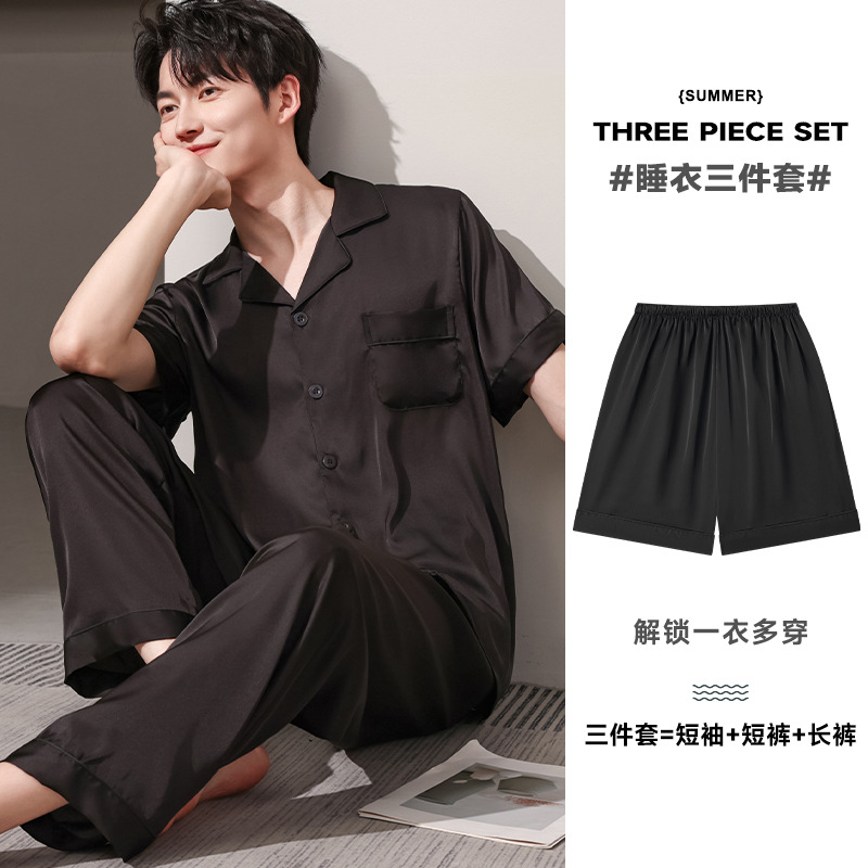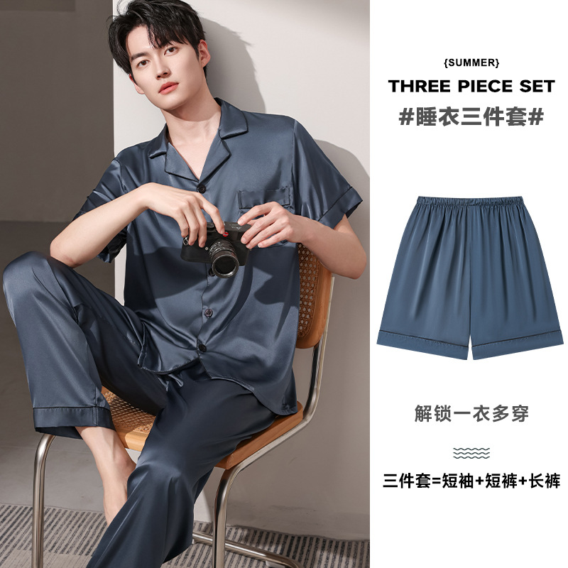 새로운 남성 잠옷 여름 얇은 얼음 실크 반팔 반바지 바지 3 피스 세트 시뮬레이션 실크 대형 홈웨어스토어 가기