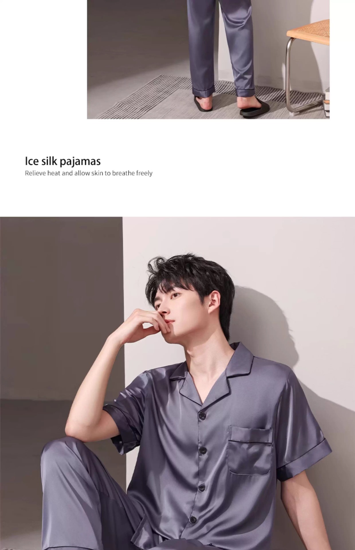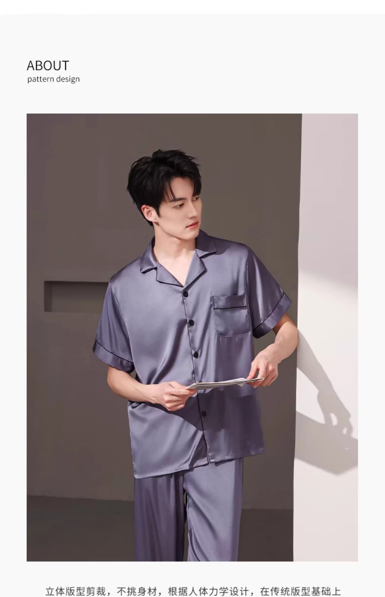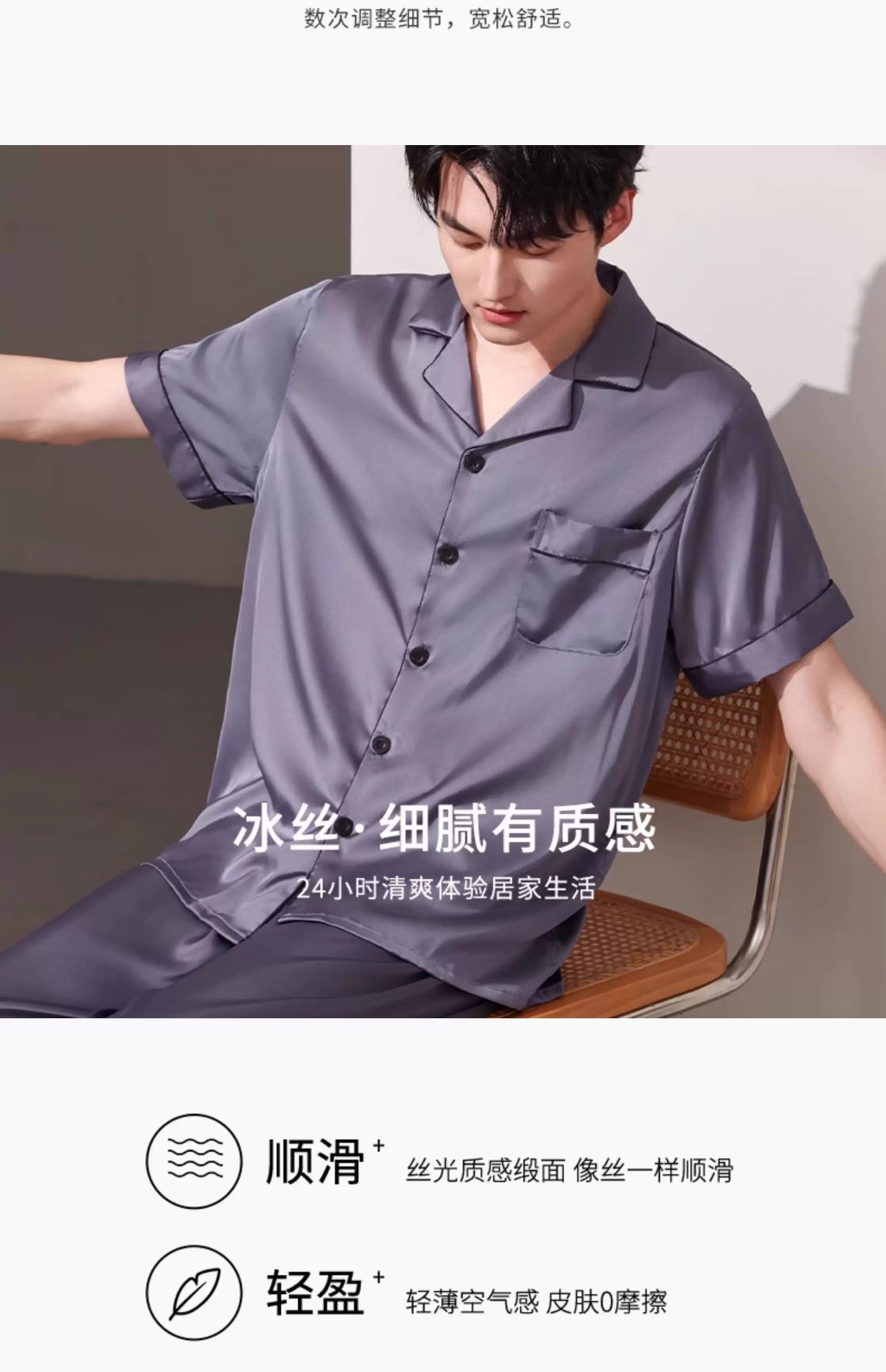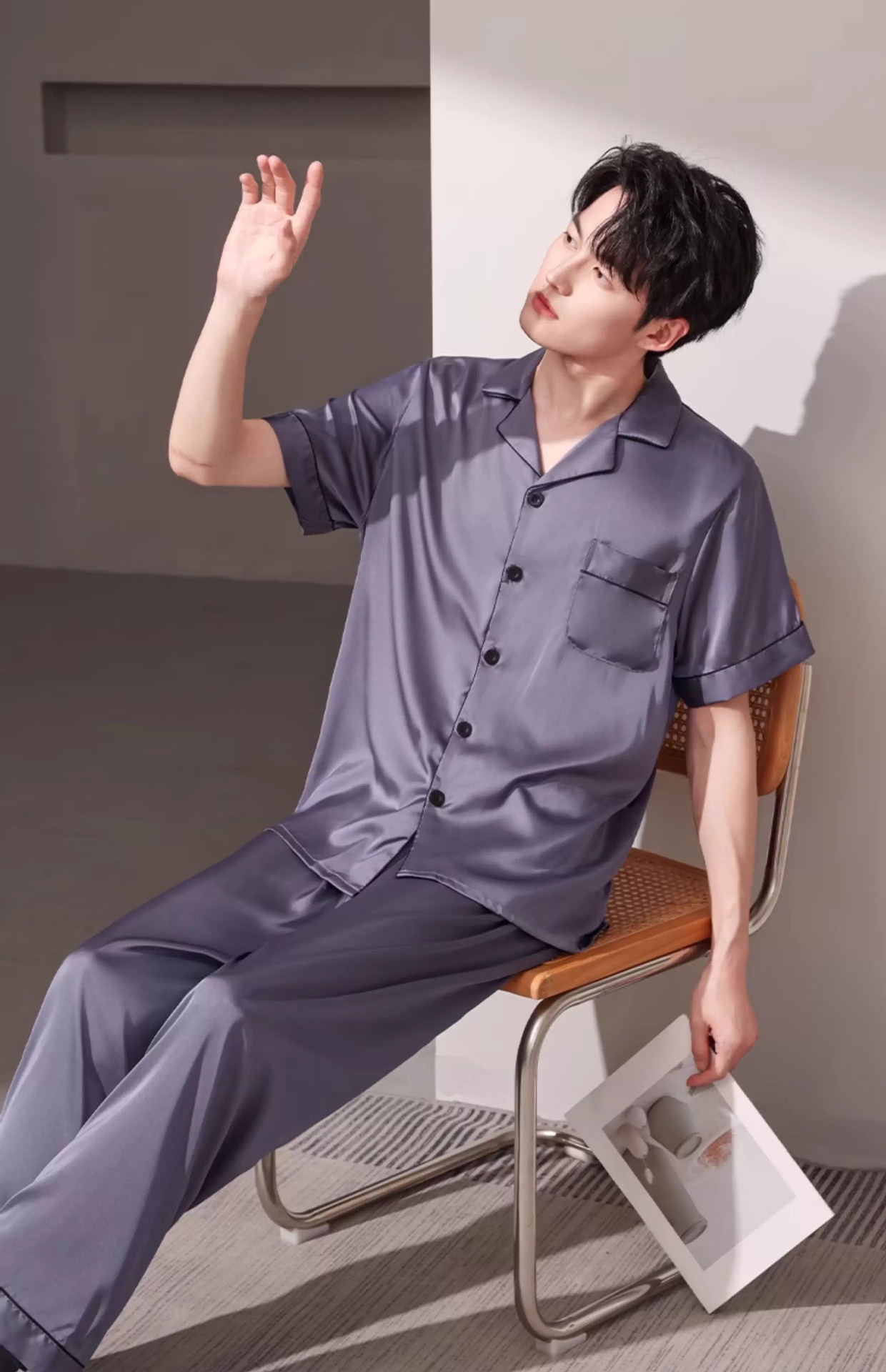 새로운 남성 잠옷 여름 얇은 얼음 실크 반팔 반바지 바지 3 피스 세트 시뮬레이션 실크 대형 홈웨어스토어 가기