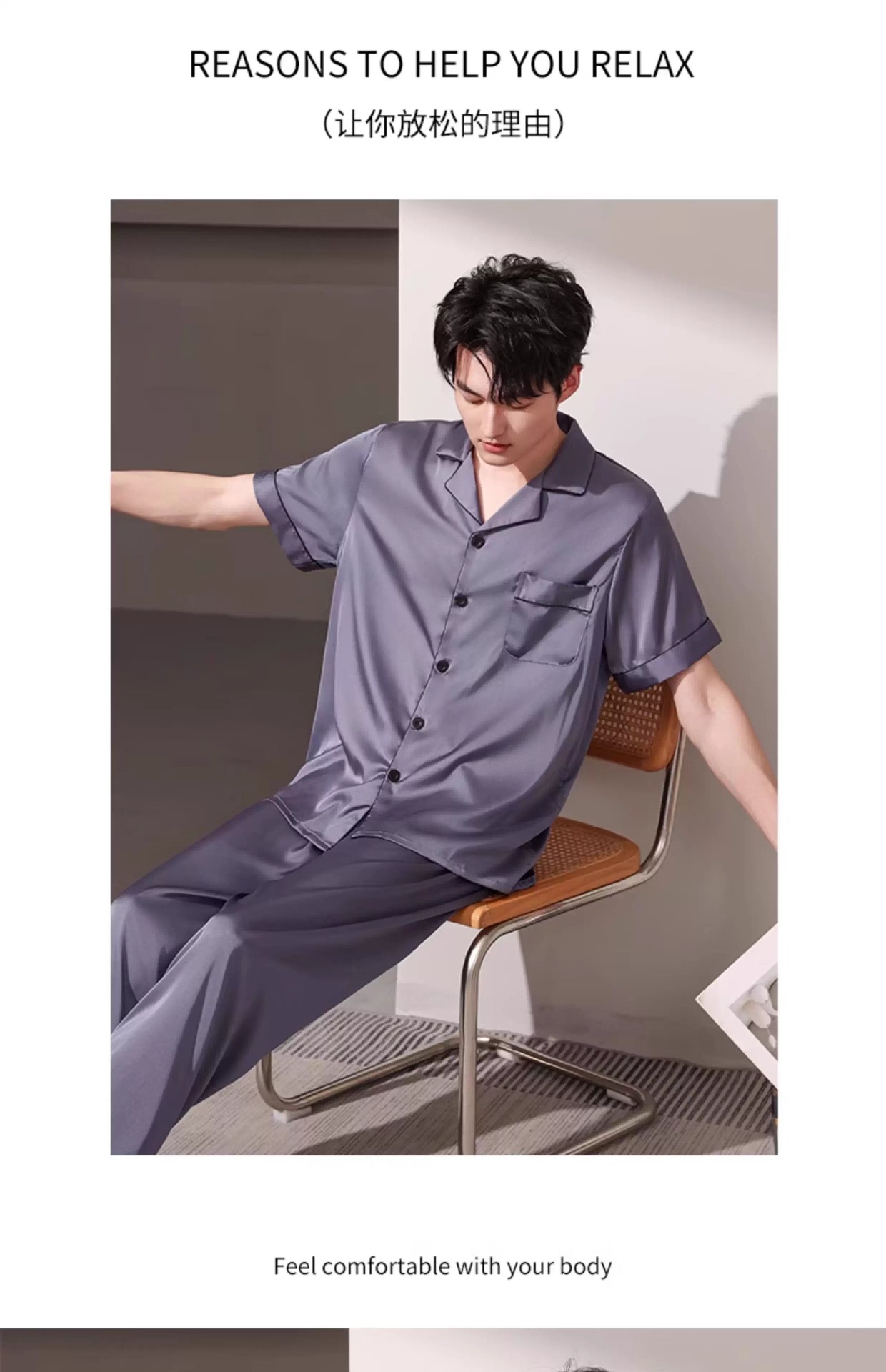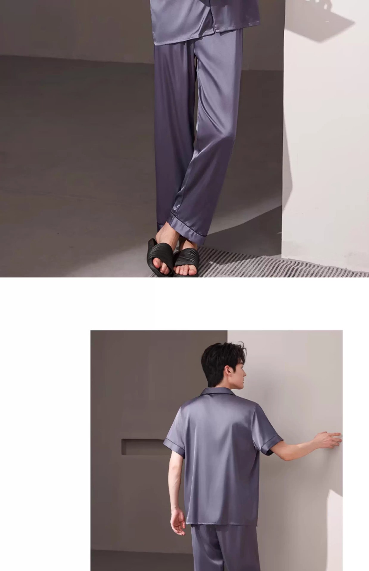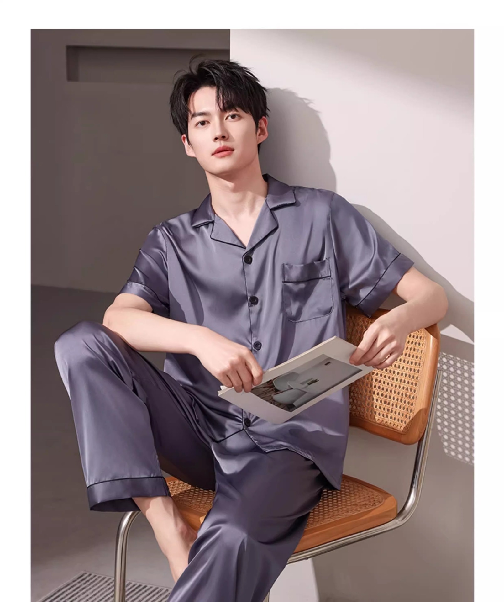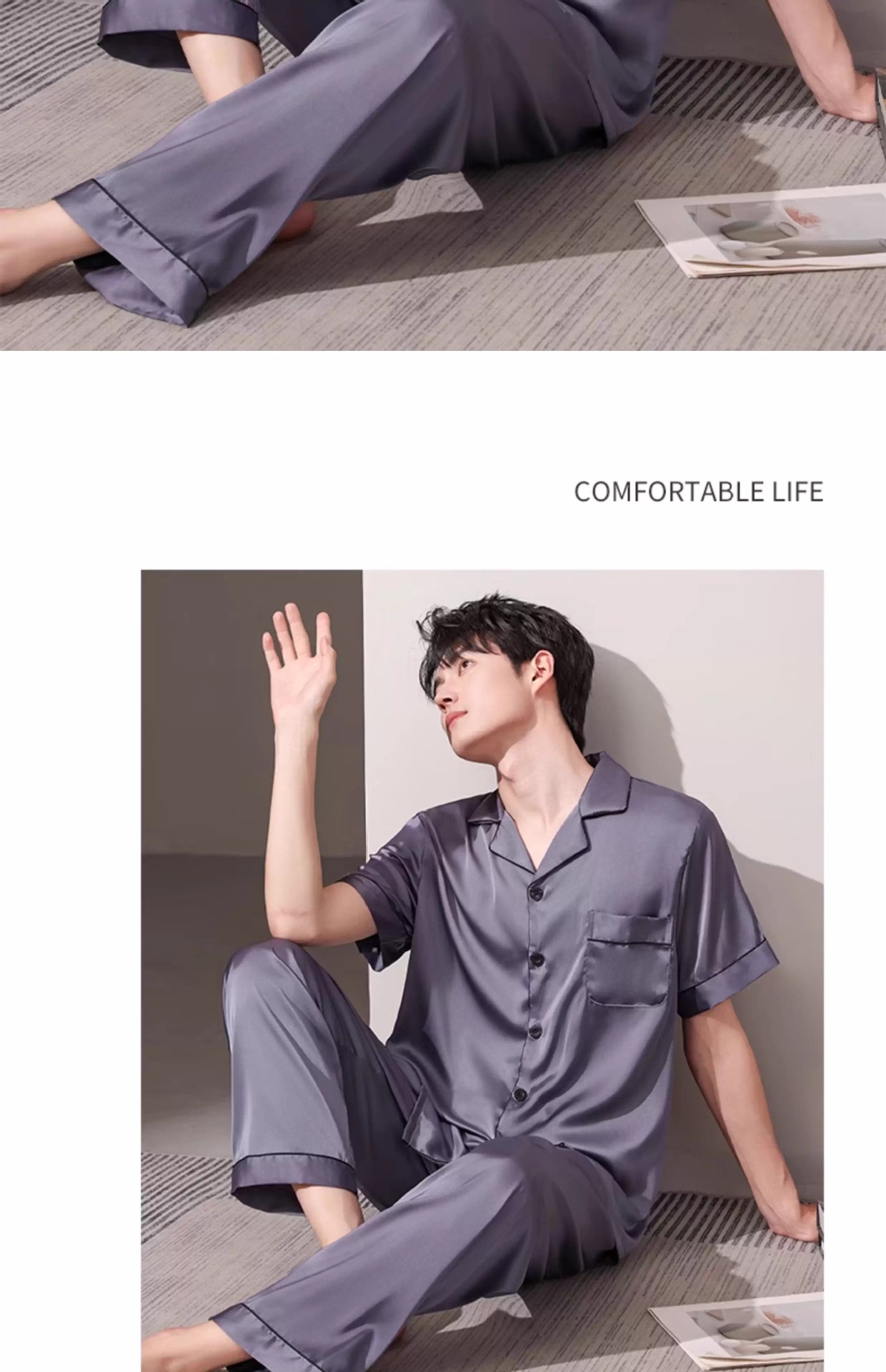 새로운 남성 잠옷 여름 얇은 얼음 실크 반팔 반바지 바지 3 피스 세트 시뮬레이션 실크 대형 홈웨어스토어 가기