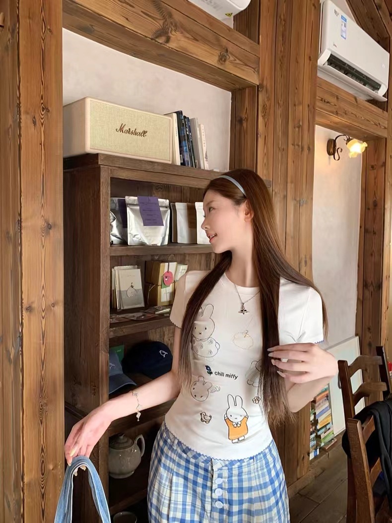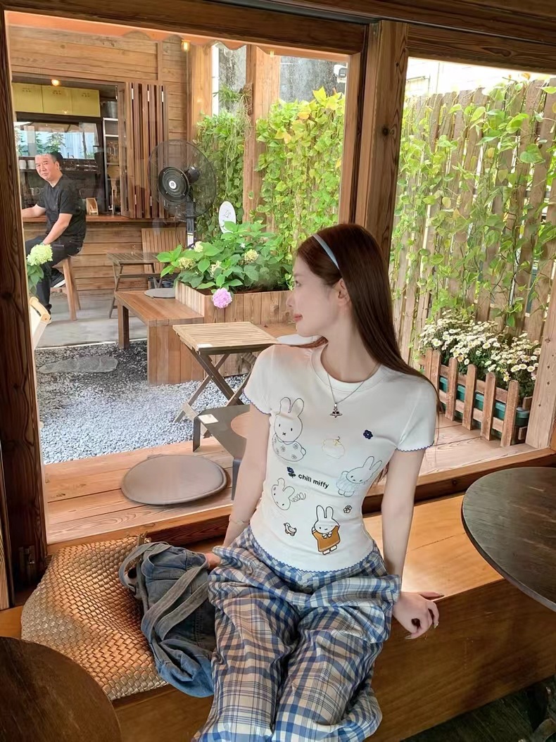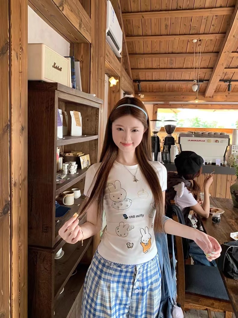 여름 디자인 슬림핏 짧은 스위트 탑 여성용 한국식 흰색 귀여운 토끼 자수 오른쪽 어깨 반팔 티셔츠스토어 가기