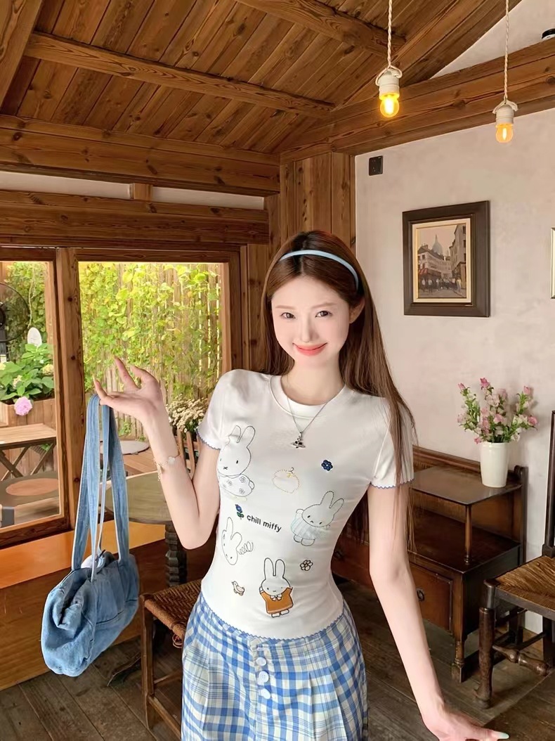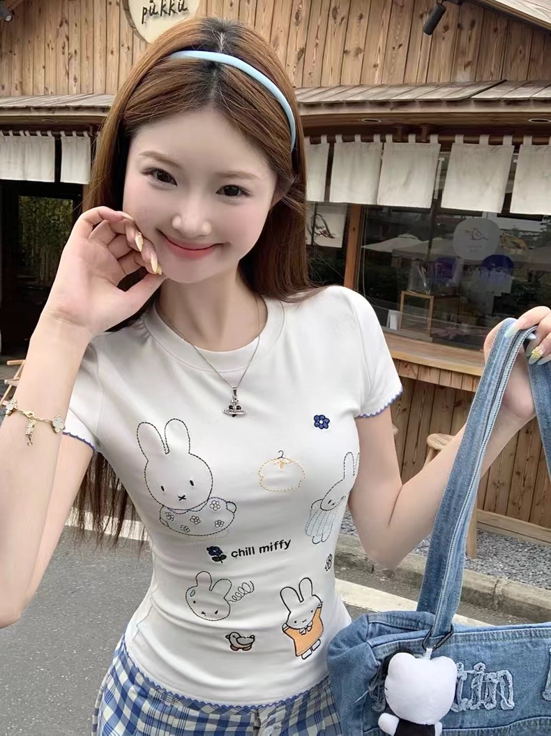 여름 디자인 슬림핏 짧은 스위트 탑 여성용 한국식 흰색 귀여운 토끼 자수 오른쪽 어깨 반팔 티셔츠