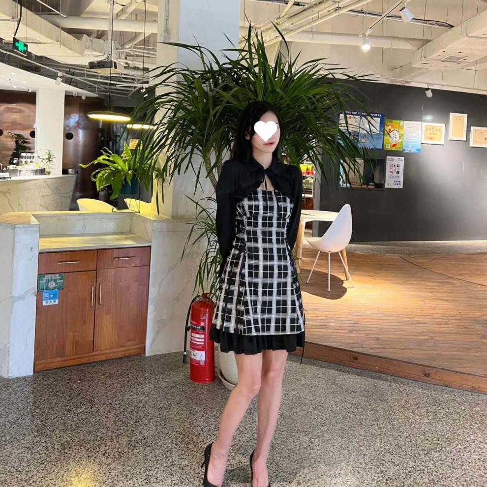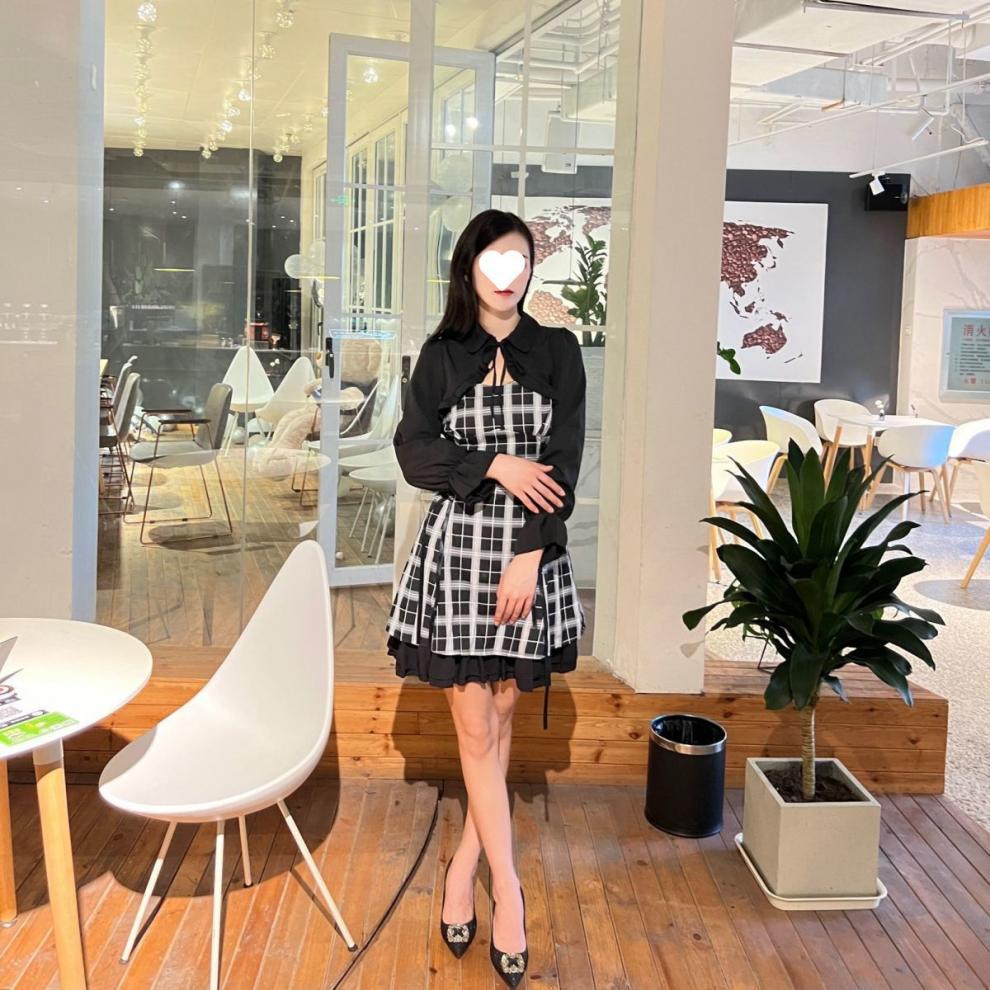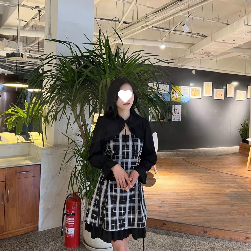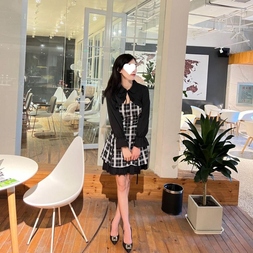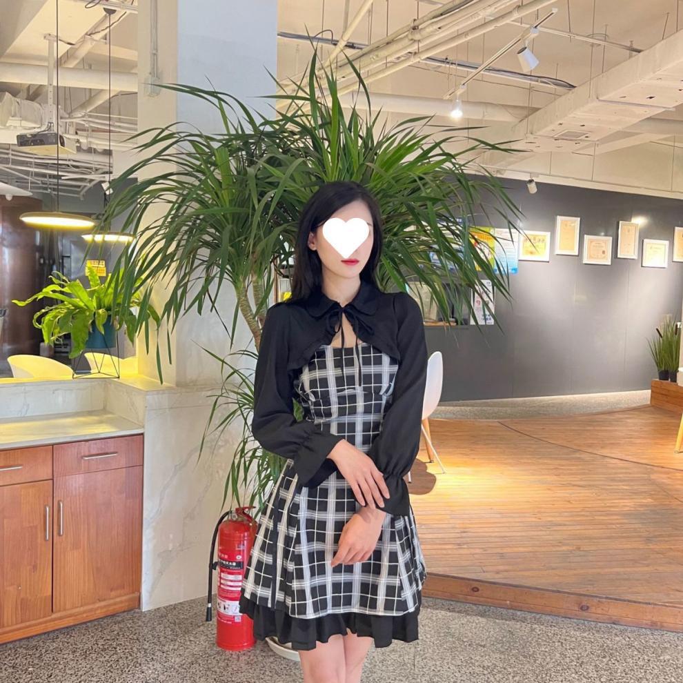 S2Clinjou2024 여름 달콤한 쉬폰 카디건 정장 흑백 격자 무늬 서스펜더 드레스 여성용 투피스 세트스토어 가기