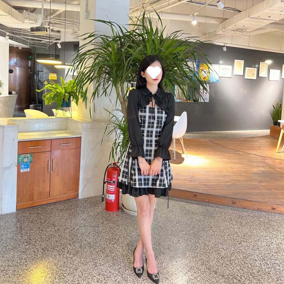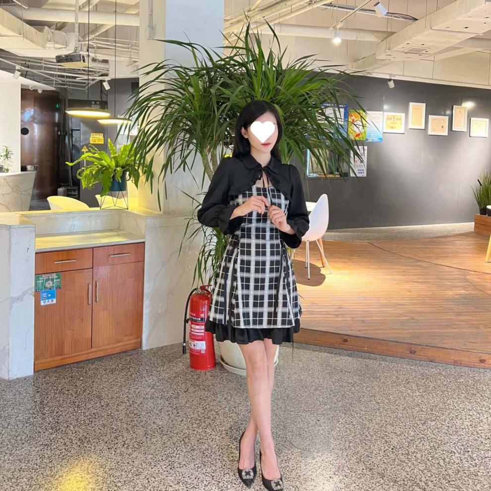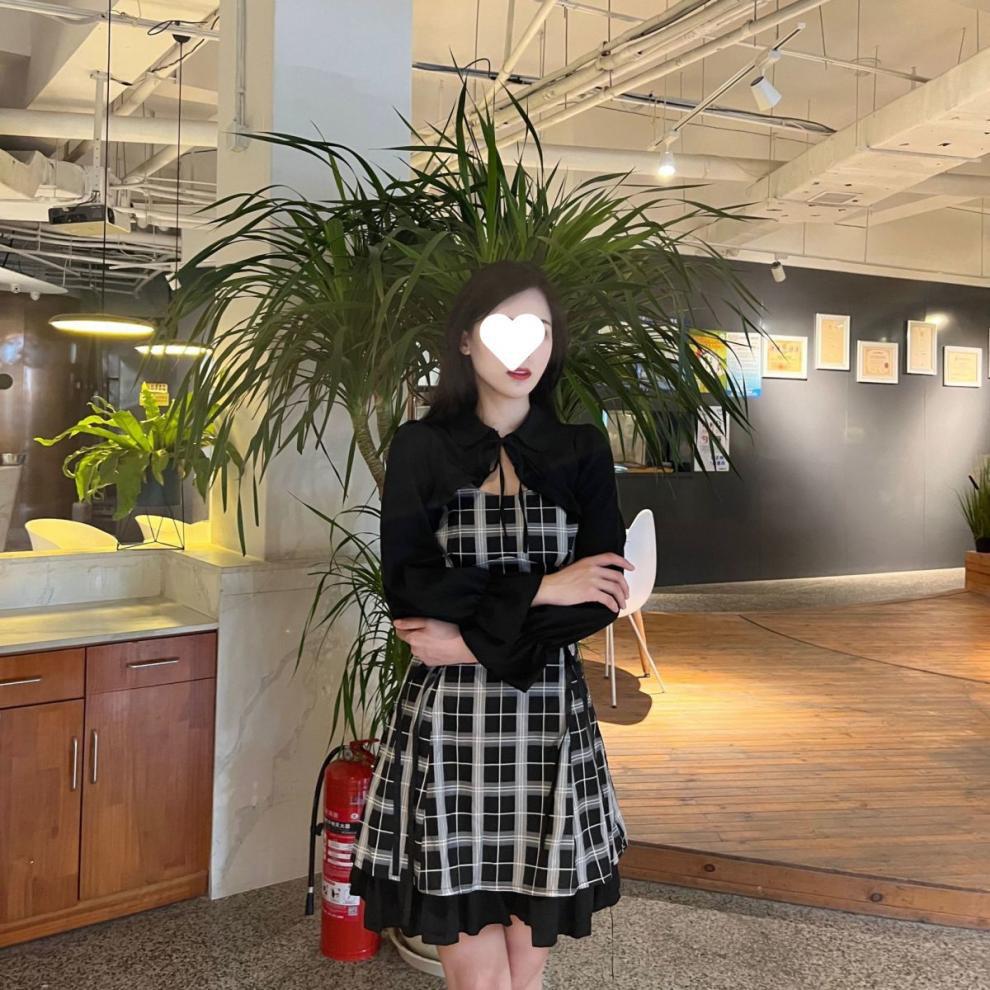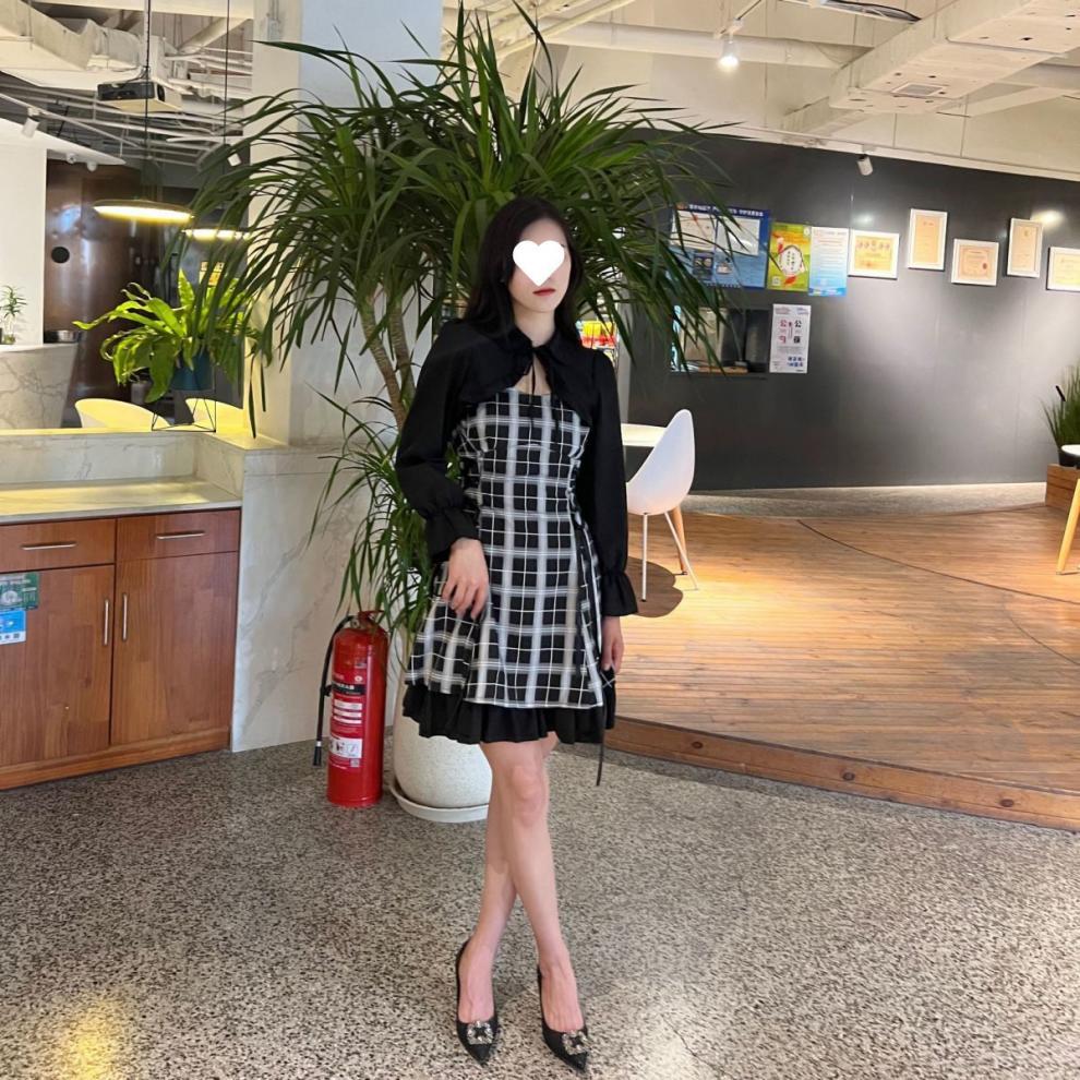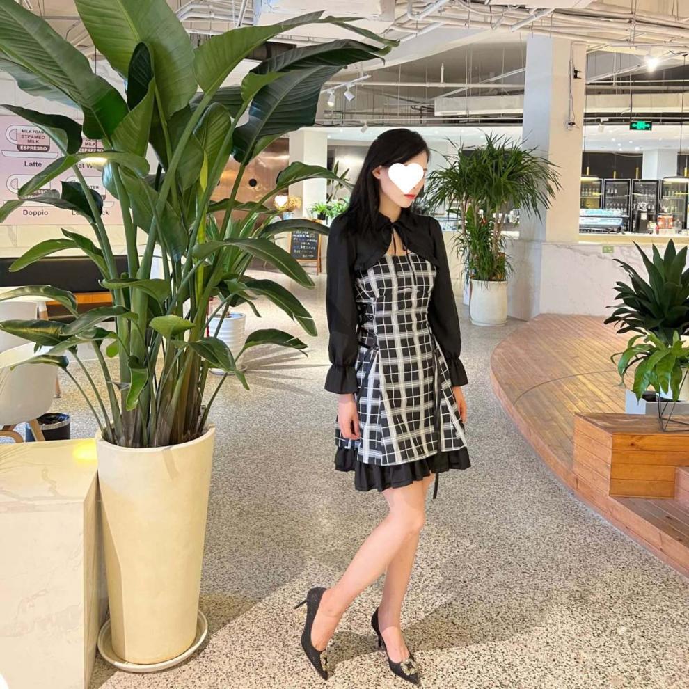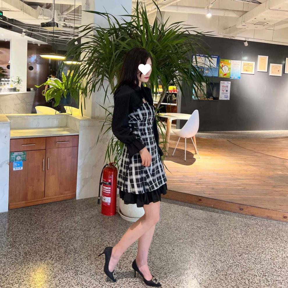 S2Clinjou2024 여름 달콤한 쉬폰 카디건 정장 흑백 격자 무늬 서스펜더 드레스 여성용 투피스 세트스토어 가기