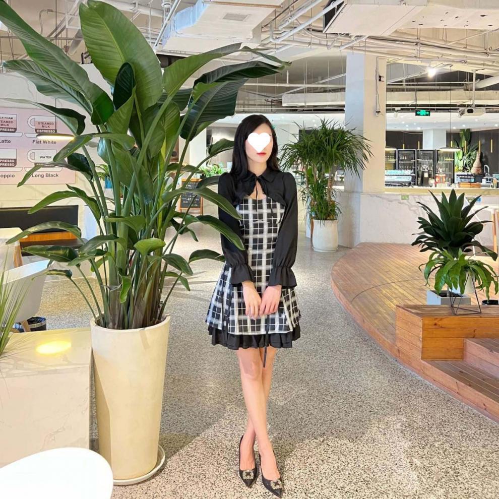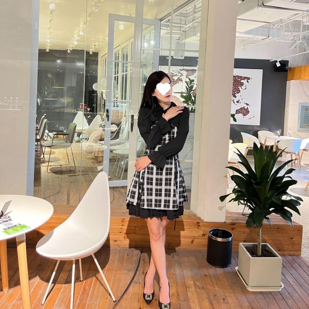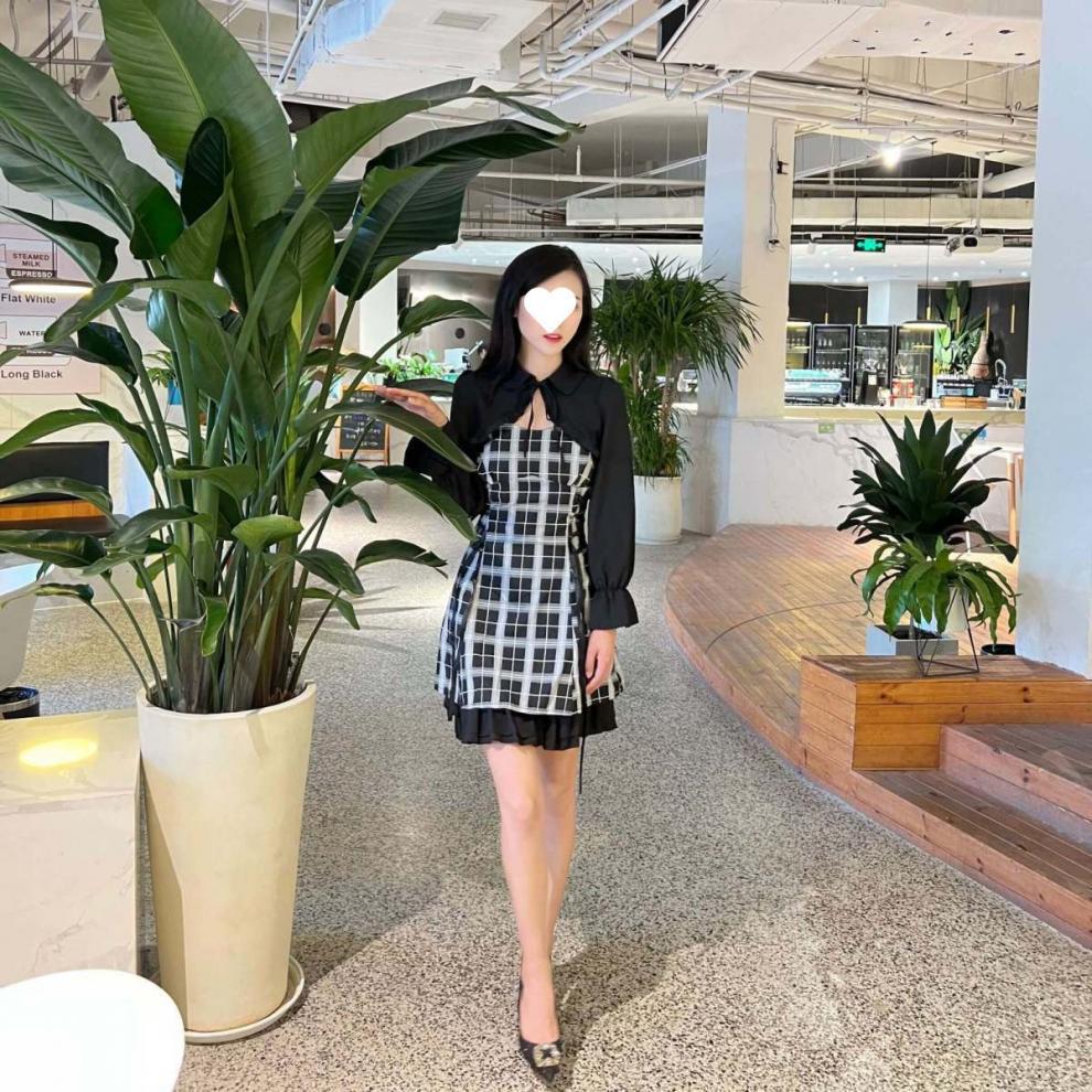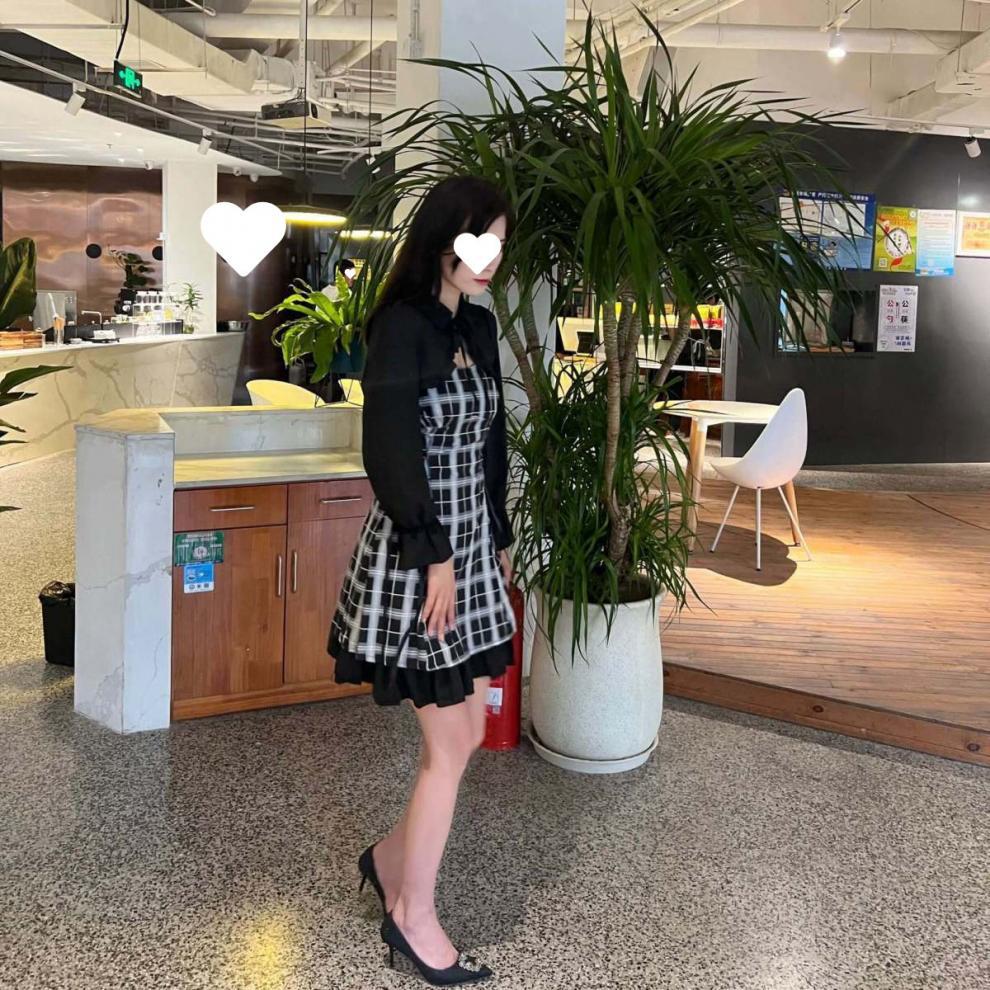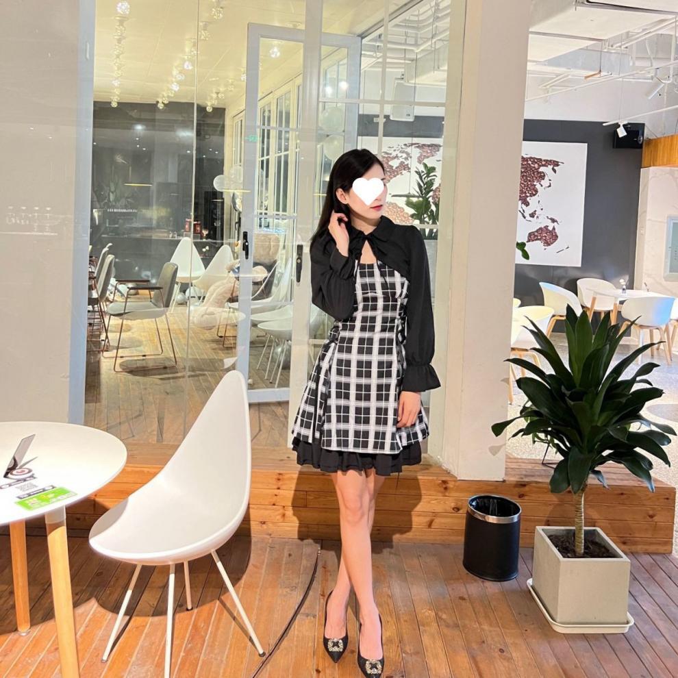 S2Clinjou2024 여름 달콤한 쉬폰 카디건 정장 흑백 격자 무늬 서스펜더 드레스 여성용 투피스 세트스토어 가기