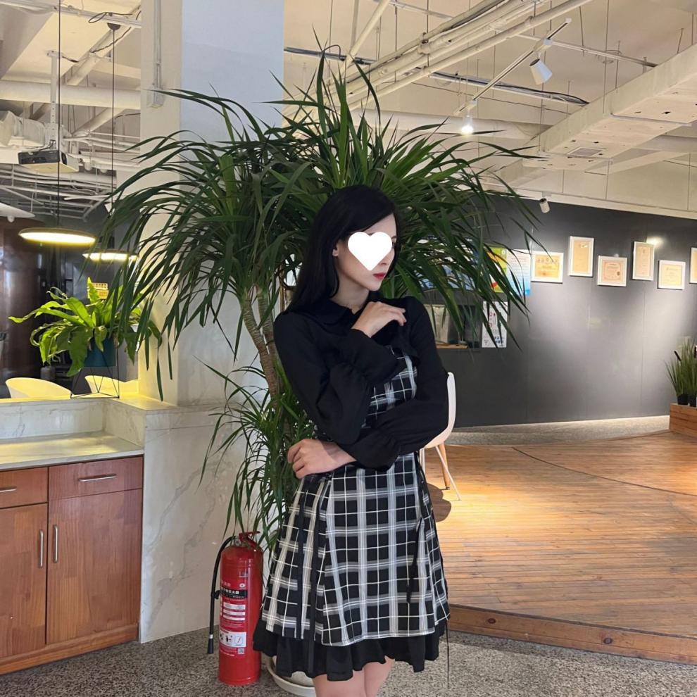 • 블랙 체크무늬 서스펜더 스커트+가디건