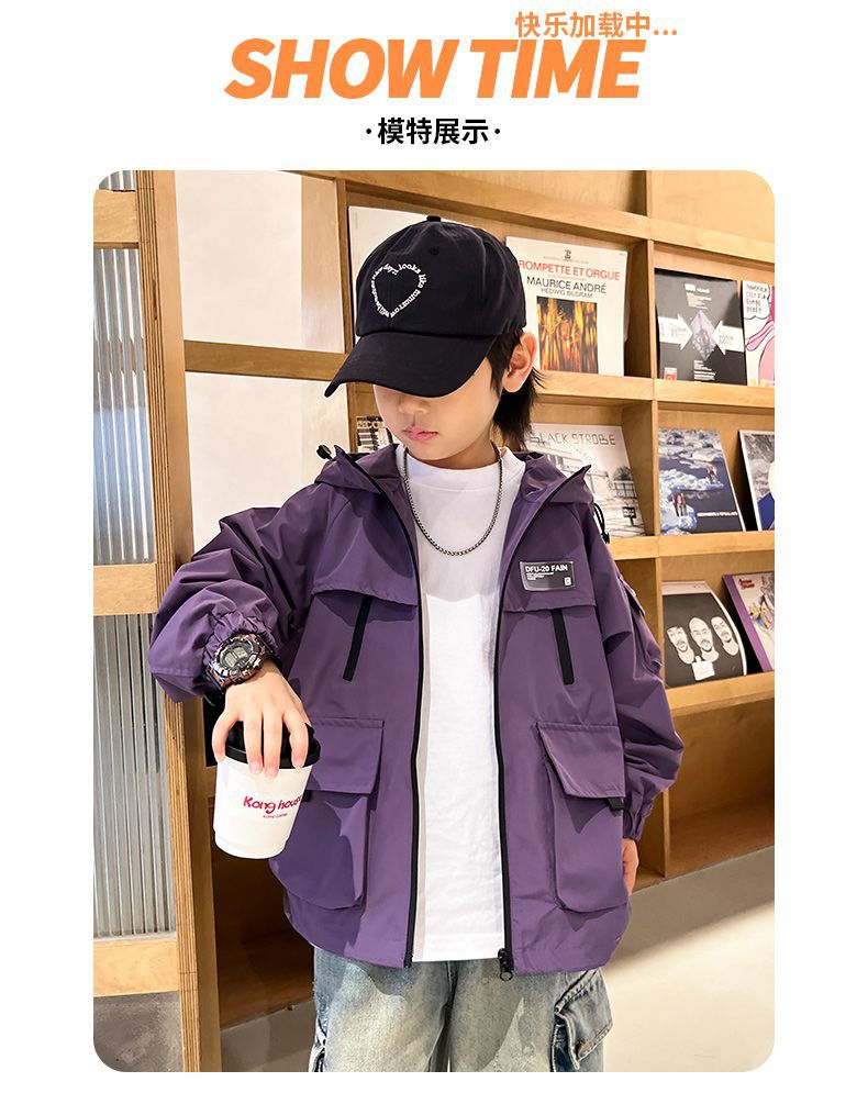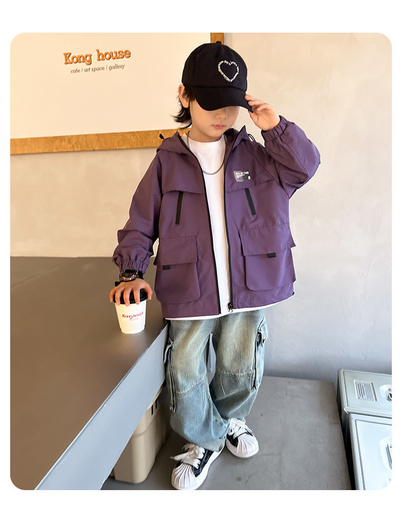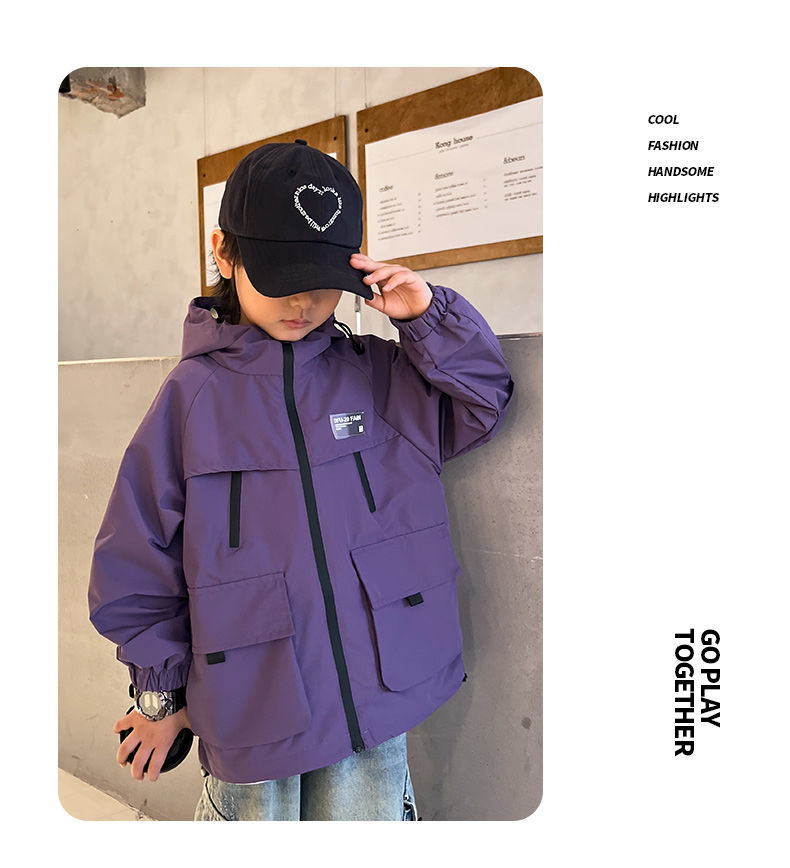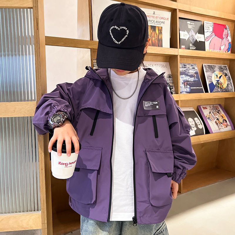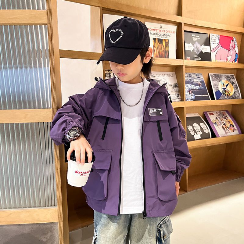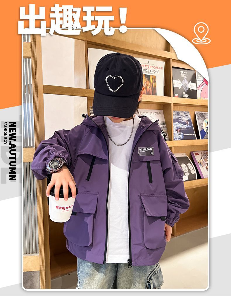 소년 가을 스타일 보라색 작업 재킷 2024 새로운 어린이 후드 재킷 멋진 봄, 가을 유행 브랜드스토어 가기