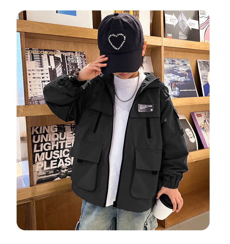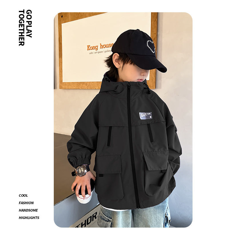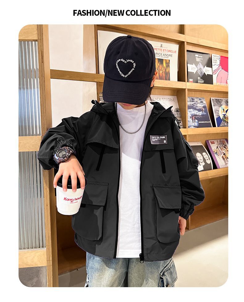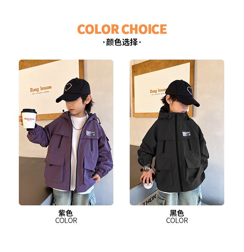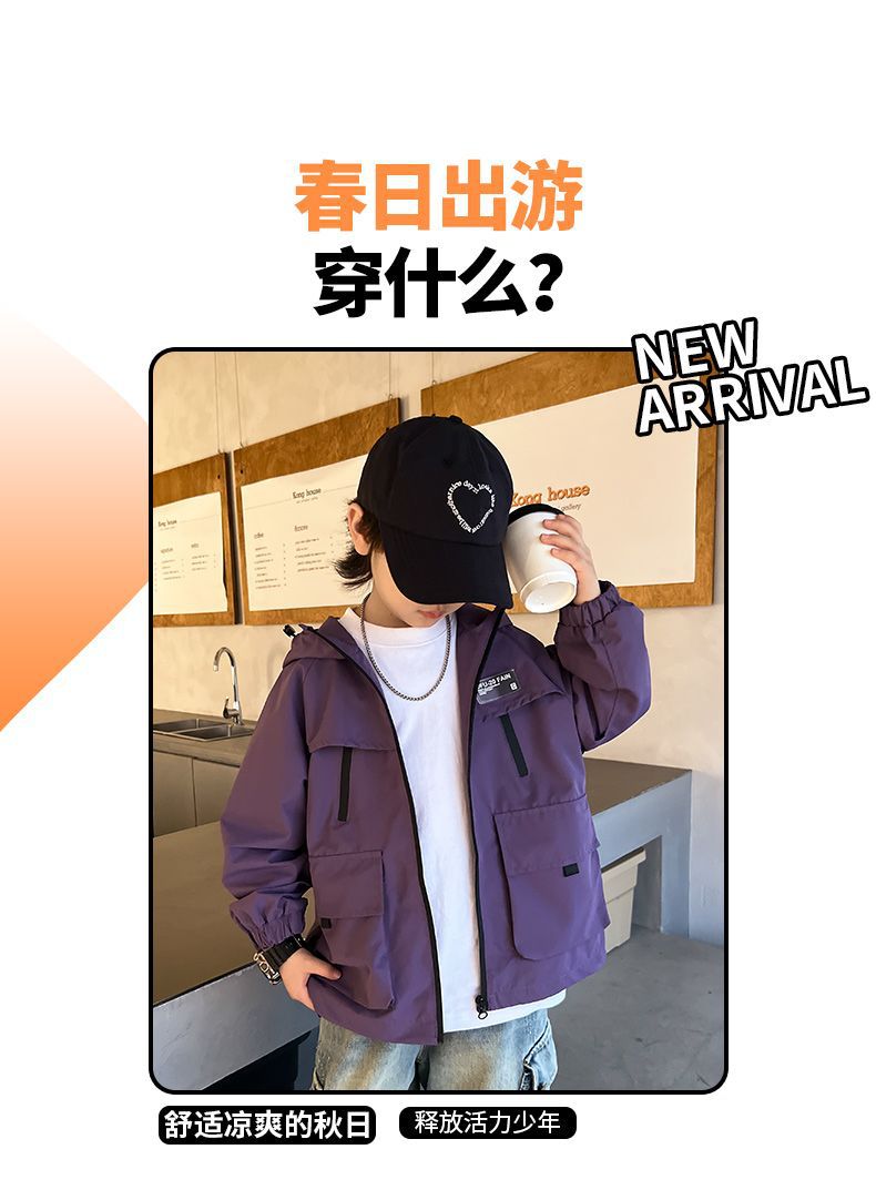 소년 가을 스타일 보라색 작업 재킷 2024 새로운 어린이 후드 재킷 멋진 봄, 가을 유행 브랜드스토어 가기