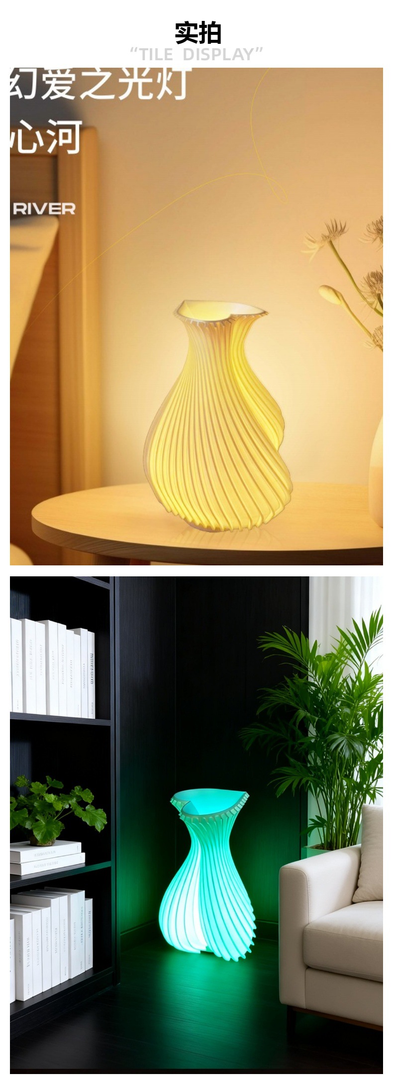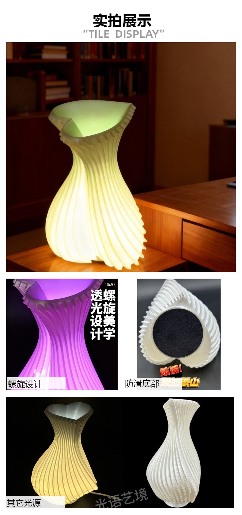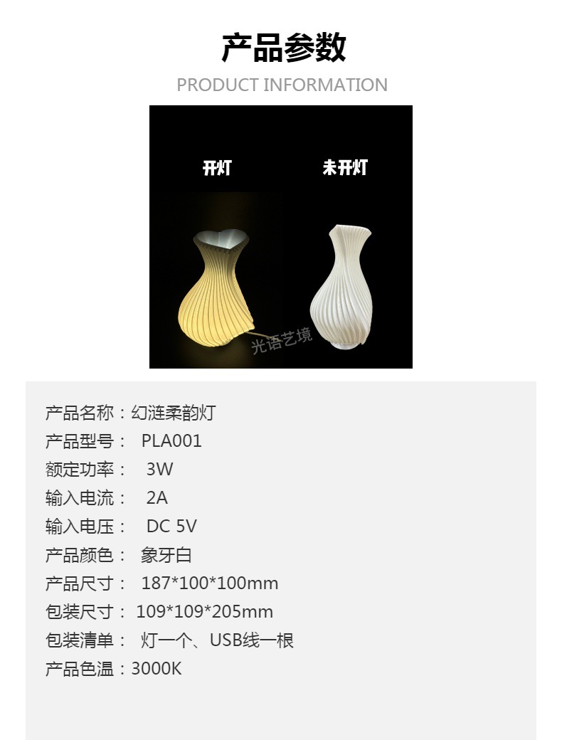 特别提醒:此款3D打印花瓶灯使用PLA环保材料,一灯两用,可以是灯也可以是花瓶,放假花和干花都可以,不建议直接放水养花,因为使用的是环保可降解材料,不能100%保证水分子不渗透,可能会有水气或者小水滴渗出影响使用体验,特此声明