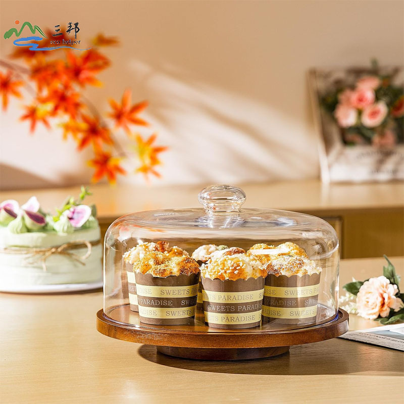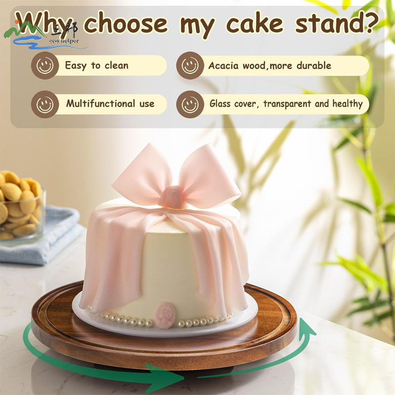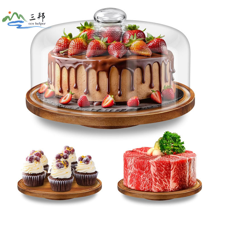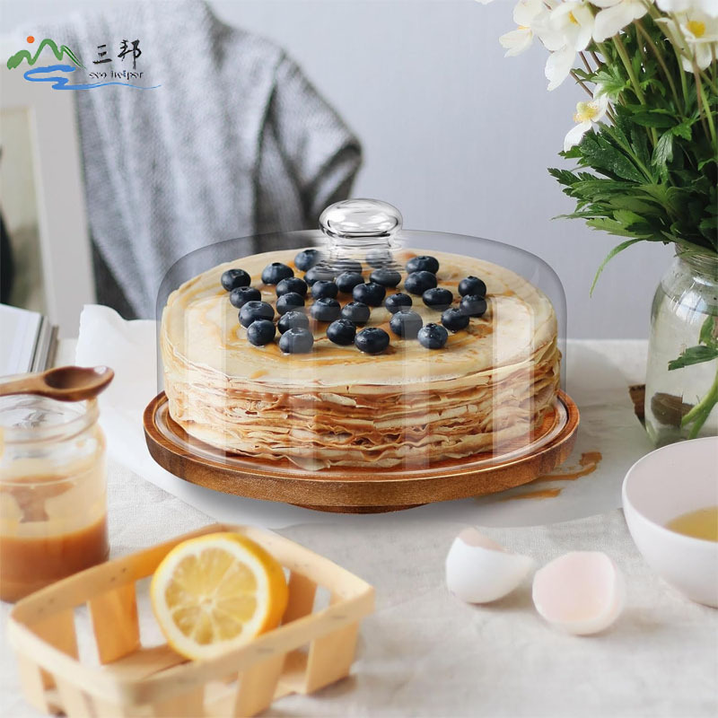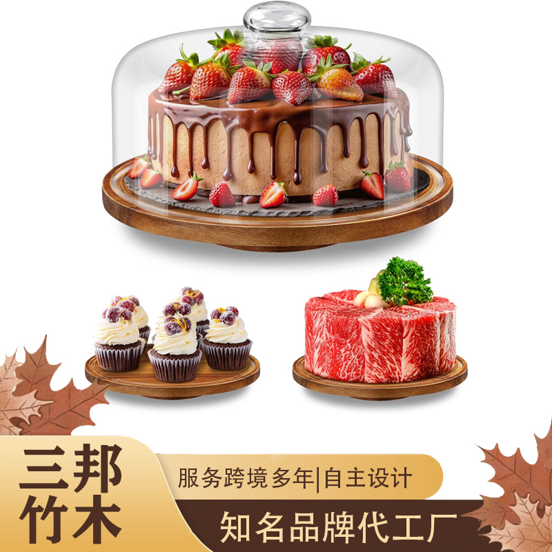 나무 케이크 트레이 단단한 나무 회전식 케이크 베이스 스탠드 유리 커버 디저트 디스플레이 트레이 국경 간 인기 판매
