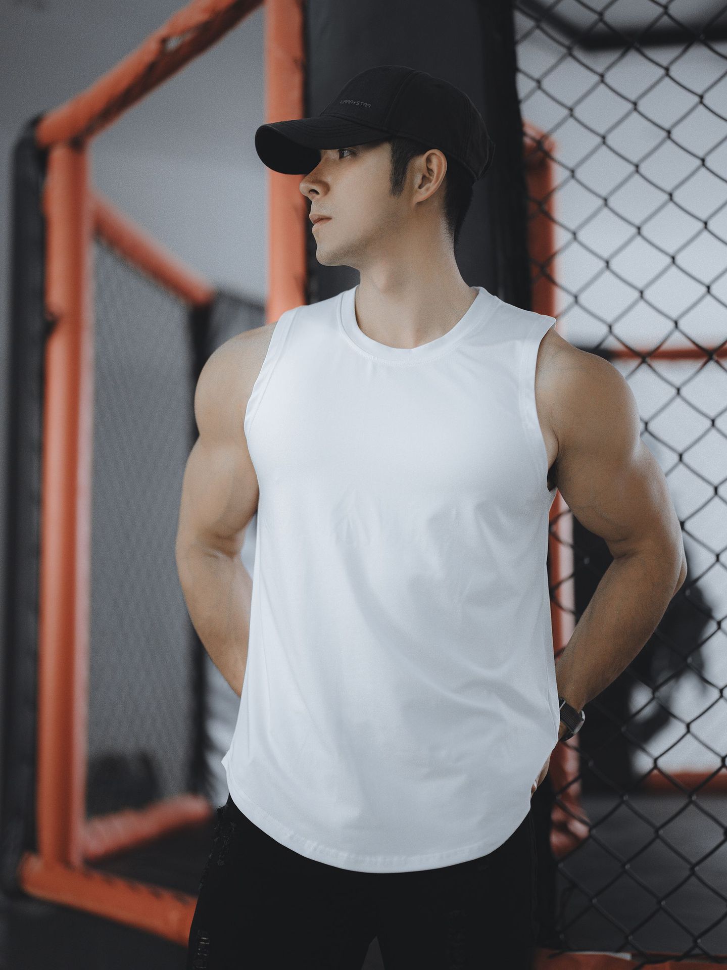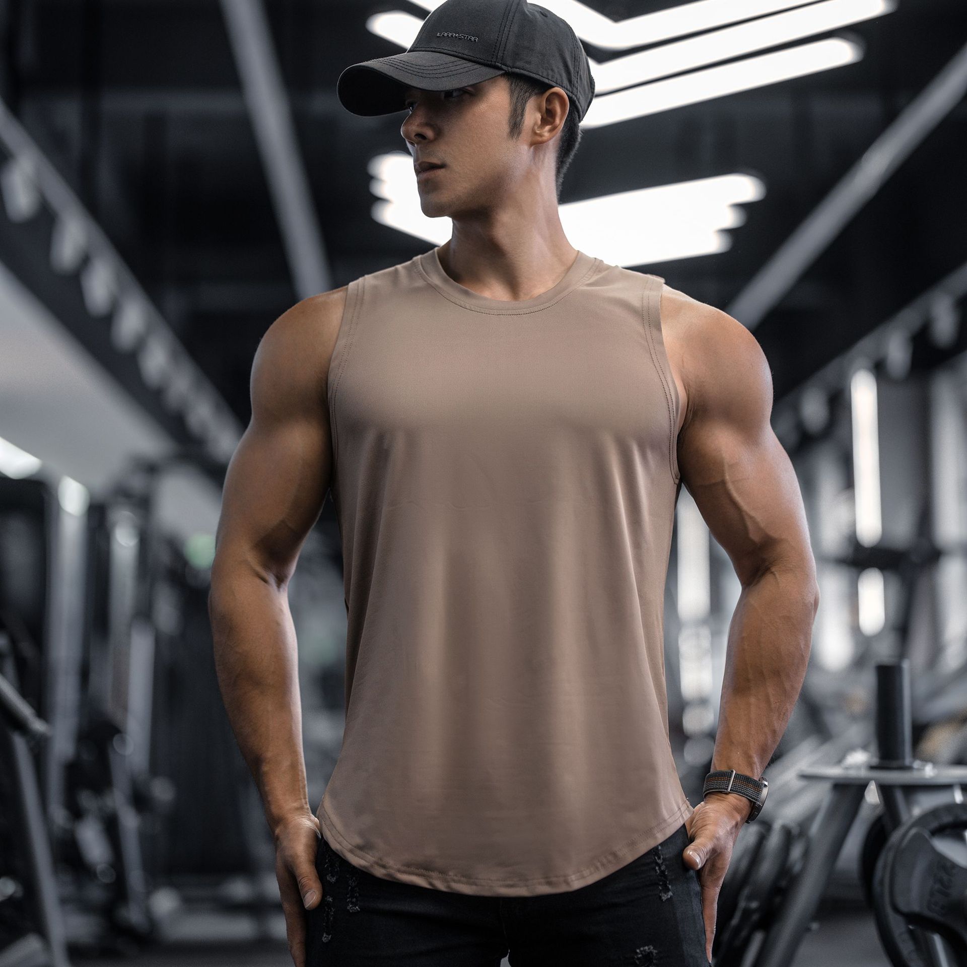 여름 새로운 근육 남성 스포츠 및 레저 달리기 피트니스 운동 탄성 속건성 솔리드 컬러 민소매 조끼 대외 무역스토어 가기