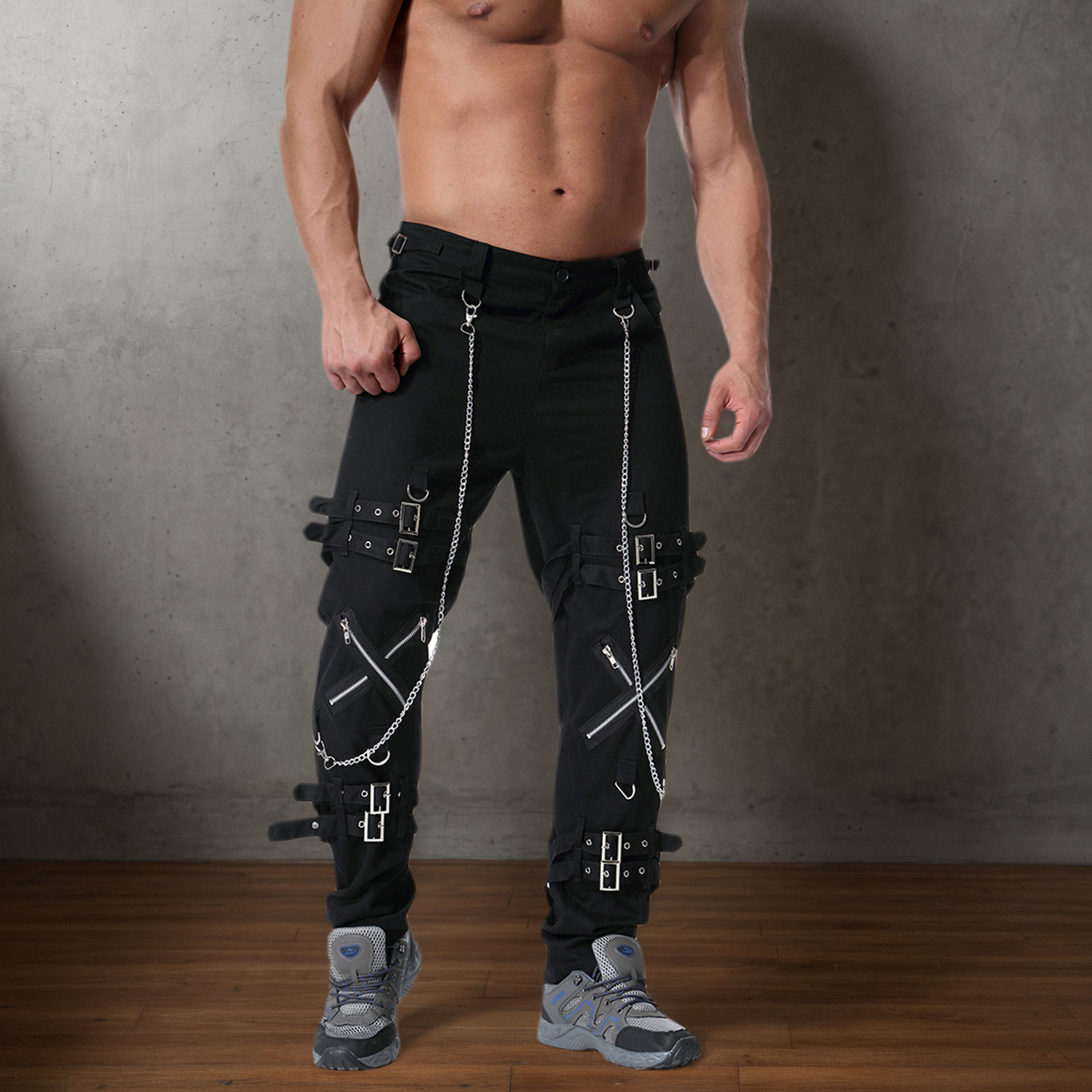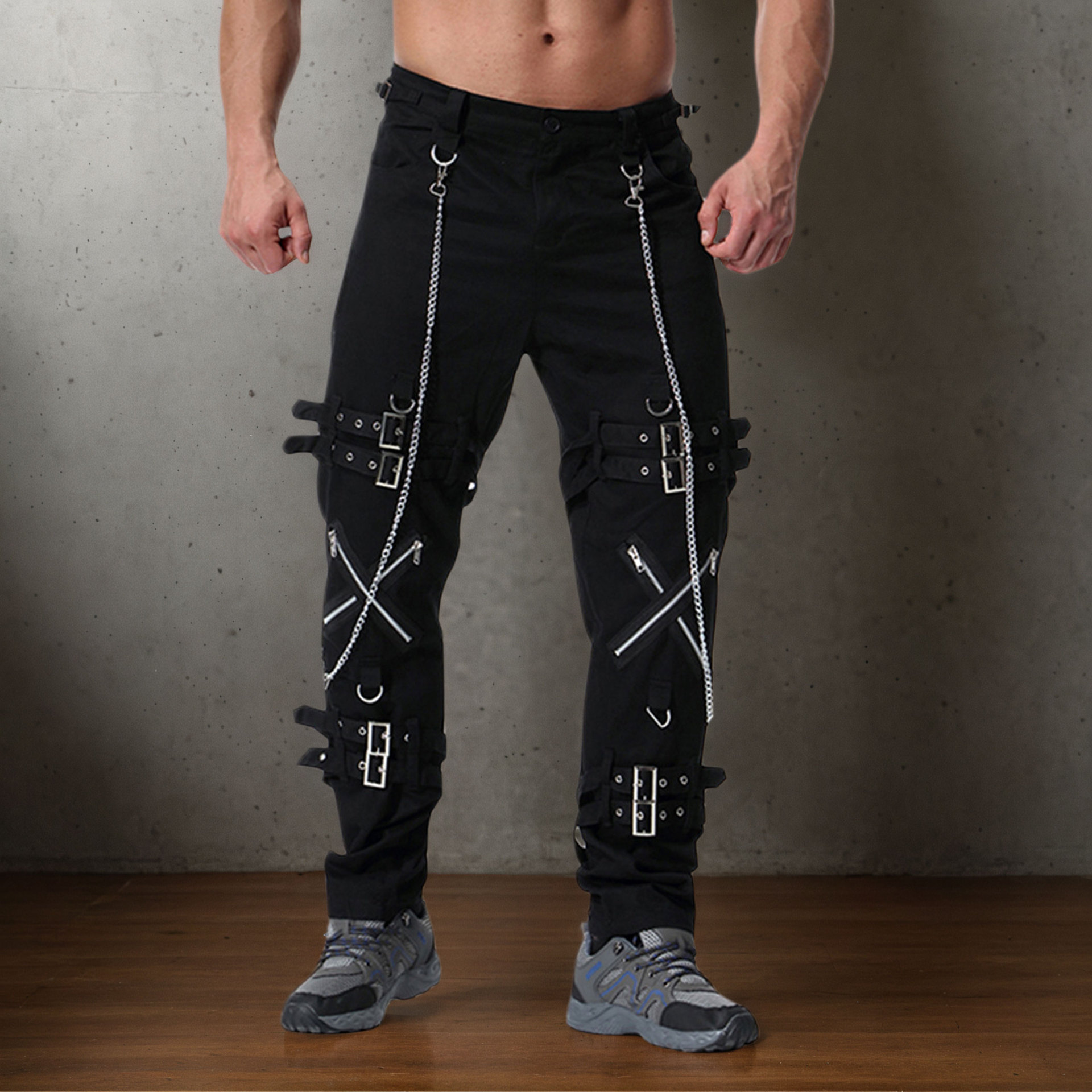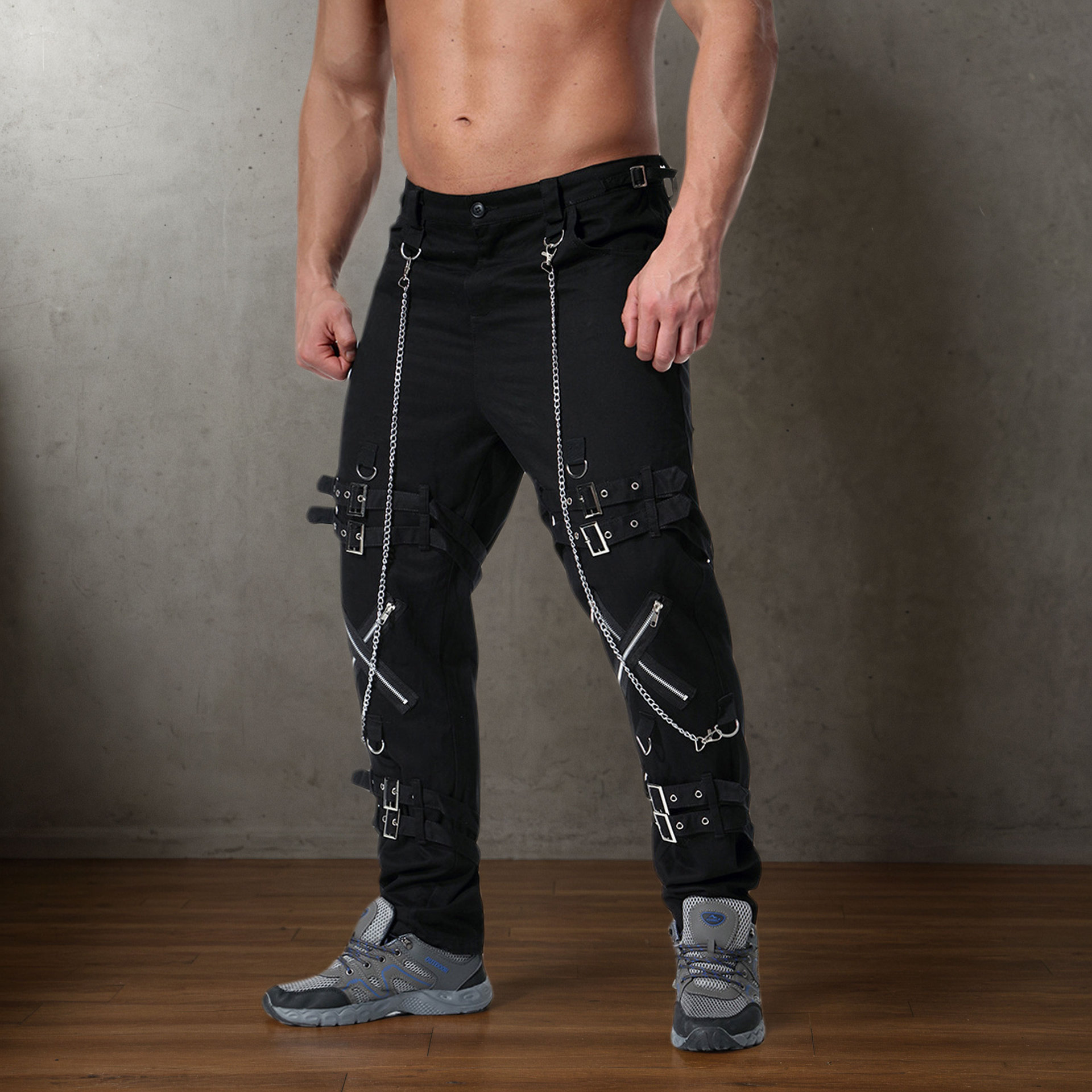 체인 장식 성격 캐주얼 바지 남자 고딕 바지 펑크 록 구멍 바지 바지 속박 청바지