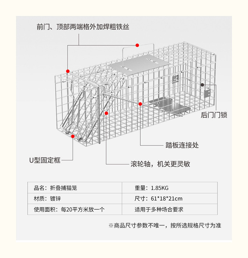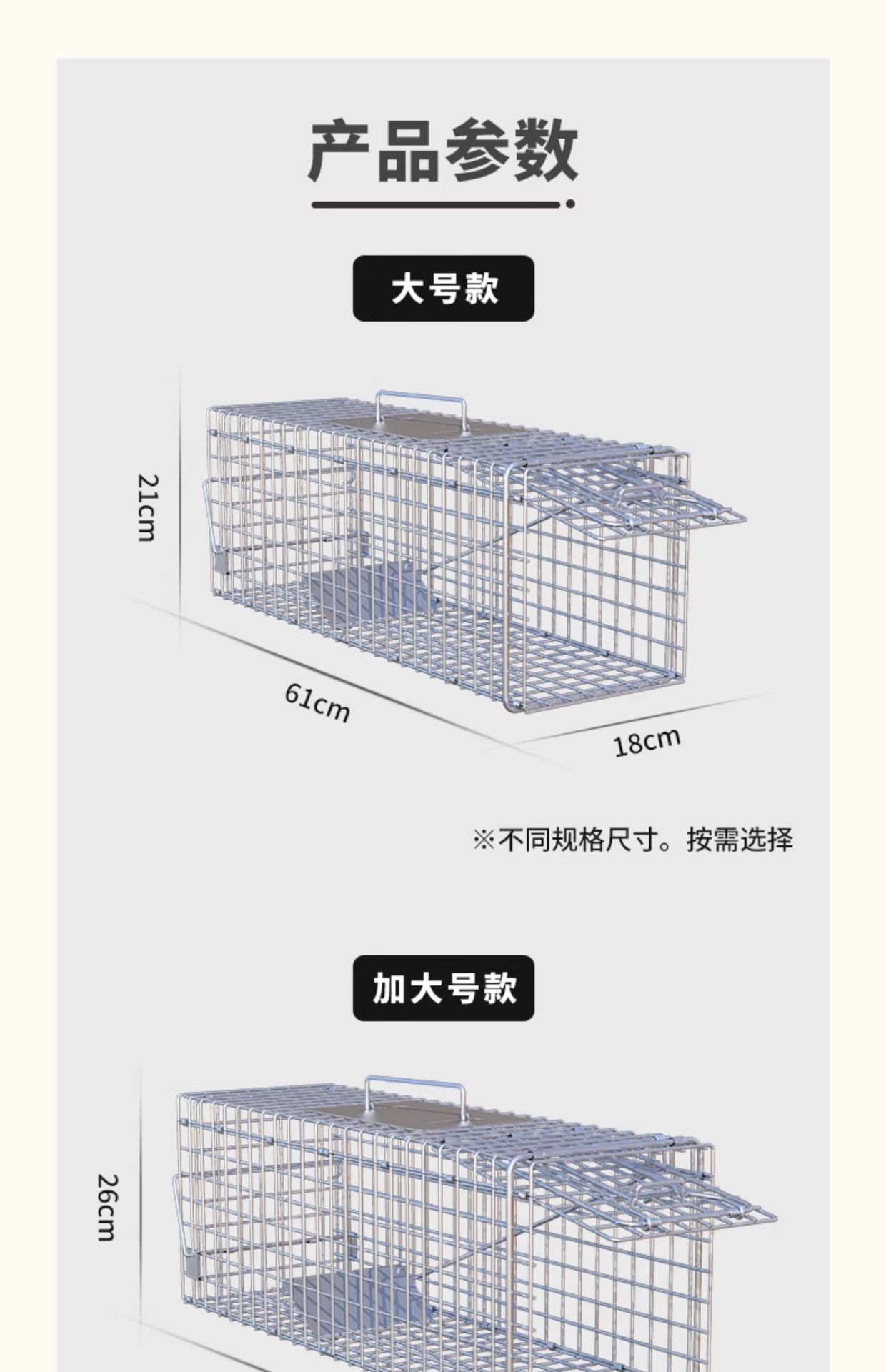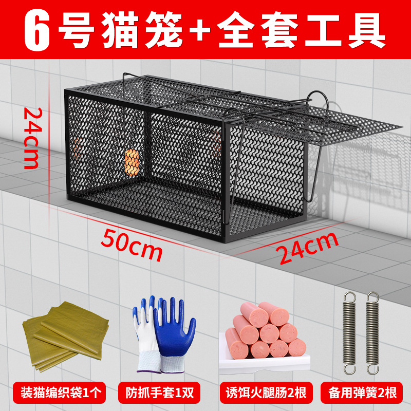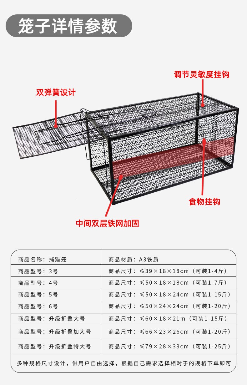 • 교활한 고양이를 잡기 위해 특별히 고안된 두꺼운 고양이 케이지(고양이 케이지 6번)는 소시지 1개 + 예비 스프링 2개를 담을 수 있습니다.