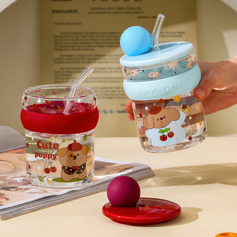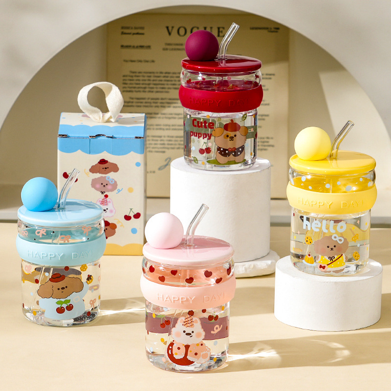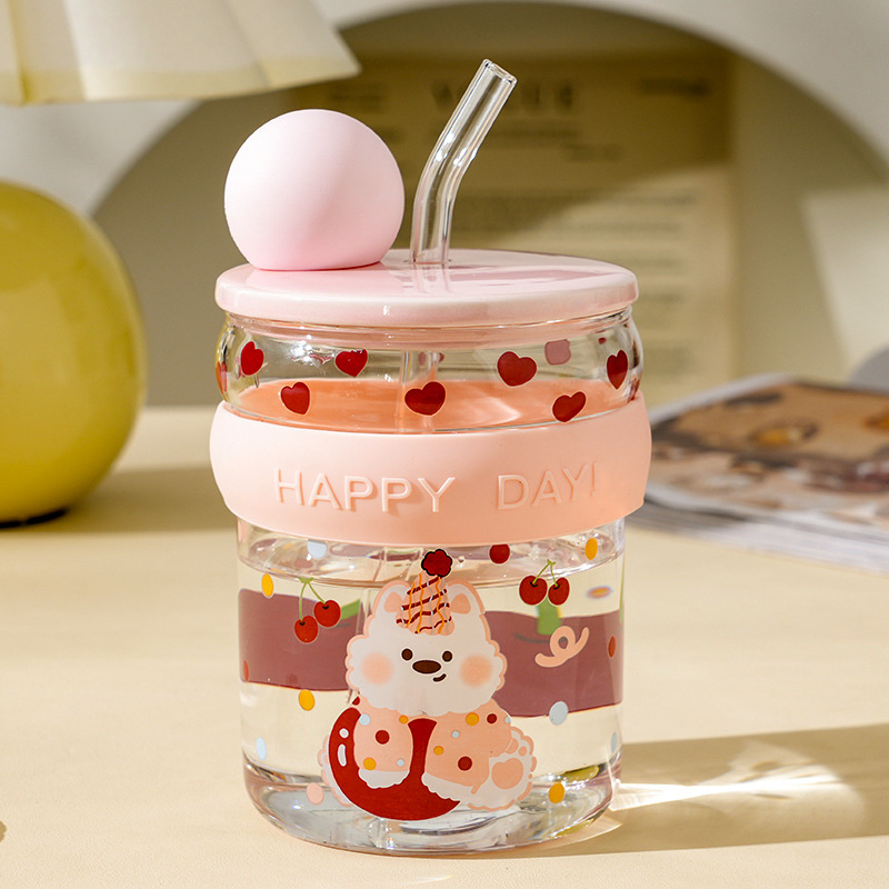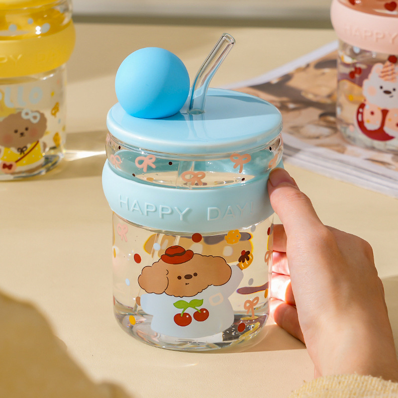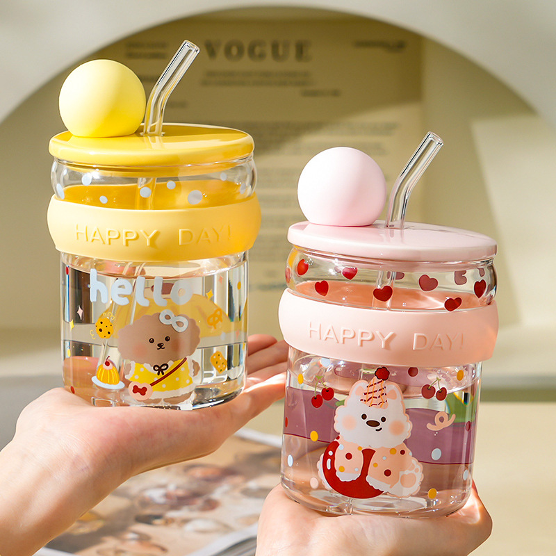 귀여운 동물 유리 새로운 고급 대용량 밀짚 컵 학생 만화 휴대용 내열 밀짚 컵