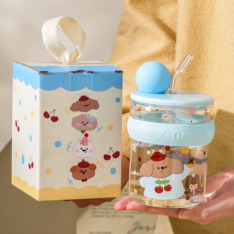 귀여운 동물 유리 새로운 고급 대용량 밀짚 컵 학생 만화 휴대용 내열 밀짚 컵스토어 가기