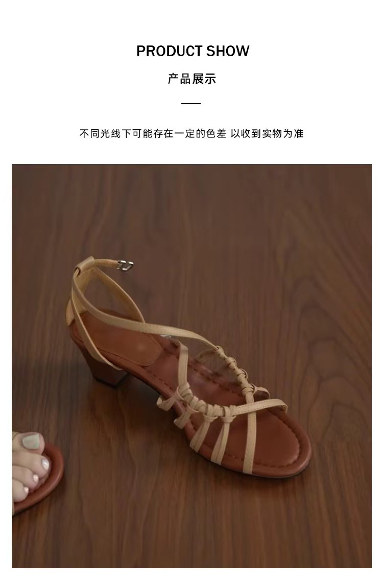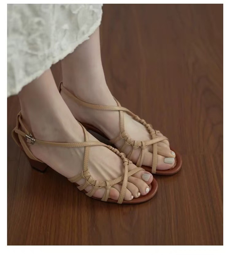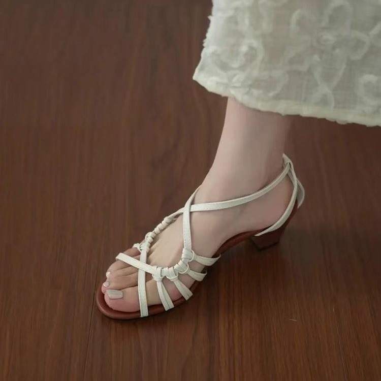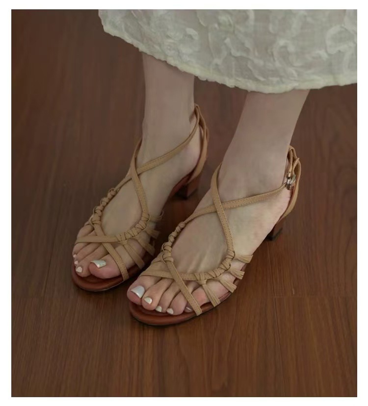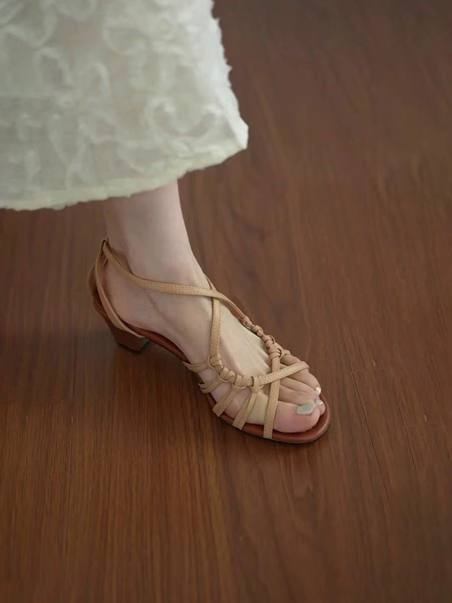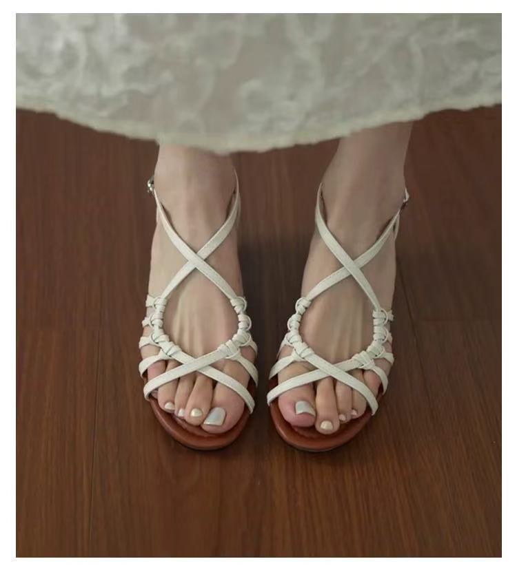 니치 버전 ~ 여름 오픈 토 기질과 스커트 샌들이 있는 여성용 손으로 짠 중공 리조트 스타일 하이힐 로마 슈즈스토어 가기